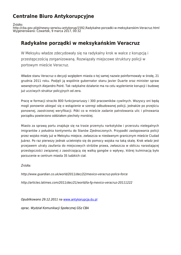 Centralne Biuro Antykorupcyjne Źródło: http://cba.gov.pl/pl/newsy-serwisu-antykorup/1592,Radykalne-porzadki-w-meksykanskim-Veracruz.html Wygenerowano: Czwartek, 9 marca 2017, 00:32 Radykalne porządki w meksykańskim Veracruz W Meksyku władze zdecydowały się na radykalny krok w walce z korupcją i przestępczością zorganizowaną. Rozwiązały miejscowe struktury policji w portowym mieście Veracruz. Władze stanu Veracruz o decyzji względem miasta o tej samej nazwie poinformowały w środę, 21 grudnia 2011 roku. Podjęli ją wspólnie gubernator stanu Javier Duarte oraz minister spraw wewnętrznych Alejandro Poiré. Tak radykalne działanie ma na celu wyplenienie korupcji i budowę już uczciwych struktur policyjnych od zera. Pracę w formacji straciło 800 funkcjonariuszy i 300 pracowników cywilnych. Wszyscy oni będą mogli ponownie ubiegać się o wstąpienie w szeregi odbudowanej policji, jednakże po przejściu ponownej, zaostrzonej weryfikacji. Póki co w mieście zadanie patrolowania ulic i pilnowania porządku powierzono oddziałom piechoty morskiej. Miasto za sprawą portu znajduje się na trasie przemytu narkotyków i przerzutu nielegalnych imigrantów z południa kontynentu do Stanów Zjednoczonych. Przypadki zastępowania policji przez wojsko miały już w Meksyku miejsce, zwłaszcza w niesławnym granicznym mieście Ciudad Juárez. Po raz pierwszy jednak ucieknięto się do pomocy wojska na taką skalę. Krok władz jest przejawem utraty zaufania do miejscowych stróżów prawa, zwłaszcza w obliczu narastającej przestępczości związanej z zaostrzającą się walką gangów o wpływy, której kulminacją było porzucenie w centrum miasta 35 ludzkich ciał. Źródła: http://www.guardian.co.uk/world/2011/dec/22/mexico-veracruz-police-force http://articles.latimes.com/2011/dec/21/world/la-fg-mexico-veracruz-20111222 Opublikowano 29.12.2011 na www.antykorupcja.du.pl oprac. Wydział Komunikacji Społecznej GSz CBA