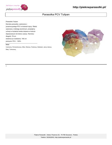 http://piekneparasolki.pl/ Parasolka PCV Tulipan Parasolka Tulipan Damska parasolka, wykonana z przeźroczystego PCV w kolorach tęczy. Stelaż wykonany z lekkiego aluminium, przepiękny uchwyt w kształcie kwiatu tulipana w kolorze dopasowanym do koloru czaszy. Wymiary: długość: 79 cm średnica po rozłożeniu: 100 cm poszycie: PCV 100% Kolor Czerwony, Pomarańczowy, Żółty, Różowy, Fioletowy, Niebieski, Jasny różowy, Biały, Turkusowy, 0 Piękne Parasolki - Adres: Pszenna 32, 70-780 Szczecin, Polska Telefon: 503022933, http://piekneparasolki.pl/ http://piekneparasolki.pl/ Piękne Parasolki - Adres: Pszenna 32, 70-780 Szczecin, Polska Telefon: 503022933, http://piekneparasolki.pl/