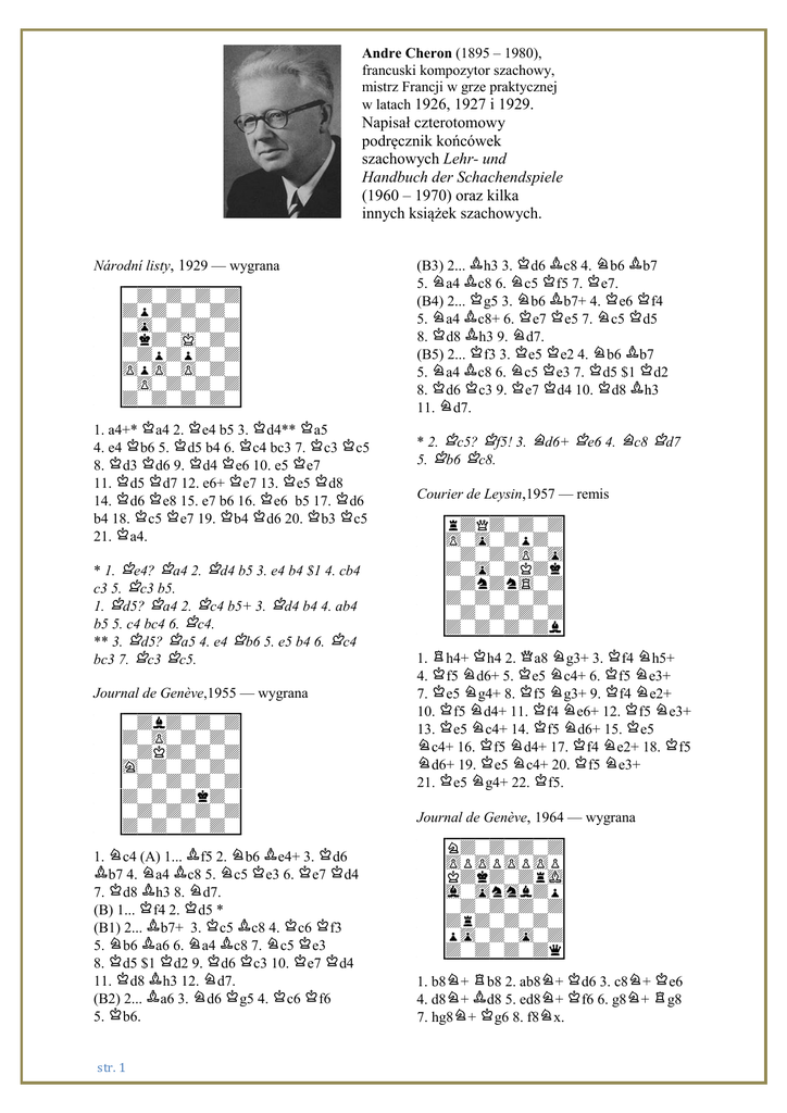 Andre Cheron (1895 – 1980), francuski kompozytor szachowy, mistrz Francji w grze praktycznej w latach 1926, 1927 i 1929. Napisał czterotomowy podręcznik końcówek szachowych Lehr- und Handbuch der Schachendspiele (1960 – 1970) oraz kilka innych książek szachowych. Národní listy, 1929 — wygrana )........*! !0 , , , ,]! 0,p, , , ]! !0 P , , ,]! 0,m, L , ]! !0 ,p,p, ,]! 0QpQ Q , ]! !0 Q , , ,]! 0, , , , ]! !\````````^! 1. a4+* la4 2. le4 b5 3. ld4** la5 4. e4 lb6 5. ld5 b4 6. lc4 bc3 7. lc3 lc5 8. ld3 ld6 9. ld4 le6 10. e5 le7 11. ld5 ld7 12. e6+ le7 13. le5 ld8 14. ld6 le8 15. e7 b6 16. le6 b5 17. ld6 b4 18. lc5 le7 19. lb4 ld6 20. lb3 lc5 21. la4. * 1. le4? la4 2. ld4 b5 3. e4 b4 $1 4. cb4 c3 5. lc3 b5. 1. ld5? la4 2. lc4 b5+ 3. ld4 b4 4. ab4 b5 5. c4 bc4 6. lc4. ** 3. ld5? la5 4. e4 lb6 5. e5 b4 6. lc4 bc3 7. lc3 lc5. Journal de Genève,1955 — wygrana )........*! !0 ,o, , ,]! 0, Q , , ]! !0 ,l, , ,]! 0I , , , ]! !0 , , , ,]! 0, , ,m, ]! !0 , , , ,]! 0, , , , ]! !\````````^! 1. ic4 (A) 1... cf5 2. ib6 ce4+ 3. ld6 cb7 4. ia4 cc8 5. ic5 le3 6. le7 ld4 7. ld8 ch3 8. id7. (B) 1... lf4 2. ld5 * (B1) 2... cb7+ 3. lc5 cc8 4. lc6 lf3 5. ib6 ca6 6. ia4 cc8 7. ic5 le3 8. ld5 $1 ld2 9. ld6 lc3 10. le7 ld4 11. ld8 ch3 12. id7. (B2) 2... ca6 3. id6 lg5 4. lc6 lf6 5. lb6. str. 1 (B3) 2... ch3 3. ld6 cc8 4. ib6 cb7 5. ia4 cc8 6. ic5 lf5 7. le7. (B4) 2... lg5 3. ib6 cb7+ 4. le6 lf4 5. ia4 cc8+ 6. le7 le5 7. ic5 ld5 8. ld8 ch3 9. id7. (B5) 2... lf3 3. le5 le2 4. ib6 cb7 5. ia4 cc8 6. ic5 le3 7. ld5 $1 ld2 8. ld6 lc3 9. le7 ld4 10. ld8 ch3 11. id7. * 2. lc5? lf5! 3. id6+ le6 4. ic8 ld7 5. lb6 lc8. Courier de Leysin,1957 — remis )........*! !0u,r, , ,]! 0Q P ,p, ]! !0 , , Q P]! 0, P ,l,m]! !0 ,k,kS ,]! 0, , , , ]! !0 , , , ,]! 0, , , ,o]! !\````````^! 1. sh4+ lh4 2. ra8 ig3+ 3. lf4 ih5+ 4. lf5 id6+ 5. le5 ic4+ 6. lf5 ie3+ 7. le5 ig4+ 8. lf5 ig3+ 9. lf4 ie2+ 10. lf5 id4+ 11. lf4 ie6+ 12. lf5 ie3+ 13. le5 ic4+ 14. lf5 id6+ 15. le5 ic4+ 16. lf5 id4+ 17. lf4 ie2+ 18. lf5 id6+ 19. le5 ic4+ 20. lf5 ie3+ 21. le5 ig4+ 22. lf5. Journal de Genève, 1964 — wygrana )........*! !0i, , , ,]! 0QqQqQqQq]! !0l,m, ,uC]! 0O PkKo,p]! !0 , , , ,]! 0,u, , , ]! !0pP , P ,]! 0, , , ,x]! !\````````^! 1. b8i+ sb8 2. ab8i+ ld6 3. c8i+ le6 4. d8i+ cd8 5. ed8i+ lf6 6. g8i+ sg8 7. hg8i+ lg6 8. f8ix.