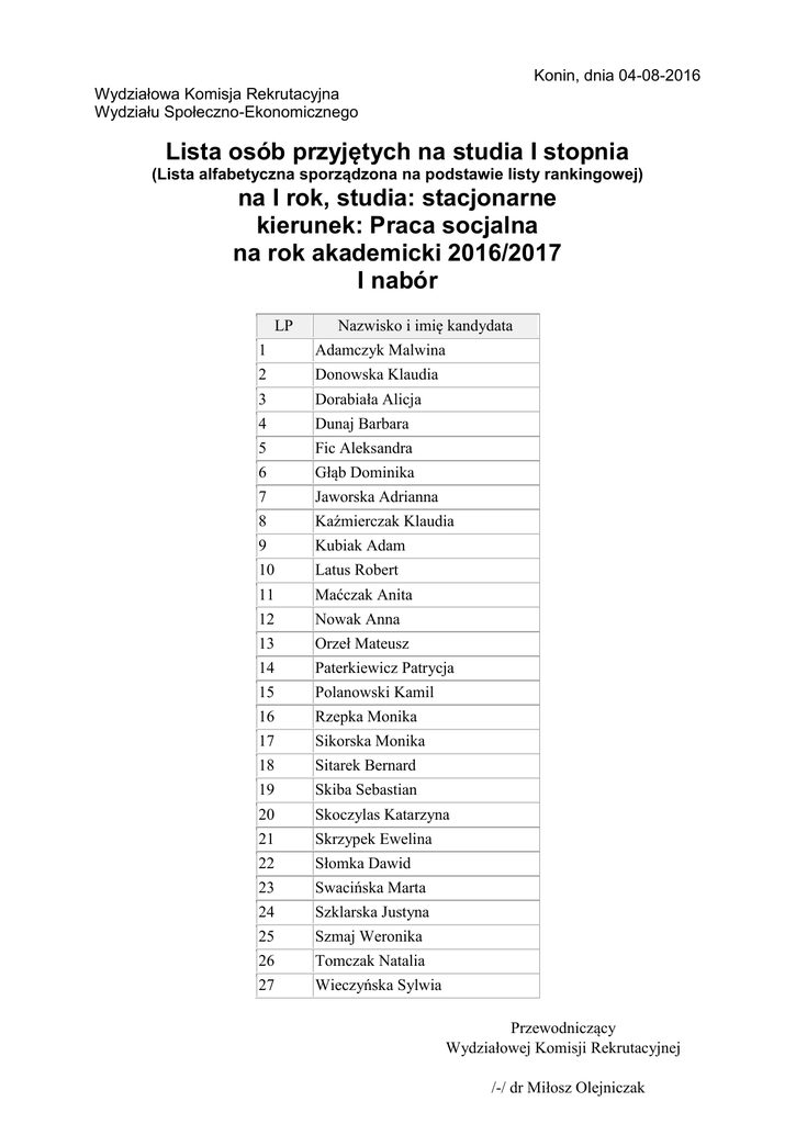 Konin, dnia 04-08-2016 Wydziałowa Komisja Rekrutacyjna Wydziału Społeczno-Ekonomicznego Lista osób przyjętych na studia I stopnia (Lista alfabetyczna sporządzona na podstawie listy rankingowej) na I rok, studia: stacjonarne kierunek: Praca socjalna na rok akademicki 2016/2017 I nabór LP Nazwisko i imię kandydata 1 Adamczyk Malwina 2 Donowska Klaudia 3 Dorabiała Alicja 4 Dunaj Barbara 5 Fic Aleksandra 6 Głąb Dominika 7 Jaworska Adrianna 8 Kaźmierczak Klaudia 9 Kubiak Adam 10 Latus Robert 11 Maćczak Anita 12 Nowak Anna 13 Orzeł Mateusz 14 Paterkiewicz Patrycja 15 Polanowski Kamil 16 Rzepka Monika 17 Sikorska Monika 18 Sitarek Bernard 19 Skiba Sebastian 20 Skoczylas Katarzyna 21 Skrzypek Ewelina 22 Słomka Dawid 23 Swacińska Marta 24 Szklarska Justyna 25 Szmaj Weronika 26 Tomczak Natalia 27 Wieczyńska Sylwia Przewodniczący Wydziałowej Komisji Rekrutacyjnej /-/ dr Miłosz Olejniczak UWAGA Osoba przyjęta na studia jest zobowiązana niezwłocznie zgłosić się do Katedry Pedagogiki i Pracy Socjalnej, ul. Popiełuszki 4, pok. 9, w godz. 7:00-15:00 po odbiór decyzji o przyjęciu na studia oraz dostarczyć dwa egzemplarze podpisanej umowy o warunkach odpłatności za studia stacjonarne lub świadczone usługi edukacyjne przez PWSZ w Koninie. Każda strona umowy powinna być zaparafowana przez osobę przyjętą na studia. Druki do pobrania ze strony internetowej Uczelni www.pwsz.konin.edu.pl (dział "Rekrutacja", zakładka "dokumenty do pobrania dla osób przyjętych") INFORMACJA dot. Elektronicznej Legitymacji Studenckiej Ponadto osoba przyjęta na studia dokonuje opłaty za ELS - elektroniczną Legitymację Studencką w wysokości 17 zł. Ponownej opłaty za ELS nie uiszczają absolwenci PWSZ w Koninie przyjęci na studia II stopnia na kierunek "filologia" - posiadający elektroniczną legitymację studencką otrzymaną na studiach I stopnia w PWSZ w Koninie. Wpłaty za ELS należy dokonać na konto PWSZ w Koninie: Bank Zachodni WBK S.A. 3 Oddział w Koninie 22150014611214600147750000 (podając: nazwisko i imię, kierunek studiów, z dopiskiem "opłata za ELS") Potwierdzenie uiszczenia opłaty należy dostarczyć wraz z umowami o warunkach odpłatności do sekretarza właściwej komisji rekrutacyjnej na kierunek, o której mowa powyżej. Legitymacje będą wydawane od 3 października 2016 r. w Centrum Obsługi Studenta (pok. nr 6) przy ul. Przyjaźni 1. Osoba przyjęta na studia, która nie dostarczy ww. dokumentów (rezygnuje z nauki w PWSZ w Koninie przed 1.X.2016r.) jest zobowiązana do dostarczenia do sekretarza właściwej komisji rekrutacyjnej, o którym mowa powyżej pisemnego oświadczenia o rezygnacji ze studiów.