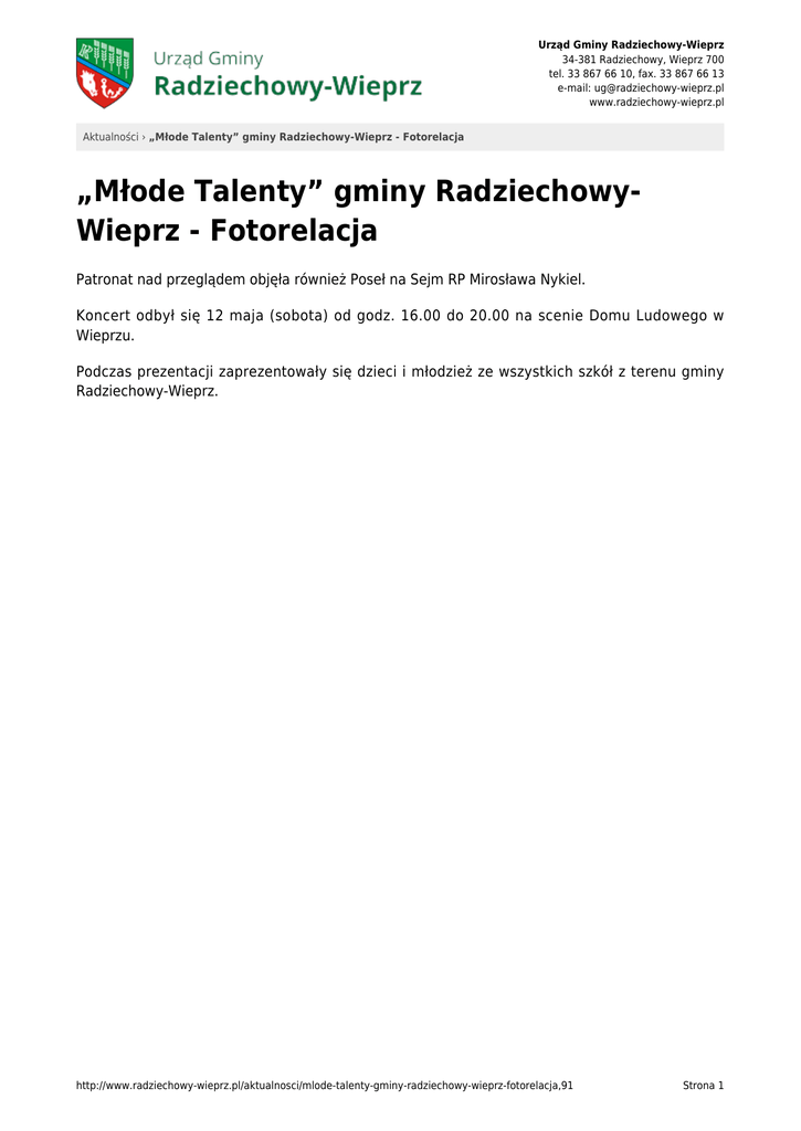 Urząd Gminy Radziechowy-Wieprz 34-381 Radziechowy, Wieprz 700 tel. 33 867 66 10, fax. 33 867 66 13 e-mail: [email protected] www.radziechowy-wieprz.pl Aktualności › „Młode Talenty” gminy Radziechowy-Wieprz - Fotorelacja „Młode Talenty” gminy RadziechowyWieprz - Fotorelacja Patronat nad przeglądem objęła również Poseł na Sejm RP Mirosława Nykiel. Koncert odbył się 12 maja (sobota) od godz. 16.00 do 20.00 na scenie Domu Ludowego w Wieprzu. Podczas prezentacji zaprezentowały się dzieci i młodzież ze wszystkich szkół z terenu gminy Radziechowy-Wieprz. http://www.radziechowy-wieprz.pl/aktualnosci/mlode-talenty-gminy-radziechowy-wieprz-fotorelacja,91 Strona 1