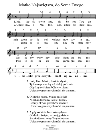 Matko Najświętsza, do Serca Twego d &b c ˙ A4 œ A ˙ œ d ˙ &b ˙ A d œ œ F g ˙ ˙ mie - czem bo - le - ści i gdzie ra - tu - nku D & b .. ˙ B œ b ˙ D7 œ F ˙ Wo - ła - my wszy - scy Two - je - go lu - du d &b ˙ A œ d œ F ˙ g ˙ U - cie - czko grze - sznych, œ ˙ 1. Ma - tko Na - jświę - tsza, Ma - tko, 2. Gdzie my, o d g F d œ C ˙ ˙ do Se - rca Twe - go ach, gdzie pó - jdzie - my, A4 A ˙ œ œ g d ˙ ˙ wskroś prze - szy - te - go. szu - kać bę - dzie - my? g ˙ A œ F C ˙ œ ˙ z ję - kiem, ze łza - mi: nie gardź pro - śba - mi: A4 ˙ A œ œ módl się za g d ˙ ˙ na - mi. 3. Imię Twe, Mario, litością słynie; Tyś nam pociechą w każdej godzinie. Gdyśmy ściśnieni bólu cierniami: Ucieczko grzesznych módl się za nami. 4. O Matko nasza, Matko miłości! Niechaj doznamyTwojej litości, Bośmy okryci grzechów ranami: Ucieczko grzesznych módl się za nami. 5. A gdy ostatnia łza z oka spłynie, O Matko święta, w onej godzinie Zamknij nam oczy Twymi rękami: Ucieczko grzesznych módl się za nami. MSZA ŚWIĘTA PIEŚNI WIARA / SIGISMUNDUS ..