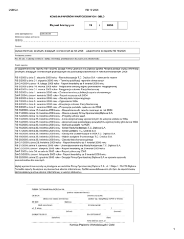 DEBICA RB 19 2006 KOMISJA PAPIERÓW WARTOŚCIOWYCH I GIEŁD Raport bieżący nr 19 / 2006 2006-06-08 Data sporządzenia: Skróc ona nazwa emitenta DEBICA Temat Wykaz informacji poufnych, bieżących i okresowych za rok 2005 - uzupełnienie do raportu RB 18/2006 Podstawa prawna Treść raportu: W uzupełnieniu do raportu RB 18/2006 Zarząd Firmy Oponiarskiej Dębica Spółka Akcyjna podaje wykaz informacji poufnych, bieżących i okresowych przekazanych do publicznej wiadomości w roku kalendarzowym 2005 RB 1/2005 z dnia 7. stycznia 2005 roku - Restrukturyzacja T.C. Dębica S.A. - utworzenie rezerw RB 2/2005 z dnia 31. stycznia 2005 roku - Terminy publikacji raportów okresowych SA-Q 4/2004 z dnia 14. lutego 2005 roku - Raport kwartalny za 4 kwartał 2005 roku RB 3/2005 z dnia 16. marca 2005 roku - Podpisanie umowy najmu powierzchni magazynowej RB 4/2005 z dnia 31. marca 2005 roku - Rezygnacja członka Rady Nadzorczej RB 5/2005 z dnia 1. kwietnia 2005 roku - Zmiana terminu publikacji raportu okresowego SA-R 2004 z dnia 4. kwietnia 2005 roku - Raport roczny za rok 2004 RB 6/2005 z dnia 4. kwietnia 2005 roku - Zasady ładu korporacyjnego RB 7/2005 z dnia 5. kwietnia 2005 roku - Ogłoszenie WZA RB 8/2005 z dnia 6. kwietnia 2005 roku - Kooptacja czlonka Rady Nadzorczej RB 9/2005 z dnia 7. kwietnia 2005 roku - Propozycja podziału zysku za rok 2004 RB 10/2005 z dnia 15. kwietnia 2005 roku - Uzupełnienie do raportu rocznego za rok 2004 RB 11/2005 z dnia 19. kwietnia 2005 roku - Ocena sytuacji Firmy Oponiarskiej Dębica S.A. RB 12/2005 z dnia 19. kwietnia 2005 roku - Projekty uchwał WZA RB 13/2005 z dnia 25. kwietnia 2005 roku - Lista akcjonariuszy uprawnionych do wzięcia udziału w WZA RB 14/2005 z dnia 28. kwietnia 2005 roku - Akcjonariusze posiadający powyżej 5% ogólnej liczby głosów na WZA RB 15/2005 z dnia 28. kwietnia 2005 roku - Uchwały podjęte na WZA RB 16/2005 z dnia 28. kwietnia 2005 roku - Skład Rady Nadzorczej T.C. Dębica S.A. RB 17/2005 z dnia 28. kwietnia 2005 roku - Skład Zarządu T.C. Dębica S.A. RB 18/2005 z dnia 28. kwietnia 2005 roku - Osoby nie uczestniczące w WZA T.C. Dębica S.A. RB 19/2005 z dnia 28. kwietnia 2005 roku - Wybór audytora finansowego T.C. Debica S.A. RB 20/2005 z dnia 28. kwietnia 2005 roku - Zasady ładu korporacyjnego SA-Q 1/2005 z dnia 28. kwietnia 2005 roku - Raport kwartalny za 1 kwartał 2005 roku RB 21/2005 z dnia 3. czerwca 2005 roku - Ukonstytuowanie się Rady Nadzorczej T.C. Dębica S.A. SA-Q 2/2005 z dnia 4. sierpnia 2005 roku - Raport kwartalny za 2 kwartał 2005 roku SA-P 2005 z dnia 30. września 2005 roku - Raport półroczny 2005 SA-Q 3/2005 z dnia 4. listopada 2005 roku - Raport kwartalny za 3 kwartał 2005 roku RB 22/2005 z dnia 20. grudnia 2005 roku - Decyzja Firmy Oponiarskiej Dębica S.A. w sprawie opon do samochodów dostawczych Wyżej wymienione raporty są dostępne w siedzibie Firmy Oponiarskiej Dębica S.A., ul. 1 Maja 1, 39-200 Dębica. Ponadto raporty dostępne są również na stronie internetowej Spółki www.debica.com.pl z tym, że raport roczny zamieszczony jest na stronie internetowej w wersji skróconej. FIRMA OPONIARSKA DĘBICA SA (pełna nazwa emitenta) DEBICA Chemic zny (c he) (skróc ona nazwa emitenta) 39-200 (sektor wg. klasyfikac ji GPW w W-wie) Dębic a (kod poc ztowy) (miejsc owość ) ul. 1 Maja 1 (ulic a) (014) 670-28-31 (numer) 014 670-09-57 (telefon) (fax) www.debic a.c om.pl Komisja Papierów Wartościowych i Giełd 1 DEBICA RB 19 2006 (e-mail) (www) 872-000-34-04 850004505 (NIP) (REGON) PODPISY OSÓB REPREZENTUJĄCYCH SPÓŁKĘ Data Imię i Nazwisko Stanowisko/Funkc ja 2006-06-08 Leszek Cic hoc ki Członek Zarządu/Dyrektor ds. Finansowyc h 2006-06-08 Leszek Szafran Członek Zarządu/Dyrektor ds. Handlowyc h Podpis Komisja Papierów Wartościowych i Giełd 2