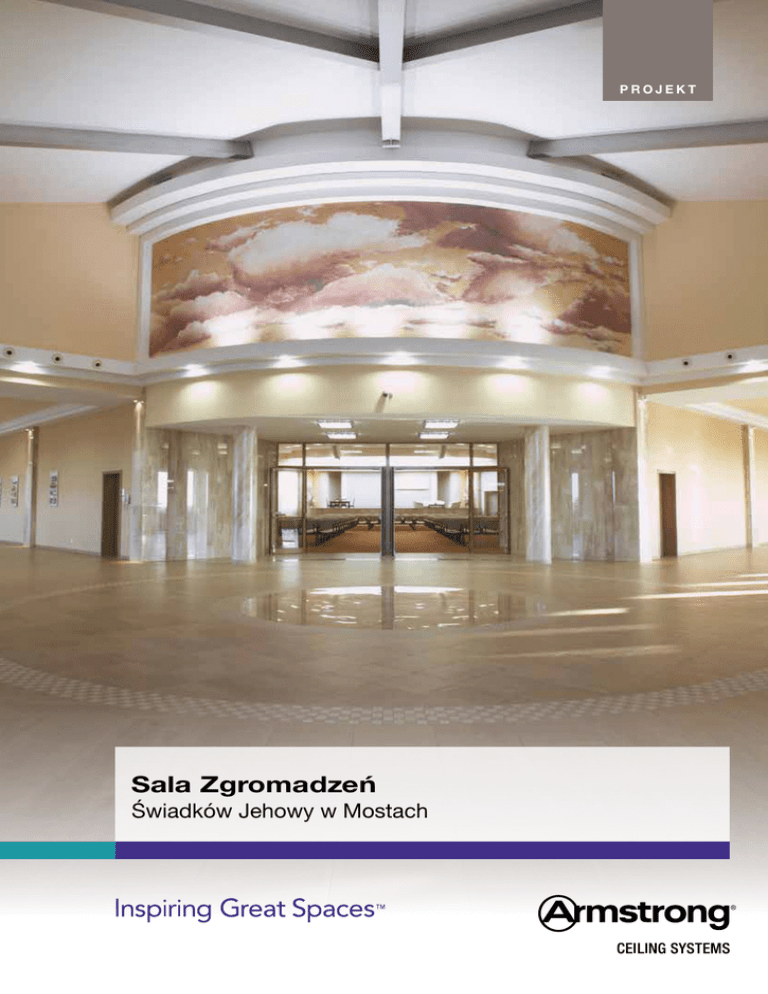 PROJEKT Sala Zgromadzeń Świadków Jehowy w Mostach Opis Długie płyty Ultima Planks okazały się strzałem w dziesiątkę pod względem akustycznym. Optymalnie dobrane połączenie parametrów dźwiękoizolacyjności i pochłaniania dźwięku dało następujący efekt - głos prelegenta jest dobrze słyszany i jednocześnie nie jest zniekształcony przez nadmierny pogłos nawet w odległych częściach pomieszczenia, zaś tło akustyczne, hałasy ze strony audytorium są skutecznie tłumione. Większym problemem był montaż płyt i zakończenie sufitu podwieszanego po okręgu tak, aby odwzorować układ pomieszczenia. Firma Armstrong wykazała się dużą elastycznością i wyprodukowała specjalne wygięte profile Axiom - idealnie dostosowane do kształtu Sali Zgromadzeń w Mostach. Harmonia wizualna i komfort akustyczny Właściciel Towarzystwo Biblijne i Traktatowe STRAŻNICA Nowy budynek Architekt Towarzystwo Biblijne i Traktatowe STRAŻNICA W sali zgromadzeń religijnych ważne jest, aby wnętrze stanowiło harmonijną całość i nie rozpraszało swoim wystrojem przebywających tam osób. Architektowi zależało na zachowaniu identycznego układu siedzień, podłogi i sufitów tak, aby wnętrze pozostawało „otwarte” na mówcę. Istotnym czynnikiem było też osiągnięcie komfortu akustycznego - niestety większość zastosowanych we wnętrzu materiałów było twardych, odbijających dźwięk. W tak dużej sali konieczne było zastosowanie nagłośnienia a zatem zminimalizowanie dźwiękow odbitych od twardych powierzchni. Celem architekta było osiągnięcie takiego środowiska akustycznego wnętrza, które pozwoliłoby na dobrą słyszalność prelegenta przez wszystkich zgromadzonych, unikając równocześnie hałasu w tle i minimalizując czasu pogłosu. Firma wykonawcza Towarzystwo Biblijne i Traktatowe STRAŻNICA Powierzchnia 1916 m2 Produkt ULTIMA+ planks & AXIOM curved ULTIMA+ Planks Więcej znajdziesz w Galerii Projektów Armstrong Building Products BV Sp. z o.o. Oddział w Polsce ul. Domaniewska 37 02-672 Warszawa Polska Tel. (+48) 22 337 86 10/11 Fax (+48) 22 337 86 12 [email protected] www.armstrongsufity.pl 12/2015 - PX1303 - © Szymon Polański - Armstrong Building Products - RCS Besançon B 784 131 575 AXIOM Curved