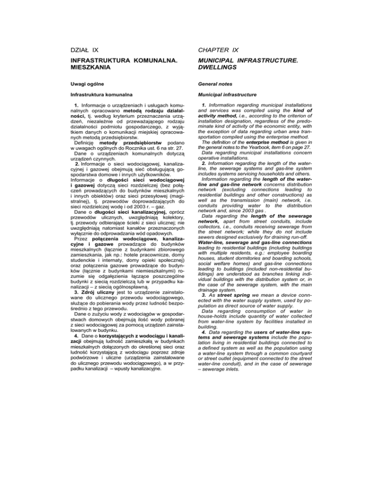 DZIAŁ IX CHAPTER IX INFRASTRUKTURA KOMUNALNA. MIESZKANIA MUNICIPAL INFRASTRUCTURE. DWELLINGS Uwagi ogólne General notes Infrastruktura komunalna Municipal infrastructure 1. Informacje o urządzeniach i usługach komunalnych opracowano metodą rodzaju działalności, tj. według kryterium przeznaczenia urządzeń, niezależnie od przeważającego rodzaju działalności podmiotu gospodarczego, z wyjątkiem danych o komunikacji miejskiej opracowanych metodą przedsiębiorstw. Definicję metody przedsiębiorstw podano w uwagach ogólnych do Rocznika ust. 6 na str. 27. Dane o urządzeniach komunalnych dotyczą urządzeń czynnych. 2. Informacje o sieci wodociągowej, kanalizacyjnej i gazowej obejmują sieć obsługującą gospodarstwa domowe i innych użytkowników. Informacje o długości sieci wodociągowej i gazowej dotyczą sieci rozdzielczej (bez połączeń prowadzących do budynków mieszkalnych i innych obiektów) oraz sieci przesyłowej (magistralnej), tj. przewodów doprowadzających do sieci rozdzielczej wodę i od 2003 r. – gaz. Dane o długości sieci kanalizacyjnej, oprócz przewodów ulicznych, uwzględniają kolektory, tj. przewody odbierające ścieki z sieci ulicznej; nie uwzględniają natomiast kanałów przeznaczonych wyłącznie do odprowadzania wód opadowych. Przez połączenia wodociągowe, kanalizacyjne i gazowe prowadzące do budynków mieszkalnych (łącznie z budynkami zbiorowego zamieszkania, jak np.: hotele pracownicze, domy studenckie i internaty, domy opieki społecznej) oraz połączenia gazowe prowadzące do budynków (łącznie z budynkami niemieszkalnymi) rozumie się odgałęzienia łączące poszczególne budynki z siecią rozdzielczą lub w przypadku kanalizacji – z siecią ogólnospławną. 3. Zdrój uliczny jest to urządzenie zainstalowane do ulicznego przewodu wodociągowego, służące do pobierania wody przez ludność bezpośrednio z tego przewodu. Dane o zużyciu wody z wodociągów w gospodarstwach domowych obejmują ilość wody pobranej z sieci wodociągowej za pomocą urządzeń zainstalowanych w budynku. 4. Dane o korzystających z wodociągu i kanalizacji obejmują ludność zamieszkałą w budynkach mieszkalnych dołączonych do określonej sieci oraz ludność korzystającą z wodociągu poprzez zdroje podwórzowe i uliczne (urządzenia zainstalowane do ulicznego przewodu wodociągowego), a w przypadku kanalizacji – wpusty kanalizacyjne. 1. Information regarding municipal installations and services was compiled using the kind of activity method, i.e., according to the criterion of installation designation, regardless of the predominate kind of activity of the economic entity, with the exception of data regarding urban area transportation compiled using the enterprise method. The definition of the enterprise method is given in the general notes to the Yearbook, item 6 on page 27. Data regarding municipal installations concern operative installations. 2. Information regarding the length of the waterline, the sewerage systems and gas-line system includes systems servicing households and others. Information regarding the length of the waterline and gas-line network concerns distribution network (excluding connections leading to residential buildings and other constructions) as well as the transmission (main) network, i.e. conduits providing water to the distribution network and, since 2003 gas . Data regarding the length of the sewerage network, apart from street conduits, include collectors, i.e., conduits receiving sewerage from the street network; while they do not include sewers designed exclusively for draining run-off. Water-line, sewerage and gas-line connections leading to residential buildings (including buildings with multiple residents, e.g.: employee boarding houses, student dormitories and boarding schools, social welfare homes) and gas-line connections leading to buildings (included non-residential buildings) are understood as branches linking individual buildings with the distribution system or, in the case of the sewerage system, with the main drainage system. 3. As street spring we mean a device connected with the water supply system, used by population as direct source of water supply. Data regarding consumption of water in house-holds include quantity of water collected from water-line system by facilities installed in building. 4. Data regarding the users of water-line systems and sewerage systems include the population living in residential buildings connected to a defined system as well as the population using a water-line system through a common courtyard or street outlet (equipment connected to the street water-line conduit), and in the case of sewerage – sewerage inlets. 190 Dane o korzystających i odbiorcach gazu dotyczą ludności w mieszkaniach wyposażonych w instalacje gazu z sieci. Dane o ludności korzystającej z wodociągu, kanalizacji i gazu obejmują również ludność w budynkach zbiorowego zamieszkania. 5. Dane o liczbie odbiorców i zużyciu energii elektrycznej od 2005 r. obejmują gospodarstwa domowe, których głównym źródłem utrzymania jest dochód z użytkowanego gospodarstwa indywidualnego w rolnictwie. Dane o zużyciu gazu odnoszą się do wszystkich gospodarstw domowych. Zużycie energii elektrycznej i gazu z sieci w gospodarstwach domowych (w tym również zużycie w gospodarstwach domowych prowadzących drobną działalność usługową) ustala się na podstawie zaliczkowego systemu opłat. 6. Informacje z zakresu ciepłownictwa obejmują budynki mieszkalne oraz urzędy i instytucje ogrzewane centralnie za pośrednictwem sieci przesyłowej rozumianej jako układ instalacji połączonych i współpracujących ze sobą, służące do przesyłania i dystrybucji czynnika grzejnego do odbiorcy zgodnie z ustawą z dnia 10 IV 1997 r. Prawo energetyczne (Dz. U. Nr 54, poz. 348) z późniejszymi zmianami. Dane w tabl. 4(119) dotyczą budynków i lokali ogrzewanych przy pomocy urządzeń