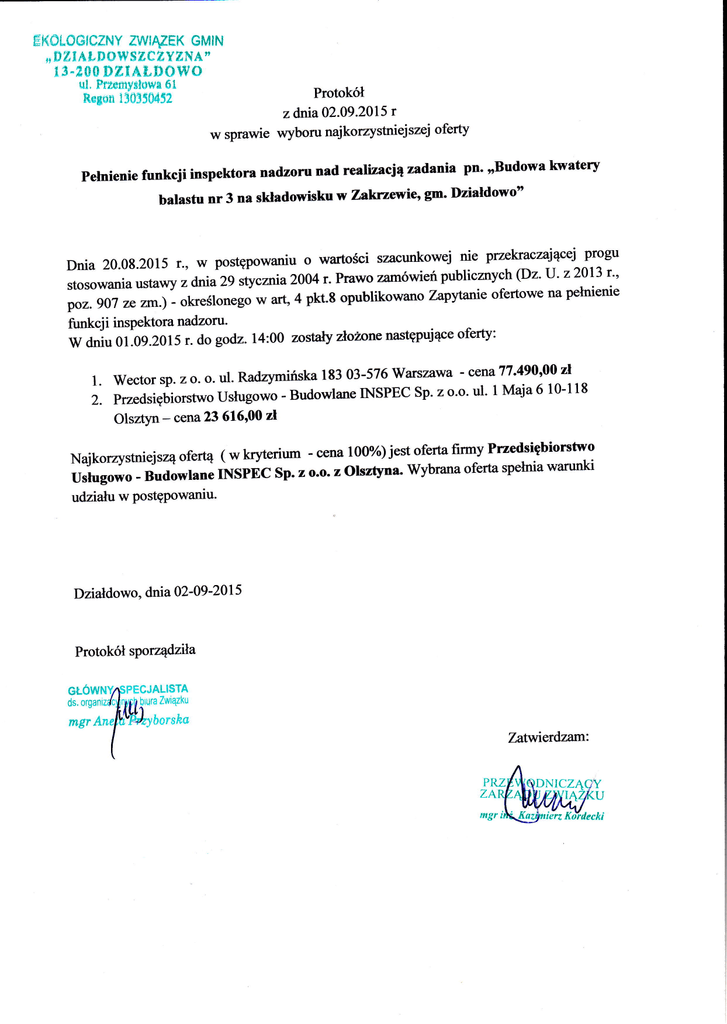 olsztyna, Wybrana oferta spełnia waruŃi