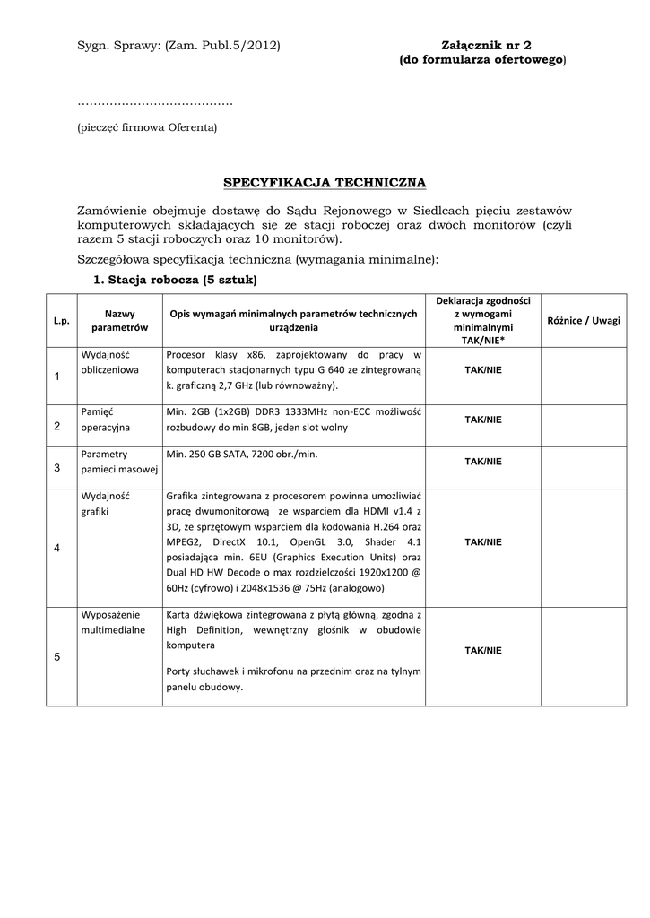 Sygn. Sprawy: (Zam. Publ.5/2012) Załącznik nr 2 (do formularza ofertowego) ………………………………… (pieczęć firmowa Oferenta) SPECYFIKACJA TECHNICZNA Zamówienie obejmuje dostawę do Sądu Rejonowego w Siedlcach pięciu zestawów komputerowych składających się ze stacji roboczej oraz dwóch monitorów (czyli razem 5 stacji roboczych oraz 10 monitorów). Szczegółowa specyfikacja techniczna (wymagania minimalne): 1. Stacja robocza (5 sztuk) Opis wymagań minimalnych parametrów technicznych urządzenia Deklaracja zgodności z wymogami minimalnymi TAK/NIE* Wydajność obliczeniowa Procesor klasy x86, zaprojektowany do pracy w komputerach stacjonarnych typu G 640 ze zintegrowaną k. graficzną 2,7 GHz (lub równoważny). TAK/NIE 2 Pamięć operacyjna Min. 2GB (1x2GB) DDR3 1333MHz non-ECC możliwość rozbudowy do min 8GB, jeden slot wolny TAK/NIE 3 Parametry Min. 250 GB SATA, 7200 obr./min. pamieci masowej L.p. 1 Nazwy parametrów Wydajność grafiki 4 Wyposażenie multimedialne Grafika zintegrowana z procesorem powinna umożliwiać pracę dwumonitorową ze wsparciem dla HDMI v1.4 z 3D, ze sprzętowym wsparciem dla kodowania H.264 oraz MPEG2, DirectX 10.1, OpenGL 3.0, Shader 4.1 posiadająca min. 6EU (Graphics Execution Units) oraz Dual HD HW Decode o max rozdzielczości 1920x1200 @ 60Hz (cyfrowo) i 2048x1536 @ 75Hz (analogowo) Karta dźwiękowa zintegrowana z płytą główną, zgodna z High Definition, wewnętrzny głośnik w obudowie komputera 5 Porty słuchawek i mikrofonu na przednim oraz na tylnym panelu obudowy. TAK/NIE TAK/NIE TAK/NIE Różnice / Uwagi Obudowa 6 7 Zgodność systemami operacyjnymi standardami Bezpieczeństwo 8 Małogabarytowa typu small form factor z obsługą kart PCI Express wyłącznie o niskim profilu, fabrycznie przystosowana do pracy w układzie pionowym i poziomym wyposażona w min. 2 kieszenie: 1 szt 5,25” zewnętrzne typu „slim” i 1 szt 3,5” wewnętrzne Maksymalna suma wymiarów obudowy nie może przekraczać: 700mm; (290 x 95 x 315 mm), waga max 6 kg Zasilacz o mocy 240W pracujący w sieci 230V 50/60Hz prądu zmiennego i efektywności min. 90%, W celu szybkiej weryfikacji usterki w obudowę komputera musi być wbudowany wizualny lub dźwiękowy system diagnostyczny, służący do sygnalizowania i diagnozowania problemów z komputerem i jego komponentami; a w szczególności musi sygnalizować: Przebieg procesu POST Awarię BIOS-u Awarię procesora Uszkodzenia lub braku pamięci RAM, uszkodzenia złączy PCI i PCIe, kontrolera Video, płyty głównej, kontrolera USB Oferowany system diagnostyczny nie może wykorzystywać minimalnej ilości wolnych wnęk oraz slotów wymaganych w punkcie 14 podpunkt 2 tabeli, Moduł konstrukcji obudowy w jednostce centralnej komputera powinien pozwalać na demontaż kart rozszerzeń, napędu optycznego i 3,5” dysku twardego bez konieczności użycia narzędzi (wyklucza się użycia wkrętów, śrub motylkowych); Obudowa w jednostce centralnej musi być otwierana bez konieczności użycia narzędzi (wyklucza się użycie standardowych wkrętów, śrub motylkowych) oraz powinna posiadać czujnik otwarcia obudowy współpracujący z oprogramowaniem zarządzająco – diagnostycznym producenta komputera; Obudowa musi umożliwiać zastosowanie zabezpieczenia fizycznego w postaci linki metalowej (złącze blokady Kensingtona) oraz kłódki (oczko w obudowie do założenia kłódki); Obudowa musi być wyposażona w zamek który nie wystaje poza obrys obudowy. z Potwierdzenie kompatybilności komputera na stronie Windows Logo'd Products List na daną platformę i systemową (wydruk ze strony) Czujnik otwarcia obudowy jako fabryczne rozwiązanie producenta komputera. TAK/NIE TAK/NIE TAK/NIE BIOS - - - 9 - - - - - - BIOS zgodny ze specyfikacją UEFI Możliwość, bez uruchamiania systemu operacyjnego z dysku twardego komputera lub innych podłączonych do niego urządzeń zewnętrznych odczytania z BIOS informacji o: a/ wersji BIOS, b/ nr seryjnym komputera wraz z datą jego wyprodukowania, c/ ilości i sposobu obłożenia slotów pamięciami RAM, d/ typie procesora wraz z informacją o ilości rdzeni, wielkości pamięci cache L2 i L3, pojemności zainstalowanego dysku twardego e/ rodzajach napędów optycznych f/ MAC adresie zintegrowanej karty sieciowej g/ kontrolerze audio Funkcja blokowania wejścia do BIOS oraz blokowania startu systemu operacyjnego, (gwarantujący utrzymanie zapisanego hasła nawet w przypadku odłączenia wszystkich źródeł zasilania i podtrzymania BIOS) Funkcja blokowania/odblokowania BOOT-owania stacji roboczej z zewnętrznych urządzeń Możliwość polegająca na kontrolowaniu urządzeń wykorzystujących magistralę komunikacyjną PCI, bez uruchamiania systemu operacyjnego z dysku twardego komputera lub innych podłączonych do niego urządzeń zewnętrznych. Pod pojęciem kontroli Zamawiający rozumie funkcjonalność polegającą na blokowaniu/odblokowaniu slotów PCI. Możliwość, bez uruchamiania systemu operacyjnego z dysku twardego komputera lub innych, podłączonych do niego urządzeń zewnętrznych, ustawienia hasła na poziomie systemu, administratora oraz dysku twardego oraz możliwość ustawienia następujących zależności pomiędzy nimi: brak możliwości zmiany hasła pozwalającego na uruchomienie systemu bez podania hasła administratora. Musi posiadać możliwość ustawienia zależności pomiędzy hasłem administratora a hasłem systemowy tak, aby nie było możliwe wprowadzenie zmian w BIOS wyłącznie po podaniu hasła systemowego. Funkcja ta ma wymuszać podanie hasła administratora przy próbie zmiany ustawień BIOS w sytuacji, gdy zostało podane hasło systemowe. Możliwość włączenia/wyłączenia zintegrowanej karty dźwiękowej, karty sieciowej, portu równoległego, portu szeregowego z poziomu BIOS, bez uruchamiania systemu operacyjnego z dysku twardego komputera lub innych, podłączonych do niego, urządzeń zewnętrznych. Możliwo