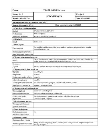 Firma: TRADE AGRO Sp. z o.o. Strona 1 z 2 Wersja: 1 SPECYFIKACJA Nr ref.: KSJ-01/Z-01 Data: 10.05.2013 Nazwa towaru: OWIES KONSUMPCYJNY Data obowiązywania:10.05.2013 Numer dokumentu: SP-10 1. Charakterystyka produktu Rodzaj Pochodzenie Normy dla produktu 2. Składniki Skład 3. Opis użycia Przeznaczenie OWIES KONSUMPCYJNY Unia Europejska PN-R-74106 i PN-R-74106/Az1 Ziarno owsa Do produkcji mąki owsianej i innych produktów spożywczych powstałych w wyniku przemiału ziarna owsa. Instrukcje przygotowania Dane dotyczące dozowania 4. Wymagania organoleptyczne Barwa Barwa charakterystyczna dla danego komponentu, nasiona bez widocznych fuzarioz, bez nasion porośniętych, z małą ilością uszkodzeń mechanicznych, Struktura Swoisty dla zbóż, bez zapachów stęchlizny i innych zapachów obcych Zapach 5. Wymagania fizyko-chemiczne Gęstość min. 50 kg/hl Wilgotność do 15 % Zanieczyszczenia ogółem max 6% w tym nieużyteczne max 2% Zanieczyszczenia fizyczne bez zanieczyszczeń fizycznych - odłamki szkła, metalu, plastiku. Wymagania chemiczne Zgodne z wymogami GMP 6. Wymagania mikrobiologiczne Bez nalotu i zapachu pleśni Obecność pleśni Bez szkodników i śladów po szkodnikach Obecność szkodników Bez zanieczyszczeń organicznych –chwasty szkodliwe dla zwierząt Zanieczyszczenia organiczne (nasiona przytuli czepnej) 7. Oznakowanie towaru Wymagane informacje Sposób znakowania 8. Dane logistyczne luz Rodzaj opakowania Wielkość opakowania 9.Przechowywanie Okres przechowywania Warunki przechowywania Silosy zbożowe, magazyny płaskie, chronić przed zawilgoceniem, temperatura produktu poniżej 25 stopni C, Firma: TRADE AGRO Sp. z o.o. Strona 2 z 2 Wersja: 1 SPECYFIKACJA Nr ref.: KSJ-01/Z-01 10. Transport Rodzaj środka transportu Warunki transportu Data: 10.05.2013 Naczepy - typ „wanna” lub okryte przyczepy samochodowe. Pojazdy czyste tzn. bez widocznych zabrudzeń, pozostałości po poprzednim załadunku, zlepów i wyczuwalnych odorów oraz szczelne tzn. bez otworów w burtach, podłodze i plandece naczepy 11. Ocena partii Partię uznaje się za zgodną, jeżeli zbadane parametry odpowiadają wymaganiom niniejszej specyfikacji. SPORZĄDZIŁ: Data: ZATWIERDZIŁ: Podpis: Data: Podpis: