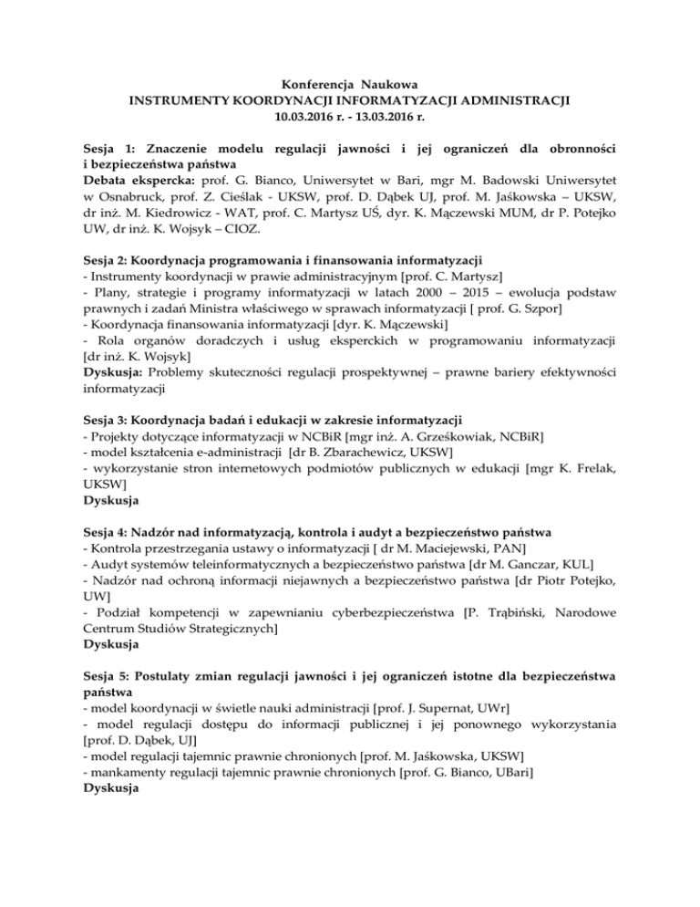 Konferencja Naukowa INSTRUMENTY KOORDYNACJI INFORMATYZACJI ADMINISTRACJI 10.03.2016 r. - 13.03.2016 r. Sesja 1: Znaczenie modelu regulacji jawności i jej ograniczeń dla obronności i bezpieczeństwa państwa Debata ekspercka: prof. G. Bianco, Uniwersytet w Bari, mgr M. Badowski Uniwersytet w Osnabruck, prof. Z. Cieślak - UKSW, prof. D. Dąbek UJ, prof. M. Jaśkowska – UKSW, dr inż. M. Kiedrowicz - WAT, prof. C. Martysz UŚ, dyr. K. Mączewski MUM, dr P. Potejko UW, dr inż. K. Wojsyk – CIOZ. Sesja 2: Koordynacja programowania i finansowania informatyzacji - Instrumenty koordynacji w prawie administracyjnym [prof. C. Martysz] - Plany, strategie i programy informatyzacji w latach 2000 – 2015 – ewolucja podstaw prawnych i zadań Ministra właściwego w sprawach informatyzacji [ prof. G. Szpor] - Koordynacja finansowania informatyzacji [dyr. K. Mączewski] - Rola organów doradczych i usług eksperckich w programowaniu informatyzacji [dr inż. K. Wojsyk] Dyskusja: Problemy skuteczności regulacji prospektywnej – prawne bariery efektywności informatyzacji Sesja 3: Koordynacja badań i edukacji w zakresie informatyzacji - Projekty dotyczące informatyzacji w NCBiR [mgr inż. A. Grześkowiak, NCBiR] - model kształcenia e-administracji [dr B. Zbarachewicz, UKSW] - wykorzystanie stron internetowych podmiotów publicznych w edukacji [mgr K. Frelak, UKSW] Dyskusja Sesja 4: Nadzór nad informatyzacją, kontrola i audyt a bezpieczeństwo państwa - Kontrola przestrzegania ustawy o informatyzacji [ dr M. Maciejewski, PAN] - Audyt systemów teleinformatycznych a bezpieczeństwo państwa [dr M. Ganczar, KUL] - Nadzór nad ochroną informacji niejawnych a bezpieczeństwo państwa [dr Piotr Potejko, UW] - Podział kompetencji w zapewnianiu cyberbezpieczeństwa [P. Trąbiński, Narodowe Centrum Studiów Strategicznych] Dyskusja Sesja 5: Postulaty zmian regulacji jawności i jej ograniczeń istotne dla bezpieczeństwa państwa - model koordynacji w świetle nauki administracji [prof. J. Supernat, UWr] - model regulacji dostępu do informacji publicznej i jej ponownego wykorzystania [prof. D. Dąbek, UJ] - model regulacji tajemnic prawnie chronionych [prof. M. Jaśkowska, UKSW] - mankamenty regulacji tajemnic prawnie chronionych [prof. G. Bianco, UBari] Dyskusja