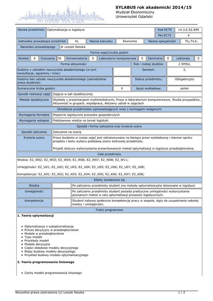 SYLABUS rok akademicki 2014/15 Wydział Ekonomiczny Uniwersytet Gdański Nazwa przedmiotu Optymalizacja w logistyce Jednostka prowadząca przedmiot Nazwisko prowadzącego KL Nazwa kierunku Ekonomia Kod ECTS 14.3.E.SZ.899 Pkt.ECTS 4 Nazwa specjalności TiL;TiL4; dr Leszek Reszka Forma zajęć/Liczba godzin Wykład 0 Ćwiczenia 30 Konwersatoria 0 Laboratoria komputerowe Forma aktywności 0 Sumaryczna liczba godzin: 0 0 Lektoraty Rok i rodzaj studiów: 2 SMSU, Semestr: 3, Status przedmiotu: Obligatoryjny Język wykładowy: polski Godziny z udziałem nauczyciela akademickiego (w tym konsultacje, egzaminy i inne): Godziny bez udziału nauczyciela akademickiego (samodzielna praca studenta): Seminaria 0 Sposób realizacji zajęć Zajęcia w sali dydaktycznej. Metody dydaktyczne Wykłady z prezentacjami multimedialnymi, Praca w laboratorium komputerowym, Studia przypadków, Aktywność w grupach, współpraca, Aktywny udział w zajęciach Określenie przedmiotów wprowadzających wraz z wymogami wstępnymi Wymagania formalne Wsparcie logistyczne procesów gospodarczych Wymagania wstepne Podstawowa wiedza na temat logistyki Sposób i forma zaliczenia oraz kryteria oceny Sposób zaliczenia Kryteria oceny Zaliczenie na ocenę Praca studenta w czasie zajęć jest odnotowywana na bieżąco przez wykładowcę i stanowi oprócz projektu i testu wyboru podstawę oceny końcowej przedmiotu. Projekt dotyczy wykorzystania prezentowanych metod optymalizacji w logistyce przedsiębiorstwa. Cele przedmiotu Wiedza: E2_W02; E2_W03; E2_W04; E2_W06; E2_W07; E2_W08; E2_W11; Umiejętności: E2_U01; E2_U02; E2_U03; E2_U04; E2_U05; E2_U06; E2_U07; E2_U08; Kompetencje: E2_K01; E2_K02; E2_K03; E2_K04; E2_K05; E2_K06; E2_K07; E2_K08; Efekty kształcenia się Wiedza Po zaliczeniu przedmiotu student zna metody optymalizacyjne stosowane w logistyce Umiejętności Po zaliczeniu przedmiotu student posiada praktyczne umiejętności wykorzystania poznanych metod w celu optymalizacji procesów logistycznych. Kompetencje Student nabywa społeczne kompetencje pracy w zespole, dąży do uzupełniania nabytej wiedzy i umiejętności. Treści programowe 1. Teoria optymalizacji Optymalizacja o suboptymalizacja Proces decyzyjny w przedsiębiorstwie Modele w przedsiębiorstwie Typy modeli Przykłady modeli Modele decyzyjne Części składowe modelu decyzyjnego Etapy budowy modelu decyzyjnego Przykład budowy modelu optymalizacyjnego 2. Teoria programowania liniowego Cechy modeli programowania liniowego Wszystkie prawa zastrzeżone (c) Leszek Reszka 1/2 SYLABUS rok akademicki 2014/15 Wydział Ekonomiczny Uniwersytet Gdański Istota i algorytm stosowania narzędzia SOLVER Programowanie liniowe jako realizacja zasady racjonalnego gospodarowania 3. Przykłady modeli programowania liniowego Optymalny wybór asortymentu produkcji Programowanie liniowe w liczbach całkowitych Inne możliwe ograniczenia w programowaniu liniowym Zagadnienie diety Graficzna metoda rozwiązywania modelu programowania liniowego Dualizm w programowaniu liniowym 4. Modele programowania liniowego wykorzystywane w logistyce Zagadnienie transportowe Zbilansowane i niezbilansowane zagadnienie transportowe Problem blokady tras w zagadnieniu transportowym Zagadnienie transportowe z przeładunkami (zagadnienie pośrednika) Zagadnienie przydziału 5. Teoria programowania sieciowego Wybrane pojęcia teorii grafów Graficzna ilustracja grafu 6. Przykłady modeli programowania sieciowego Model transportowy z przeładunkami Model najkrótszej trasy Model maksymalnego przepływu Wykaz literatury podstawowej i uzupełniającej Lektury obowiązkowe: M. Chaberek: Makro- i mikroekonomiczne aspekty wsparcia logistycznego. Wydawnictwo Uniwersytetu Gdańskiego Gdansk 2002. J. W. Wiśniewski: Instrumenty decyzyjne przedsiębiorcy. Instytut Wydawniczy, GRAVIS, Toruń 2002. Lektury uzupełniające: L. Reszka: Koniunkcja logistyki i optymalizacji [W:] Acta Universitatis Nicolai Copernici. Nauki Humanistyczno-Społeczne, Zeszyt 407. Zarządzanie XXXIX Wydawnictwo Uniwersytetu Mikołaja Kopernika. Toruń 2012, ISSN 1689-8966, ISSN 0860-1232, s. 109-118 L. Reszka: Optymalizacja harmonogramu wymiany sprzętu jako zadanie logistyczne [W:] M. Chaberek, L. Reszka (red.): Modelowanie procesów i systemów logistycznych, cz. XI. Zeszyty Naukowe Uniwersytetu Gdańskiego. Ekonomika Transportu i Logistyka, nr 42 Wydawnictwo Uniwersytetu Gdańskiego, Gdańsk 2012, ISSN 0208-4821, s. 189-196 L. Reszka: Solver jako narzędzie rozwiązywania logistycznych problemów optymalizacyjnych [W:] Roczniki Naukowe Wyższej Szkoły Bankowej w Toruniu, nr 10 (10) 2011, Wyższa Szkoła Bankowa w Toruniu, Toruń 2011, ISSN 1643-8175, s. 321-336 L. Reszka: Model maksymalnego przepływu jako przykład narzędzia optymalizacji procesów logistycznych w mieście [W:] M. Chaberek, L. Reszka (red.): Modelowanie procesów i systemów logistycznych, cz. x. Zeszyty Naukowe Uniwersytetu Gdańskiego. Ekonomika Transportu Lądowego, nr 40 Wydawnictwo Uniwersytetu Gdańskiego, Gdańsk 2011, ISSN 0208-4821, s. 229-235 L. Reszka: Optymalizacja hurtowej sieci dystrybucyjnej jako zadanie logistyczne. [W:] D. Rucińska (red.): Studia nad transportem i logistyką. Zeszyty Naukowe Uniwersytetu Gdańskiego. Ekonomika Transportu Lądowego, nr 25. Wydawnictwo Uniwersytetu Gdańskiego, Gdańsk 2003, ISSN 0208-4821, s. 219-225 Kontakt [email protected], Wszystkie prawa zastrzeżone (c) Leszek Reszka 2/2
