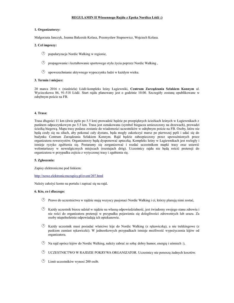 REGULAMIN II Wiosennego Rajdu z Epoka Nordica Łódź :) 1. Organizatorzy: Małgorzata Janczyk, Joanna Balcerak-Kolasa, Przemysław Stupnowicz, Wojciech Kolasa. 2. Cel imprezy: popularyzacja Nordic Walking w regionie, propagowanie i kształtowanie sportowego stylu życia poprzez Nordic Walking , upowszechnianie aktywnego wypoczynku ludzi w każdym wieku. 3. Termin i miejsce: 20 marca 2016 r. (niedziela) Łódź-kompleks leśny Łagiewniki, Centrum Zarządzania Szlakiem Konnym ul. Wycieczkowa 86, 91-518 Łódź. Start rajdu planowany jest o godzinie 10.00. Szczegóły zostaną opublikowane w odrębnym poście na FB. 4. Trasa: Trasa długości 11 km (dwie pętle po 5.5 km) prowadzić będzie po przepięknych ścieżkach leśnych w Łagiewnikach z punktem odpoczynkowym po 5.5 km. Trasa jest oznakowana (symbol biegacza umieszczony na drzewach), prowadzi ścieżką biegową. Mapa trasy podana zostanie do wiadomości uczestników w odrębnym poście na FB. Osoby, które nie będą czuły się na siłach, aby pokonać cały dystans, będa mogły zakończyć marsz po pierwszej pętli i udać się do budynku Centrum Zarządzania Szlakiem Konnym. Rajd będzie zabezpieczony przez upoważnionych przez organizatora rowerzystów. Organizatorzy będą dysponować apteczką. Kompleks leśny w Łagiewnikach jest rozległy i istnieje ryzyko zgubienia się. Postaramy się zorganizować i rozdać uczestnikom mapki trasy oraz ustawić wolontariuszy w newralgicznych miejscach (rozstajach dróg). Uczestnicy rajdu nie będą rościć pretensji do organizatora w przypadku zejścia z wytyczonej trasy i zgubienia się. 5. Zgłoszenia: Zapisy elektroniczne pod linkiem: http://nowe.elektronicznezapisy.pl/event/207.html Należy założyć konto na portalu i zapisać się na rajd. 6. Kto, co i dlaczego: Prawo do uczestnictwa w rajdzie mają wszyscy pasjonaci Nordic Walking i ci, którzy planują nimi zostać, Każdy uczestnik bierze udział w rajdzie na własną odpowiedzialność, jest świadomy swojego stanu zdrowia i nie rości do organizatora pretensji w przypadku pojawienia się dolegliwości zdrowotnych lub urazu. Za osoby niepełnoletnie odpowiadają ich opiekunowie. Każdy uczestnik musi posiadać właściwe kije do Nordic Walking (z rękawiczką), a nie trekkingowe (z paskiem zamiast rękawiczki). W jednostkowych przypadkach istnieje możliwość wypożyczenia kijów od organizatora. Na rajd oprócz kijów do Nordic Walking, należy zabrać ze sobą: dobry humor, energię i uśmiech :), UCZESTNICTWO W RAJDZIE POKRYWA ORGANIZATOR. Uczestnicy nie ponoszą żadnych kosztów. Limit uczestników wynosi 200 osób. 7. Po rajdzie: Dla każdej osoby, która ukończy rajd planowe są drobne, pamiątkowe upominki. Jesteśmy w trakcie ich organizowania. Walkerzy na bieżąco do czasu rozpoczęcia imprezy będą informowani o aktualnościach z nią związanych za pośrednictwem FB. 8. Kontakt do organizatora: Przemek Stupnowicz- 511 106 475, [email protected] Wojciech Kolasa- 605 57 35 45 , [email protected] 9. Ważne informacje: Ze względu na charakter imprezy (spotkanie miłośników spacerów z kijami), organizatorzy nie zapewniają ubezpieczenia. Nasz rajd ma być miłym spotkaniem grupy walkerów. Naszą intencją jest integracja pasjonatów Nordic Walking i wspólne spędzenie czasu podczas spaceru na świeżym powietrzu. Zapraszamy! :)