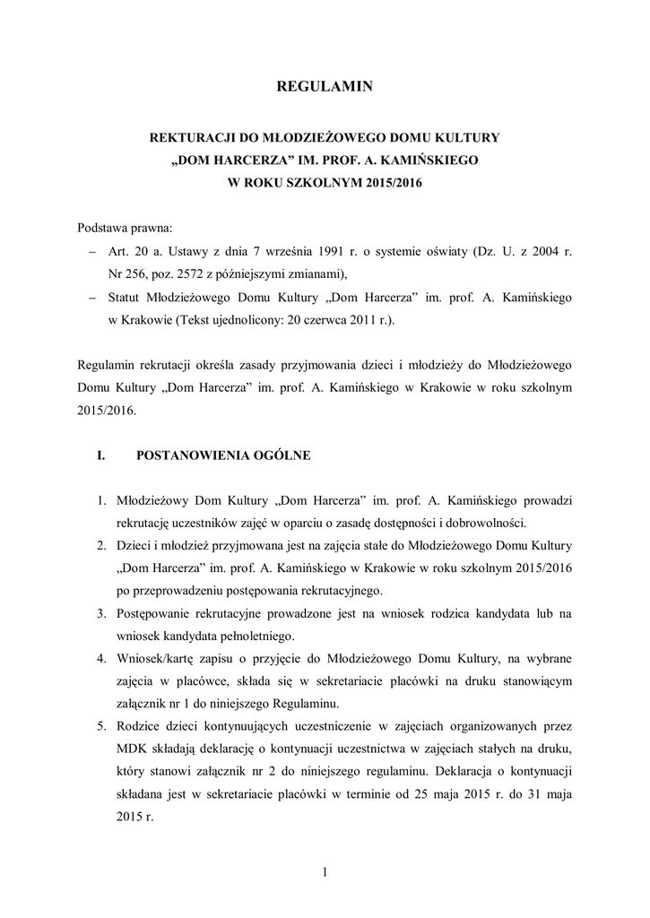 REGULAMIN REKTURACJI DO MŁODZIEŻOWEGO DOMU KULTURY „DOM HARCERZA” IM. PROF. A. KAMIŃSKIEGO W ROKU SZKOLNYM 2015/2016 Podstawa prawna: Art. 20 a. Ustawy z dnia 7 września 1991 r. o systemie oświaty (Dz. U. z 2004 r. Nr 256, poz. 2572 z późniejszymi zmianami), Statut Młodzieżowego Domu Kultury „Dom Harcerza” im. prof. A. Kamińskiego w Krakowie (Tekst ujednolicony: 20 czerwca 2011 r.). Regulamin rekrutacji określa zasady przyjmowania dzieci i młodzieży do Młodzieżowego Domu Kultury „Dom Harcerza” im. prof. A. Kamińskiego w Krakowie w roku szkolnym 2015/2016. I. POSTANOWIENIA OGÓLNE 1. Młodzieżowy Dom Kultury „Dom Harcerza” im. prof. A. Kamińskiego prowadzi rekrutację uczestników zajęć w oparciu o zasadę dostępności i dobrowolności. 2. Dzieci i młodzież przyjmowana jest na zajęcia stałe do Młodzieżowego Domu Kultury „Dom Harcerza” im. prof. A. Kamińskiego w Krakowie w roku szkolnym 2015/2016 po przeprowadzeniu postępowania rekrutacyjnego. 3. Postępowanie rekrutacyjne prowadzone jest na wniosek rodzica kandydata lub na wniosek kandydata pełnoletniego. 4. Wniosek/kartę zapisu o przyjęcie do Młodzieżowego Domu Kultury, na wybrane zajęcia w placówce, składa się w sekretariacie placówki na druku stanowiącym załącznik nr 1 do niniejszego Regulaminu. 5. Rodzice dzieci kontynuujących uczestniczenie w zajęciach organizowanych przez MDK składają deklarację o kontynuacji uczestnictwa w zajęciach stałych na druku, który stanowi załącznik nr 2 do niniejszego regulaminu. Deklaracja o kontynuacji składana jest w sekretariacie placówki w terminie od 25 maja 2015 r. do 31 maja 2015 r. 1 6. W celu zapewnienia dziecku odpowiedniej opieki podczas pobytu w MDK, rodzic dziecka przekazuje Dyrektorowi niezbędne dane umieszczone na karcie zapisu. 7. O przyjęciu kandydata do MDK w trakcie roku szkolnego, decyduje Dyrektor. II. REKRUTACJA 1. Rekrutacja do Młodzieżowego Domu Kultury „Dom Harcerza” im. prof. A. Kamińskiego w Krakowie prowadzona jest od 1 czerwca 2015 r. do 30 czerwca 2015 r. 2. Postępowanie rekrutacyjne przeprowadza komisja rekrutacyjna powołana przez Dyrektora placówki. 3. Do zadań komisji rekrutacyjnej należy w szczególności: ustalenie i podanie do publicznej wiadomości listy kandydatów przyjętych, zawierającej imiona i nazwiska kandydatów oraz liczbę otrzymanych punktów, przeprowadzenie sprawdzianu uzdolnień kierunkowych, o ile Dyrektor placówki podejmie decyzję o ich zorganizowaniu; warunki sprawdzenia uzdolnień kierunkowych określa rada pedagogiczne placówki , sporządzenie protokołu postępowania rekrutacyjnego. 4. Listy kandydatów przyjętych i nieprzyjętych podaje się do publicznej wiadomości poprzez umieszczenie w widocznym miejscu w siedzibie placówki. Listy zawierają imiona i nazwiska kandydatów w kolejności alfabetycznej 5. Termin podania list przyjętych kandydatów ustala się na 3 lipca 2015 r. 6. W terminie 7 dni od dnia podania do publicznej wiadomości listy kandydatów przyjętych i kandydatów nieprzyjętych, rodzic kandydata lub kandydat pełnoletni może wystąpić do komisji z wnioskiem o sporządzenie uzasadnienia odmowy przyjęcia kandydata do placówki. 7. Uzasadnienie odmowy przyjęcia z podaniem przyczyn przygotowuje na piśmie przewodniczący Komisji Rekrutacyjnej w terminie 5 dni od dnia wystąpienia z pismem rodzica kandydata lub kandydata pełnoletniego. 8. Rodzic kandydata lub kandydat pełnoletni może wnieść do Dyrektora placówki odwołanie od rozstrzygnięcia komisji rekrutacyjnej, w terminie 7 dni od dnia otrzymania uzasadnienia. 2 9. Dyrektor MDK rozpatruje odwołanie od rozstrzygnięcia komisji rekrutacyjnej, w terminie 7 dni od dnia otrzymania odwołania. Na rozstrzygnięcie Dyrektora MDK służy skarga do sądu administracyjnego. 10. Jeżeli po przeprowadzeniu postępowania rekrutacyjnego, uzupełniającego placówka nadal dysponuje wolnymi miejscami w stałych formach zajęć Dyrektor przeprowadza rekrutację uzupełniającą. 11. Rekrutacja uzupełniająca prowadzona jest od 17 sierpnia 2015 r. do 27 sierpnia 2015 r. 12. W postępowaniu uzupełniającym obowiązują takie same zasady jak w rekrutacji. 13. Termin podania list przyjętych kandydatów ustala się na 28 sierpnia 2015 r. 14. Jeżeli MDK dysponuje wolnymi miejscami po 1 września 2015 r., uczestnicy mogą być przyjmowani do placówki w ciągu roku szkolnego na wniosek rodziców, opiekunów prawnych lub samego kandydata, złożony do Dyrektora MDK. Decyzję o przyjęciu uczestnika na wolne miejsce w ciągu roku szkolnego podejmuje Dyrektor w uzgodnieniu z nauczycielem prowadzącym daną formę zajęć. III. KRYTERIA REKRUTACJI Przy rekrutacji do Młodzieżowego Domu Kultury „Dom Harcerza” im. prof. A. Kamińskiego w Krakowie w roku szkolnym 2015/16 brane będą pod uwagę następujące kryteria: 1) Kandydat wykazuje zainteresowania i uzdolnienia kierunkowe - 20 pkt. 2) Rodzina kandydata uczestnikiem Programu „Krakowska Karta Rodzinna 3+” - 15 pkt. 3) Rodzice kandydata są płatnikami podatku dochodowego w Gminie Miejskiej Kraków - 15 pkt. 4) Kandydat był w ostatnich dwóch latach uczestnikiem zajęć stałych organizowanych w MDK - 10 pkt. 5) Kandydat wychowuje się w rodzinie wielodzietnej (kryterium dotyczy rodzin posiadających więcej niż 2 dzieci, a nie korzystających z Programu Krakowska Karta Rodzinna) – 5 pkt. 6) Rodzeństwo kandydata jest lub było w ostatnich dwóch latach uczestnikami zajęć stałych organizowanych w MDK - 5 pkt. 3 7) Kandydat ma orzeczenie lekarskie o niepełnosprawności, o ile rodzaj niepełnosprawności nie wyklucza udziału w danej formie zajęć - 5 pkt 8) Jedno z rodziców kandydata ma orzeczenie lekarskie o niepełnosprawności - 5 pkt 9) Oboje rodzice kandydata mają orzeczenie lekarskie o niepełnosprawności - 5 pkt 10) Kandydat wychowuje się w rodzinie objętej pomocą socjalną - 5 pkt IV. WYMAGANE DOKUMENTY. Do wniosku rek