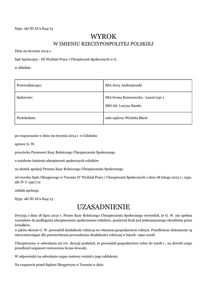 Sygn. akt III AUa 844/13 WYROK W IMIENIU RZECZYPOSPOLITEJ POLSKIEJ Dnia 29 stycznia 2014 r. Sąd Apelacyjny - III Wydział Pracy i Ubezpieczeń Społecznych w G. w składzie: Przewodniczący: SSA Jerzy Andrzejewski Sędziowie: SSA Iwona Krzeczowska - Lasoń (spr.) SSO del. Lucyna Ramlo Protokolant: sekr.sądowy Wioletta Blach po rozpoznaniu w dniu 29 stycznia 2014 r. w Gdańsku sprawy G. W. przeciwko Prezesowi Kasy Rolniczego Ubezpieczenia Społecznego o ustalenie istnienia ubezpieczeń społecznych rolników na skutek apelacji Prezesa Kasy Rolniczego Ubezpieczenia Społecznego od wyroku Sądu Okręgowego w Toruniu IV Wydział Pracy i Ubezpieczeń Społecznych z dnia 28 lutego 2013 r., sygn. akt IV U 1597/12 oddala apelację. Sygn. akt III AUa 844/13 UZASADNIENIE Decyzją z dnia 18 lipca 2012 r. Prezes Kasy Rolniczego Ubezpieczenia Społecznego stwierdził, że G. W. nie spełnia warunków do podlegania ubezpieczeniu społecznemu rolników, ponieważ brak jest jednoznacznego określenia przez świadków, w jakim okresie G. W. prowadził działalność rolniczą we własnym gospodarstwie rolnym. Przedłożone dokumenty są niewystarczające dla potwierdzenia prowadzenia działalności rolniczej w latach: 1990-2008. Ubezpieczony w odwołaniu od ww. decyzji podniósł, że prowadził gospodarstwo rolne do 2008 r., na dowód czego przedłożył organowi rentowemu liczne dowody. W odpowiedzi na odwołanie organ rentowy wniósł o jego oddalenie. Na rozprawie przed Sądem Okręgowym w Toruniu w dniu 15 listopada 2012 r., ubezpieczony podtrzymał odwołanie i wniósł dodatkowo o przyznanie mu prawa do renty. Sąd Okręgowy w Toruniu – IV Wydział Pracy i Ubezpieczeń Społecznych wyrokiem z dnia 28 lutego 2013 r. w sprawie IV U 1597/12 zmienił zaskarżoną decyzję organu rentowego w ten sposób, że stwierdził, że G. W. spełnił warunki do podlegania ubezpieczeniu społecznemu rolników w okresie od dnia 1 stycznia 1990 r. do dnia 31 grudnia 2008 r. (punkt pierwszy) oraz przekazał Prezesowi Kasy Rolniczego Ubezpieczenia Społecznego wniosek G. W. o rentę (punkt drugi). Podstawę tego rozstrzygnięcia stanowiły następujące ustalenia i rozważania Sądu pierwszej instancji. Ubezpieczony G. W. jest od dnia 11 maja 1962 r. począwszy zameldowany w miejscowości S., gmina Ł.. W okresie, którego dotyczy niniejszy spór, tj. w latach: 1990 – 2008, prowadził on gospodarstwo rolne we wsi S. (gmina Ł.) o powierzchni 1,5 ha fizycznych (czyli 1,98 ha przeliczeniowych), którego jest jedynym właścicielem. Dla wymienionego wyżej gospodarstwa rolnego (działki nr (...)) Sąd Rejonowy w Grudziądzu prowadzi księgę wieczystą o numerze (...). W swoim gospodarstwie rolnym ubezpieczony prowadził działalność rolniczą polegającą na uprawie zbóż (np. pszenicy), chowie drobiu i trzody chlewnej oraz uprawie warzyw (np. cebuli, porów, ogórków, marchwi, buraków i in.). G. W. posiadał specjalistyczne maszyny rolnicze – kosiarkę, sprzęt do pielenia, maszynę do zbioru ziemniaków oraz zgrabiarkę do siana. W okresie do 1997 r. włącznie G. W. jako rolnik indywidualny sprzedawał uprawiane przez siebie warzywa i owoce – do Zakładu (...) w Ł.. Ubezpieczony sprzedawał warzywa i owoce do skupu przez co najmniej kilka lat, w Zakładzie w Ł. istniała bowiem praktyka polegająca na zawieraniu z rolnikami umów kontraktacji na okresy przynajmniej kilkuletnie. W tamtym czasie referentem ds. surowcowych oraz kierownikiem skupu w wymienionym wyżej Zakładzie była E. E., która przyjmowała warzywa do skupu m. in. od ubezpieczonego. G. W. sprzedawał do Zakładu w Ł. takie warzywa, jak marchew, pietruszka, ogórki itp. Poza tym ubezpieczony sprzedawał do punktu skupu tucznika w Ł. - trzodę chlewną (świniaki do skupu zawoził fizycznie sąsiad G. W., J. Ż.). W okresie, którego dotyczy niniejszy spór, tj. w latach: 1990– 2008, wnioskodawca jako właściciel gospodarstwa rolnego korzystał z usług (...), który wykonywał w jego gospodarstwie omłot zboża oraz zbiór buraków przy użyciu specjalistycznego sprzętu rolniczego. Za wykonaną usługę (...) otrzymywał od ubezpieczonego w rozliczeniu część zebranych plonów (zboża lub buraków) – w przeliczeniu na wartość wykonanej usługi. W dniu 30 grudnia 1998 r. w gospodarstwie (...) miał miejsce pożar stodoły, garażu i szopy. W wyniku pożaru spaleniu uległa szopa drewniana kryta eternitem, drewniana stodoła, garaż murowany oraz dwie maszyny rolnicze – jedna służąca do zbioru ziemniaków, zaś druga będąca zgrabiarką do siana. Ubezpieczony odbudował spalone zabudowania. Po 1990 r. G. W. zaczął wyjeżdżać do swojej matki i ciotki mieszkających na terenie Republiki Federalnej Niemiec, aby się nimi opiekować. Ubezpieczony wyjeżdżał każdorazowo w sezonie jesienno-zimowym na okres około jednego – dwóch miesięcy. Po upływie tego czasu G. W. zawsze wracał do kraju. Podczas nieobecności ubezpieczonego w Polsce jego gospodarstwem rolnym zajmowali się członkowie najbliższej rodziny, tacy jak siostrzeniec lub brat ubezpieczonego. G. W. opłacał składki na ubezpieczenie społeczne rolników oraz podlegał temu ubezpieczeniu przez pięć lat, tzn. w okresie od 1985 r. do 1989 r. Jest on podatnikiem podatku rolnego na terenie gminy Ł.. Wyżej wymieniony opłaca podatek za gospodarstwo rolne o powierzchni 1,5 ha przeliczeniowego. W dniu 15 września 2008 r. G. W. zawarł umowę dzierżawy swojego gospodarstwa rolnego, na mocy której wydzierżawił całość tego gospodarstwa na rzecz M. D., będącego dla ubezpieczonego osobą obcą. Umowę zawarto na okres dziesięciu lat. Umowa przewidywała, iż odtąd wszelkie zobowiązania pieniężne wynikające z użytkowania gruntu ponosić będzie dzierżawca – czyli M. D.. Przedmiotowy kontrakt został oficjalnie zgłoszony w Urzędzie Miasta i Gminy Ł. dopiero w dniu 19 stycznia 2012 r., zaś w operacie ewidencji gruntów i budynków Staro