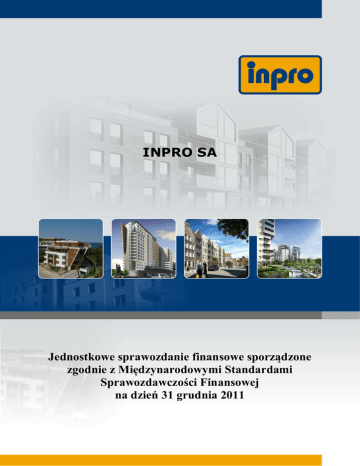 Sprawozdanie finansowe INPRO SA za 2011 rok Wszystkie kwoty w tysiącach złotych, o ile nie podano inaczej INPRO SA Jednostkowe sprawozdanie finansowe sporządzone zgodnie z Międzynarodowymi Standardami Sprawozdawczości Finansowej na dzień 31 grudnia 2011 1 z 73 Sprawozdanie finansowe INPRO SA za 2011 rok Wszystkie kwoty w tysiącach złotych, o ile nie podano inaczej SPIS TREŚCI WYBRANE DANE FINANSOWE DOTYCZĄCE JEDNOSTKOWEGO SPRAWOZDANIA FINANSOWEGO INPRO SA .................................................. 4 SPRAWOZDANIE Z CAŁKOWITYCH DOCHODÓW ZA OKRES ZAKOŃCZONY 31 GRUDNIA 2011 ......................................................................................... 5 SPRAWOZDANIE Z SYTUACJI FINANSOWEJ ZA OKRES ZAKOŃCZONY 31.12.2011 .................................................................................................... 6 SPRAWOZDANIE ZE ZMIAN W KAPITALE WŁASNYM ZA OKRES ZAKOŃCZONY 31.12.2011 .................................................................................................... 8 SPRAWOZDANIE Z PRZEPŁYWÓW PIENIĘŻNYCH ZA OKRES ZAKOŃCZONY 31.12.2011 .................................................................................................... 9 DODATKOWE INFORMACJE I OBJAŚNIENIA .................................................11 Nota Nota Nota Nota Nota Nota Nota Nota Nota Nota Nota Nota Nota Nota Nota Nota Nota Nota Nota Nota Nota Nota Nota Nota Nota Nota Nota Nota Nota Nota Nota Nota Nota 1 Informacje ogólne ...................................................................................11 2 Struktura kapitału zakładowego ................................................................12 3 Skład Zarządu oraz Rady Nadzorczej Spółki ...............................................12 4 Zatwierdzenie sprawozdania finansowego ..................................................13 5 Podstawa sporządzenia sprawozdania finansowego .....................................13 6 Status zatwierdzenia standardów w UE ......................................................13 7 Nowe standardy i interpretacje ................................................................14 8 Wcześniejsze zastosowanie standardów i interpretacji .................................15 9 Zmiany stosowanych zasad rachunkowości ................................................15 10 Korekta błędu .......................................................................................16 11 Istotne wartości oparte na profesjonalnym osądzie i szacunkach .................16 12 Zastosowane zasady rachunkowości ........................................................16 13 Informacje dotyczące segmentów operacyjnych ........................................28 14 Przychody i koszty.................................................................................29 15 Podatek dochodowy ...............................................................................31 16 Majątek socjalny oraz zobowiązania ZFŚS ................................................35 17 Zysk przypadający na jedną akcję ...........................................................35 18 Dywidendy wypłacone i zadeklarowane do wypłaty ....................................36 19 Rzeczowe aktywa trwałe ........................................................................37 20 Nieruchomości inwestycyjne ...................................................................39 21 Wartości niematerialne ..........................................................................39 22 Udziały w jednostkach powiązanych ........................................................42 23 Pozostałe aktywa finansowe ...................................................................44 24 Zapasy ................................................................................................44 25 Należności z tytułu dostaw i usług oraz pozostałe należności .......................45 26 Środki pieniężne i ich ekwiwalenty...........................................................46 27 Kapitał zakładowy oraz pozostałe kapitały ................................................47 28 Rezerwy ...............................................................................................49 29 Oprocentowane kredyty bankowe, leasingi oraz wyemitowane obligacje .......51 30 Zobowiązania z tytułu dostaw i usług oraz pozostałe zobowiązania ..............57 31 Dotacje rządowe ...................................................................................58 32 Zobowiązania i należności warunkowe .....................................................58 33 Informacje o podmiotach powiązanych.....................................................60 2 z 73 Sprawozdanie finansowe INPRO SA za 2011 rok Wszystkie kwoty w tysiącach złotych, o ile nie podano inaczej Nota 34 Cele i zasady zarządzania ryzykiem finansowym .......................................62 Nota 35 Zarządzanie kapitałem ...........................................................................69 Nota 36 Instrumenty finansowe ..........................................................................71 Nota 37 Struktura zatrudnienia ...........................................................................71 Nota 38 Wynagrodzenie biegłego rewidenta lub podmiotu uprawnionego..................72 do badania sprawozdań finansowych ...................................................................72 Nota 39 Zdarzenia po dniu bilansowym ................................................................72 Gdańsk, 20 marca 2012 roku Imię i nazwisko, funkcja podpis Piotr Stefaniak Prezes Zarządu Zbigniew Lewiński Wiceprezes Zarządu Krzysztof Maraszek Wiceprezes Zarządu Elżbieta Marks Osoba odpowiedzialna za prowadzenie ksiąg 3 z 73 Sprawozdanie finansowe INPRO SA za 2011 rok Wszystkie kwoty w tysiącach złotych, o ile nie podano inaczej WYBRANE DANE FINANSOWE DOTYCZĄCE JEDNOSTKOWEGO SPRAWOZDANIA FINANSOWEGO INPRO SA Wybrane dane dotyczące