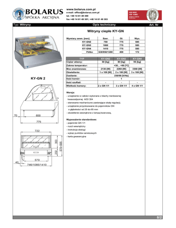 www.bolarus.com.pl e-mail: [email protected] tel. +48 14 61 49 300 fax +48 14 61 49 301; +48 14 61 49 303 Typ: Witryny Opis techniczny Art. Nr Witryny ciepłe KY-GN Wymiary zewn. [mm] Szer. Gł. KY-GN2 750 775 585 KY-GN3 1080 775 585 KY-GN4 Półka: TYP Ciężar własny: 1410 775 585 630/950/1280 400 172 KY-GN2 50 [kg] KY-GN3 80 [kg] KY-GN4 95 [kg] +30... +90 [ºC] Zakres temperatur: Moc znamionowa: Oświetlenie: KY-GN 2 2130 [W] 2260 [W] 3360 [W] 1 x 100 [W] 2 x 100 [W] 3 x 100 [W] Zasilanie: Ilość komór: Ilość szuflad: Wielkość komory: Wys. 230/50 [V/Hz] 1 2 x GN 1/1 - - 3 x GN 1/1 4 x GN 1/1 Wersja: - urządzenie w całości wykonane z blachy nierdzewnej kwasoodpornej AISI 304 - sterowanie mechaniczne zawierające skalę regulacji, - urządzenie przystosowane do pojemników GN o głębokości od 20 do 65 mm - oświetlenie wewnętrzne z lampą kwarcową, Wyposażenie standardowe: - pojemniki GN 1/1 - ruszt wewnętrzny - instrukcja obsługi - wykaz punktów serwisowych - karta gwarancyjna 8/2