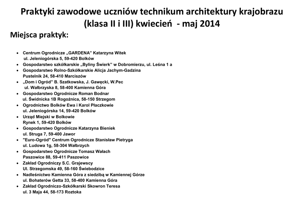 Praktyki zawodowe uczniów technikum architektury krajobrazu (klasa II i III) kwiecień - maj 2014 Miejsca praktyk:              Centrum Ogrodnicze „GARDENA” Katarzyna Witek ul. Jeleniogórska 5, 59-420 Bolków Gospodarstwo szkółkarskie „Byliny Świerk” w Dobromierzu, ul. Leśna 1 a Gospodarstwo Rolno-Szkółkarskie Alicja Jachym-Gadzina Pustelnik 24, 58-410 Marciszów „Dom i Ogród” B. Szatkowska, J. Gawęcki, W.Pec ul. Wałbrzyska 8, 58-400 Kamienna Góra Gospodarstwo Ogrodnicze Roman Bodnar ul. Świdnicka 1B Rogoźnica, 58-150 Strzegom Ogrodnictwo Bolków Ewa i Karol Płaczkowie ul. Jeleniogórska 14, 59-420 Bolków Urząd Miejski w Bolkowie Rynek 1, 59-420 Bolków Gospodarstwo Ogrodnicze Katarzyna Bieniek ul. Struga 7, 59-400 Jawor "Euro-Ogród" Centrum Ogrodnicze Stanisław Pietryga ul. Ludowa 1g, 58-304 Wałbrzych Gospodarstwo Ogrodnicze Tomasz Wałach Paszowice 88, 59-411 Paszowice Zakład Ogrodniczy S.C. Grajewscy Ul. Strzegomska 49, 58-160 Świebodzice Nadleśnictwo Kamienna Góra z siedzibą w Kamiennej Górze ul. Bohaterów Getta 33, 58-400 Kamienna Góra Zakład Ogrodniczo-Szkółkarski Skowron Teresa ul. 3 Maja 44, 58-173 Roztoka