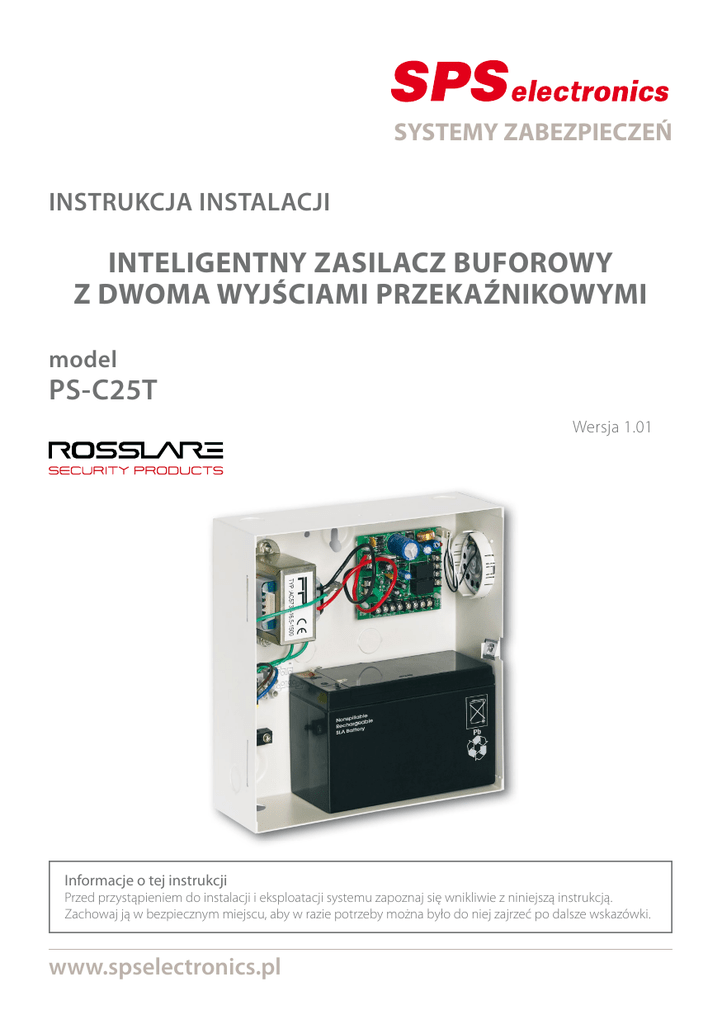 Instrukcja obsługi zasilacza ROSSLERE PS-C25T SYSTEMY ZABEZPIECZEŃ INSTRUKCJA INSTALACJI INTELIGENTNY ZASILACZ BUFOROWY Z DWOMA WYJŚCIAMI PRZEKAŹNIKOWYMI model PS-C25T Wersja 1.01 Informacje o tej instrukcji Przed przystąpieniem do instalacji i eksploatacji systemu zapoznaj się wnikliwie z niniejszą instrukcją. Zachowaj ją w bezpiecznym miejscu, aby w razie potrzeby można było do niej zajrzeć po dalsze wskazówki. www.spselectronics.pl www.spselectronics.pl 1 Instrukcja obsługi zasilacza ROSSLERE PS-C25T SPS Electronics Sp. z o.o. SPIS TRECI SPISTREŚCI 1. Wprowadzenie................................................................................................................................3 2. Specyfikacjatechniczna.........................................................................................................4 5 3. Instalacja............................................................................................................................................... 2 www.spselectronics.pl Instrukcja obsługi zasilacza ROSSLERE PS-C25T 1. Wprowadzenie Zasilacze serii PS‐x25x dokonują przetworzenia napięcia sieciowego 230 VAC do poziomu 12 VDC, realizują funkcjonalności zasilacza buforowego oraz pozwalają na bezpośrednie podłączenie konwertowalnych czytników kontroli dostępu i wysterowanie dwóch wyjść przekaźnikowych. Zasilacze PS‐x25x posiadają osobne obwody zasilające. Jeden służy do wysterowania rygli lub np. zwór elektromagnetycznych natomiast drugi zasila elementy kontroli dostępu (czytniki, kontrolery etc.). Pozwala to na istotne zwiększenie poziomu bezpieczeństwa chronionego obszaru, nawet w przypadku sabotowania elementów tj. czytniki. Komunikacja pomiędzy inteligentnym zasilaczem PS‐x25x a elementami kontroli dostępu (klawiatury, czytniki zbliżeniowe) realizowana jest za pośrednictwem dedykowanego protokołu firmy Rosslare, a użycie właściwych kodów powoduje wysyłanie komendy do aktywacji wyjścia rygla lub pomocniczego. Podobnie jest realizowane bezpośrednie podłączenie przycisku otwarcia drzwi (REX), wprost do płyty zasilacza. W przypadku utraty komunikacji pomiędzy czytnikami a zasilaczem (np. przecięcie lub zwarcie okablowania), system bezzwłocznie wykrywa fakt sabotażu i generuje jednominutowy sygnał alarmowy. Dodatkowo może zostać wysterowane wyjście pomocnicze (AUXILIARY) . Do pracy w trybie buforowego zasilania stosowany jest akumulator bezobsługowy. Zasilacz może wysterowywać również zewnętrzny głośnik sygnałem syreny lub dzwonka. www.spselectronics.pl 3 Instrukcja obsługi zasilacza ROSSLERE PS-C25T 2. Specyfikacjatechniczna 2.1.Charakterystykaelektryczna Napięcie zasilania: Pobór prądu: Wbudowany transformator: Wyjście stałoprądowe: Wyjście rygla: Wyjście pomocnicze: Głośnik: Wyjście głośnikowe: Akumulator buforowy: Zabezpieczenia: Napięcie zmienne 230 VAC 0,14 A; 25 VA 230 / 16 VAC, 25 VA 11,7 – 13,2 VDC, max. 1A Przekaźnik przełączający, maksymalny prąd przełączany 5 A dla 30 VDC lub 5 A dla 125 VAC, maksymalne napięcia styków 150 VDC lub 300 VAC Przekaźnik przełączający, maksymalny prąd przełączany 5 A dla 30 VDC lub 5 A dla 125 VAC, maksymalne napięcia styków 150 VDC lub 300 VAC W obudowie 8 Ohm, 0,25 W (min) Max. 7Ah, prąd ładowania do 1,2 A Przeciwzwarciowe i termiczne 2.2.Charakterystykaśrodowiskowa Temperatura pracy: Wilgotność: Wymiary : Waga: Od ‐10°C do 50°C 0 do 95% (bez kondensacji) 2.3.Charakterystykamechaniczna 225 x 230 x 76 mm 2440 g 4 www.spselectronics.pl Instrukcja obsługi zasilacza ROSSLERE PS-C25T 3. Instalacja Zasilacze serii PS‐x25 powinny być instalowane przez osoby posiadające wymagane świadectwa kwalifikacyjne dotyczące instalacji elektrycznych. UWAGA: zaleca się podłączenie zasilacza PS‐x25 do wydzielonego obwodu elektrycznego z indywidualnym wyłącznikiem instalacyjnym !!! 3.1.Montażzasilacza Przed rozpoczęciem instalacji należy dokonać poprawnego wyboru miejsca instalacji zasilacza. Zasilacz PS‐x25x powinien być instalowany wewnątrz strefy chronionej. Wskazanym jest aby zasilacz był zainstalowany w miejscu niedostępnym i ukrytym przed wzrokiem osób postronnych. Jednocześnie lokalizacja zasilacza powinna zapewniać słyszalność sygnałów dźwiękowych. Montaż zasilacza: Należy usunąć pokrywę czołową zasilacza Przykładając obudowę zasilacza do miejsca instalacji należy dokonać wytrasowania otworów montażowych oraz przepustów kablowych. Średnicę otworów należy dobrać do przewidywanych elementów montażowych. Zamocować zasilacz do np. ściany za pośrednictwem właściwych do tego celu elementów złącznych www.spselectronics.pl 5 Instrukcja obsługi zasilacza ROSSLERE PS-C25T 3.2.Podłącze eniezasillacza Podłączeenie zasilaczaa PS‐x25T na ależy wykonaać zgodnie z załączonym schematem.. Podłączenie e elementtów sterowanych należy traktować jaako przykłado owe. UWAGA A: Dla rozwiąązań wymaga ających zapeewnienia wyymogów ewa akuacji należży przewidzieć zastosow wanie przyciisku ewakuacyjnego i ryggla rewersyjjnego !!! 6 Do uzwojeniia pierwotne ego transform matora należży doprowadzić zasilanie 230 VAC Do styków V VIN 16 VAC należy dołączyyć przewodyy łączące z uzzwojeniem w wtórnym ttransformato ora. Elementy ko ontroli dostęp pu tj. czytnikki należy zasilić ze styków w oznaczonycch SECURED C CONTROLLER +V i (‐) Linie komunikacyjne C1 ii C2 należy ppołączyć odpowiednio po omiędzy czytnnikiem i płyttka zzasilacza Do styku COM wyjść ryglla (LOCK) oraaz pomocniczego (AUX) n należy doproowadzić napięcie zze styku +12 2V Elementy steerowane np. rygiel należyy podłączyć do właściwych wyjść (LO OCK, AUX) do o styków NC lub NO, w w zależności od wymagańń. www.spselectronics.pl Instrukcja obsługi zasilacza ROSSLERE PS-C25T UWAGA!!! Styki przekaźnika LOCK są zabezpieczone przeciwprzepięciowo. W przypadku ster