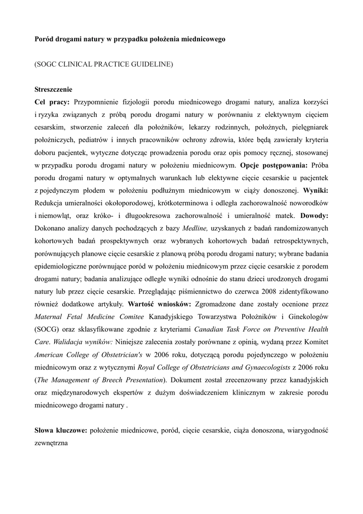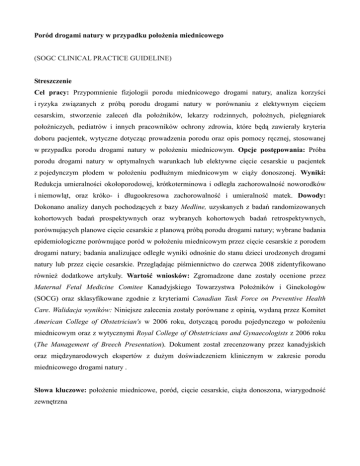 Poród drogami natury w przypadku położenia miednicowego (SOGC CLINICAL PRACTICE GUIDELINE) Streszczenie Cel pracy: Przypomnienie fizjologii porodu miednicowego drogami natury, analiza korzyści i ryzyka związanych z próbą porodu drogami natury w porównaniu z elektywnym cięciem cesarskim, stworzenie zaleceń dla położników, lekarzy rodzinnych, położnych, pielęgniarek położniczych, pediatrów i innych pracowników ochrony zdrowia, które będą zawierały kryteria doboru pacjentek, wytyczne dotycząc prowadzenia porodu oraz opis pomocy ręcznej, stosowanej w przypadku porodu drogami natury w położeniu miednicowym. Opcje postępowania: Próba porodu drogami natury w optymalnych warunkach lub elektywne cięcie cesarskie u pacjentek z pojedynczym płodem w położeniu podłużnym miednicowym w ciąży donoszonej. Wyniki: Redukcja umieralności okołoporodowej, krótkoterminowa i odległa zachorowalność noworodków i niemowląt, oraz króko- i długookresowa zachorowalność i umieralność matek. Dowody: Dokonano analizy danych pochodzących z bazy Medline, uzyskanych z badań randomizowanych kohortowych badań prospektywnych oraz wybranych kohortowych badań retrospektywnych, porównujących planowe cięcie cesarskie z planową próbą porodu drogami natury; wybrane badania epidemiologiczne porównujące poród w położeniu miednicowym przez cięcie cesarskie z porodem drogami natury; badania analizujące odległe wyniki odnośnie do stanu dzieci urodzonych drogami natury lub przez cięcie cesarskie. Przeglądając piśmiennictwo do czerwca 2008 zidentyfikowano również dodatkowe artykuły. Wartość wniosków: Zgromadzone dane zostały ocenione przez Maternal Fetal Medicine Comitee Kanadyjskiego Towarzystwa Położników i Ginekologów (SOCG) oraz sklasyfikowane zgodnie z kryteriami Canadian Task Force on Preventive Health Care. Walidacja wyników: Niniejsze zalecenia zostały porównane z opinią, wydaną przez Komitet American College of Obstetrician's w 2006 roku, dotyczącą porodu pojedynczego w położeniu miednicowym oraz z wytycznymi Royal College of Obstetricians and Gynaecologists z 2006 roku (The Management of Breech Presentation). Dokument został zrecenzowany przez kanadyjskich oraz międzynarodowych ekspertów z dużym doświadczeniem klinicznym w zakresie porodu miednicowego drogami natury . Słowa kluczowe: położenie miednicowe, poród, cięcie cesarskie, ciąża donoszona, wiarygodność zewnętrzna