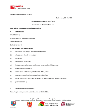 Zapytanie ofertowe nr 3/Z2/2016 Bodzentyn , 16. 05.2016 Zapytanie ofertowe nr 3/Z2/2016 zapraszam do złożenia oferty na: 14 urządzeń odtwarzających audioprzewodniki I. Zamawiający: Witold Wilkosz Przedsiębiorstwo Usługowo Handlowe 26-010 Bodzentyn Suchedniowska 63 II. Szczegółowa specyfikacja usługi: a) urządzenie posiadające minimum 32GB pamięci b) wbudowany głośnik wewnętrzny c) słuchawki d) wbudowany akumulator e) ładowanie przez komputer lub ładowarką z gniazdka elektrycznego a) menu w języku angielskim b) odtwarzanie plików muzycznych: MP3, WMA, WAV c) equalizer: normal, rock, pop, classic, soft, jazz, basy d) tryby odtwarzania: normalnie, powtórz raz, powtórz katalog, powtórz wszystko e) gwarancja 12m-cy 1. Termin realizacji zamówienia: Termin wykonania przedmiotu zamówienia do 15.06.2016r. Projekt współfinansowany przez Szwajcarię w ramach szwajcarskiego programu współpracy z nowymi krajami członkowskimi Unii Europejskiej III. Wymagania odnośnie przedmiotu zamówienia– warunki udziału oferty w ocenie: 1. Wykonawca musi posiadać uprawnienia do wykonywania określonej działalności lub czynności, jeżeli ustawy nakładają obowiązek posiadania takich uprawnień, 2. Wykonawca musi posiadać niezbędną wiedzę i doświadczenie oraz potencjał techniczny, a także dysponować osobami zdolnymi do wykonywania zamówienia, znajdować się w sytuacji ekonomicznej i finansowej zapewniającej wykonanie zamówienia. IV. Kryteria oceny ofert: 1. Kryterium oceny oferty jest: • cena (100% oceny) 2. Zamawiający dokona oceny i porównania ofert oraz wyboru najkorzystniejszej oferty spełniającej wszystkie wymagania zgodnie z pkt. III niniejszego zapytania ofertowego. 3. Wykonawca może zaproponować tylko jedną cenę i nie może jej zmienić po złożeniu oferty. V. Forma i termin składania ofert: 1. Oferty należy składać listownie, emailowo lub osobiście na adres: Witold Wilkosz Przedsiębiorstwo Usługowo Handlowe 26-010 Bodzentyn Suchedniowska 63 [email protected] w nieprzekraczalnym terminie do 29.05.2016 r. do godziny 15.00 Liczy się data wpływu oferty. Oferty złożone po w/w terminie nie będą rozpatrywane. 2. Ofertę należy sporządzić w języku polskim. 3. Ceny muszą być zaokrąglone do dwóch miejsc po przecinku. Projekt współfinansowany przez Szwajcarię w ramach szwajcarskiego programu współpracy z nowymi krajami członkowskimi Unii Europejskiej 4.Wszystkie koszty związane z realizacją niniejszego zamówienia powinny być skalkulowane w cenie oferty. 5. Ceny muszą być wyrażone w wartościach netto i brutto. 6. Oferta przesłana drogą emailową musi mieć formę skanu i zawierać pieczątkę oraz podpis Wykonawcy. Oferty sporządzone w formie papierowej także muszą posiadać pieczątkę oraz podpis Wykonawcy. VI. Informacje dotyczące wyboru najkorzystniejszej oferty: 1. O wyborze najkorzystniejszej oferty Zamawiający zawiadomi telefonicznie/e-mailowo Wykonawcę, którego oferta została wybrana. 2. Oferta nie spełniająca wymogów formalnych określonych niniejszym zapytaniem podlega odrzuceniu. 3. Zamawiający zastrzega sobie prawo do unieważnienia postępowania bez podania przyczyn. 4. Zawarcie umowy z wybranym Wykonawcą nastąpi bez zbędnej zwłoki, jednak nie później niż w terminie 2 tygodni od dnia wyboru najkorzystniejszej oferty. 5. Zamówienie będzie realizowane na podstawie umowy. Po zrealizowaniu zamówienia i otrzymaniu przez Zamawiającego poprawnie wystawionej faktury VAT, zostanie dokonana płatność przelewem w terminie do 14 dni na rachunek bankowy Wykonawcy. Zamawiający dopuszcza możliwość wpłaty zaliczki do wysokości maksymalnie 30% wartości realizowanego zamówienia. 6. Płatność dokonywana będzie w polskich złotych. …………………………… (pieczątka i podpis) Projekt współfinansowany przez Szwajcarię w ramach szwajcarskiego programu współpracy z nowymi krajami członkowskimi Unii Europejskiej Załącznik nr 1. Wzór Formularza Oferty OFERTA (pieczęć Wykonawcy/Wykonawców) Witold Wilkosz Przedsiębiorstwo Usługowo Handlowe 26-010 Bodzentyn Suchedniowska 63 W odpowiedzi na zaproszenie do złożenia ofert cenowej z dnia 09.05.2016 Dotyczące: Zakupu 14 urządzeń odtwarzających audioprzweodniki MY NIŻEJ PODPISANI …………………………………………………………………………………………………………………………………………………………… …………………………………………………………………………………………………………………………………………………………… działając w imieniu i na rzecz …………………………………………………………………………………………………………………………………………………………… …………………………………………………………………………………………………………………………………………………………… (nazwa (firma) dokładny adres Wykonawcy/Wykonawców) (w przypadku składania oferty przez podmioty występujące wspólnie podać nazwy (firmy) i dokładne adresy wszystkich wspólników spółki cywilnej lub członków konsorcjum) Projekt współfinansowany przez Szwajcarię w ramach szwajcarskiego programu współpracy z nowymi krajami członkowskimi Unii Europejskiej 1. SKŁADAMY OFERTĘ na wykonanie przedmiotu zamówienia zgodnie z treścią zapytania ofertowego. 2. OŚWIADCZAMY, że zapoznaliśmy się z treścią Zapytania ofertowego oraz wyjaśnieniami i zmianami w Zapytaniu ofertowym przekazanymi przez Zamawiającego i uznajemy się za związanymi określonymi w nich postanowieniami i zasadami postępowania. 3. OFERUJEMY wykonanie przedmiotu zamówienia za cenę brutto ………………………..…………… zł. (słownie złotych:………………………………………………………………