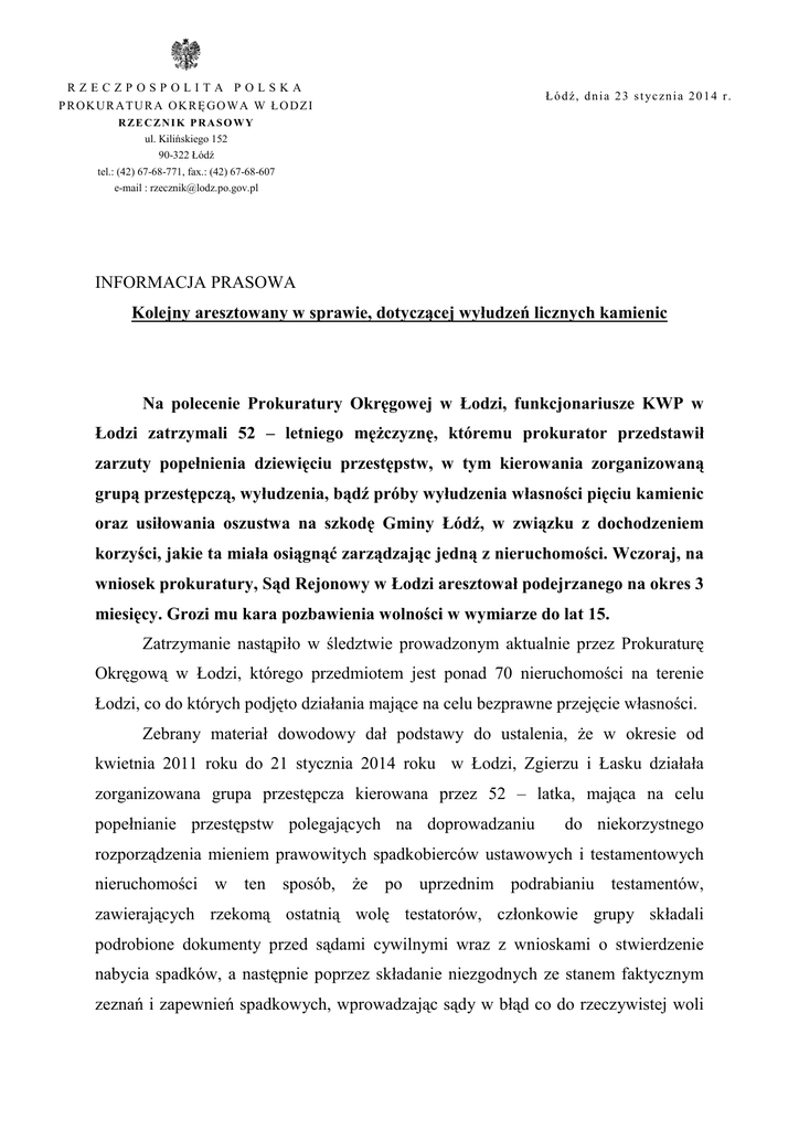 RZECZPOSPOLITA POLSKA PROKURATURA OKRĘGOWA W ŁODZI Łódź, dnia 23 stycznia 2014 r. RZE CZNIK PRASOWY ul. Kilińskiego 152 90-322 Łódź tel.: (42) 67-68-771, fax.: (42) 67-68-607 e-mail : [email protected] INFORMACJA PRASOWA Kolejny aresztowany w sprawie, dotyczącej wyłudzeń licznych kamienic Na polecenie Prokuratury Okręgowej w Łodzi, funkcjonariusze KWP w Łodzi zatrzymali 52 – letniego mężczyznę, któremu prokurator przedstawił zarzuty popełnienia dziewięciu przestępstw, w tym kierowania zorganizowaną grupą przestępczą, wyłudzenia, bądź próby wyłudzenia własności pięciu kamienic oraz usiłowania oszustwa na szkodę Gminy Łódź, w związku z dochodzeniem korzyści, jakie ta miała osiągnąć zarządzając jedną z nieruchomości. Wczoraj, na wniosek prokuratury, Sąd Rejonowy w Łodzi aresztował podejrzanego na okres 3 miesięcy. Grozi mu kara pozbawienia wolności w wymiarze do lat 15. Zatrzymanie nastąpiło w śledztwie prowadzonym aktualnie przez Prokuraturę Okręgową w Łodzi, którego przedmiotem jest ponad 70 nieruchomości na terenie Łodzi, co do których podjęto działania mające na celu bezprawne przejęcie własności. Zebrany materiał dowodowy dał podstawy do ustalenia, że w okresie od kwietnia 2011 roku do 21 stycznia 2014 roku w Łodzi, Zgierzu i Łasku działała zorganizowana grupa przestępcza kierowana przez 52 – latka, mająca na celu popełnianie przestępstw polegających na doprowadzaniu do niekorzystnego rozporządzenia mieniem prawowitych spadkobierców ustawowych i testamentowych nieruchomości w ten sposób, że po uprzednim podrabianiu testamentów, zawierających rzekomą ostatnią wolę testatorów, członkowie grupy składali podrobione dokumenty przed sądami cywilnymi wraz z wnioskami o stwierdzenie nabycia spadków, a następnie poprzez składanie niezgodnych ze stanem faktycznym zeznań i zapewnień spadkowych, wprowadzając sądy w błąd co do rzeczywistej woli 2 rozporządzenia majątkiem przez spadkodawców, uzyskiwali niezgodne ze stanem faktycznym postanowienia o stwierdzeniu nabycia spadków na podstawie których wyłudzali i usiłowali wyłudzić własność udziałów w nieruchomościach położonych na terenie Łodzi. Do czasu zatrzymania aresztowanego wczoraj mężczyzny, w sprawie tej zarzuty przedstawiono 16 osobom w wieku od 29 do 85 lat, w tym dziesięciu mężczyznom i sześciu kobietom. Wszyscy oni podejrzani są o udział w zorganizowanej grupie przestępczej i wyłudzenia, bądź ich usiłowania. Jeden z podejrzanych – 55 – letni mężczyzna – od kwietnia 2013 roku jest tymczasowo aresztowany. Podejrzany jest o popełnienie 29 przestępstw, w tym oszustw w odniesieniu do 13 łódzkich nieruchomości. Niezależnie od działań karnych, w oparciu o zebrane w śledztwie dowody Prokuratura Okręgowa w Łodzi podejmuje liczne działania pozakarne, mające na celu przywrócenie prawidłowego stanu prawnego i wyeliminowanie z „obiegu” orzeczeń sądowych stwierdzających nabycie spadku przez osoby nieuprawnione. Tego typu działania podejmowane były dotychczas w odniesieniu do 13 nieruchomości. Polegają one w szczególności na zgłaszaniu przez prokuratora udziału w postępowaniach, dotyczących stwierdzenia nabycia spadku, kierowaniu skarg o wznowienie postępowań i wniosków o zmianę postanowień stwierdzających nabycie spadku na podstawie podrobionych testamentów. Dotychczas w dwóch sprawach, w których brał udział prokurator zapadły prawomocne orzeczenia sądowe. Mimo szerokiego zakresu śledztwo w dalszym ciągu ma charakter rozwojowy. Trwają badania dokumentów. Podczas czynności zrealizowanych w ostatnich dniach przez policję na polecenie prokuratora, zabezpieczono szereg kolejnych materiałów, które poddane zostaną specjalistycznym ekspertyzom. Rzecznik Prasowy Prokuratury Okręgowej w Łodzi Krzysztof Kopania