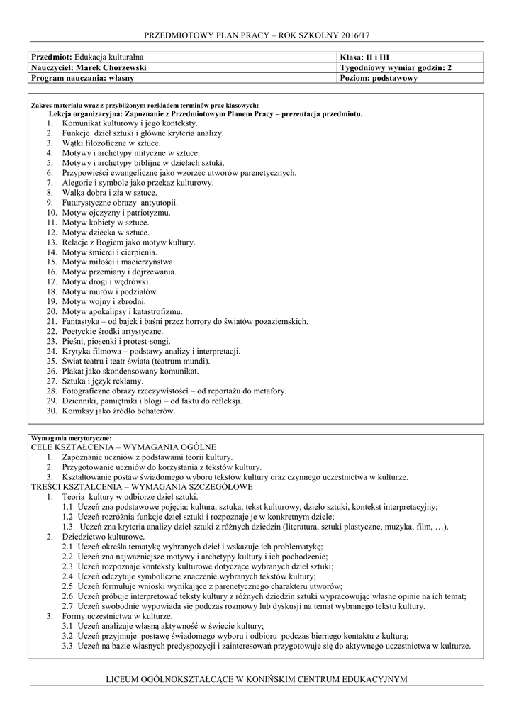 PRZEDMIOTOWY PLAN PRACY – ROK SZKOLNY 2016/17 Przedmiot: Edukacja kulturalna Nauczyciel: Marek Chorzewski Program nauczania: własny Klasa: II i III Tygodniowy wymiar godzin: 2 Poziom: podstawowy Zakres materiału wraz z przybliżonym rozkładem terminów prac klasowych: Lekcja organizacyjna: Zapoznanie z Przedmiotowym Planem Pracy – prezentacja przedmiotu. 1. 2. 3. 4. 5. 6. 7. 8. 9. 10. 11. 12. 13. 14. 15. 16. 17. 18. 19. 20. 21. 22. 23. 24. 25. 26. 27. 28. 29. 30. Komunikat kulturowy i jego konteksty. Funkcje dzieł sztuki i główne kryteria analizy. Wątki filozoficzne w sztuce. Motywy i archetypy mityczne w sztuce. Motywy i archetypy biblijne w dziełach sztuki. Przypowieści ewangeliczne jako wzorzec utworów parenetycznych. Alegorie i symbole jako przekaz kulturowy. Walka dobra i zła w sztuce. Futurystyczne obrazy antyutopii. Motyw ojczyzny i patriotyzmu. Motyw kobiety w sztuce. Motyw dziecka w sztuce. Relacje z Bogiem jako motyw kultury. Motyw śmierci i cierpienia. Motyw miłości i macierzyństwa. Motyw przemiany i dojrzewania. Motyw drogi i wędrówki. Motyw murów i podziałów. Motyw wojny i zbrodni. Motyw apokalipsy i katastrofizmu. Fantastyka – od bajek i baśni przez horrory do światów pozaziemskich. Poetyckie środki artystyczne. Pieśni, piosenki i protest-songi. Krytyka filmowa – podstawy analizy i interpretacji. Świat teatru i teatr świata (teatrum mundi). Plakat jako skondensowany komunikat. Sztuka i język reklamy. Fotograficzne obrazy rzeczywistości – od reportażu do metafory. Dzienniki, pamiętniki i blogi – od faktu do refleksji. Komiksy jako źródło bohaterów. Wymagania merytoryczne: CELE KSZTAŁCENIA – WYMAGANIA OGÓLNE 1. Zapoznanie uczniów z podstawami teorii kultury. 2. Przygotowanie uczniów do korzystania z tekstów kultury. 3. Kształtowanie postaw świadomego wyboru tekstów kultury oraz czynnego uczestnictwa w kulturze. TREŚCI KSZTAŁCENIA – WYMAGANIA SZCZEGÓŁOWE 1. Teoria kultury w odbiorze dzieł sztuki. 1.1 Uczeń zna podstawowe pojęcia: kultura, sztuka, tekst kulturowy, dzieło sztuki, kontekst interpretacyjny; 1.2 Uczeń rozróżnia funkcje dzieł sztuki i rozpoznaje je w konkretnym dziele; 1.3 Uczeń zna kryteria analizy dzieł sztuki z różnych dziedzin (literatura, sztuki plastyczne, muzyka, film, …). 2. Dziedzictwo kulturowe. 2.1 Uczeń określa tematykę wybranych dzieł i wskazuje ich problematykę; 2.2 Uczeń zna najważniejsze motywy i archetypy kultury i ich pochodzenie; 2.3 Uczeń rozpoznaje konteksty kulturowe dotyczące wybranych dzieł sztuki; 2.4 Uczeń odczytuje symboliczne znaczenie wybranych tekstów kultury; 2.5 Uczeń formułuje wnioski wynikające z parenetycznego charakteru utworów; 2.6 Uczeń próbuje interpretować teksty kultury z różnych dziedzin sztuki wypracowując własne opinie na ich temat; 2.7 Uczeń swobodnie wypowiada się podczas rozmowy lub dyskusji na temat wybranego tekstu kultury. 3. Formy uczestnictwa w kulturze. 3.1 Uczeń analizuje własną aktywność w świecie kultury; 3.2 Uczeń przyjmuje postawę świadomego wyboru i odbioru podczas biernego kontaktu z kulturą; 3.3 Uczeń na bazie własnych predyspozycji i zainteresowań przygotowuje się do aktywnego uczestnictwa w kulturze. LICEUM OGÓLNOKSZTAŁCĄCE W KONIŃSKIM CENTRUM EDUKACYJNYM PRZEDMIOTOWY PLAN PRACY – ROK SZKOLNY 2016/17 SPOSÓB REALIZACJI Prezentacja tekstów kultury z różnych epok i dziedzin sztuki w celu wprowadzenia i zastosowania pojęć z teorii kultury i wdrożenia do samodzielnego odbioru dzieł sztuki. Nawiązanie do treści zrealizowanych na lekcjach języka polskiego, wiedzy o kulturze, historii, historii i społeczeństwa. Wykorzystać treści i kształtowane umiejętności do przygotowania ucznia do udziału w egzaminie maturalnym ustnym z języka polskiego poprzez samodzielne opracowywanie tematów i ich prezentację. Podręczniki obowiązkowe: bez podręcznika Zalecane dodatkowe pomoce dydaktyczne: zestaw kart pracy Wymagania formalne: komplet kart pracy Frekwencja: minimum 50%, aby być klasyfikowanym; ponad 90% gwarantuje ocenę pozytywną. Formy sprawdzania wiadomości: Inne źródła oceny do wyboru przez nauczyciela: Prace klasowe poprzedzone lekcją powtórzeniową, zapowiadane z tygodniopraca domowa, wym wyprzedzeniem, referaty i prezentacje uczniowskie Kartkówka może odbyć się bez zapowiadania obejmuje 3 ostatnie jednostki udział w konkursach lub olimpiadach przedmiotowych, lekcyjne, może mieć formę testu, czas jej trwania jest nie dłuższy niż 15 minut, projekty przedmiotowe lub interdyscyplinarne Odpowiedź ustna lub praca na lekcji wykonywanie pomocy szkolnych, Uwagi o ocenianiu: uczeń raz w semestrze może zgłosić nieprzygotowanie do lekcji ( nie dotyczy to zapowiedzianych prac kontrolnych i kartkówek), jeżeli z przyczyn usprawiedliwionych uczeń nie może przystąpić do pracy kontrolnej z całą klasą, to powinien uczynić to w terminie wyznaczonym przez nauczyciela ( w przeciwnym razie otrzyma ocenę niedostateczną), w przypadku nieusprawiedliwionej nieobecności na pracy kontrolnej uczeń otrzymuje ocenę niedostateczną, LICEUM OGÓLNOKSZTAŁCĄCE W KONIŃSKIM CENTRUM EDUKACYJNYM