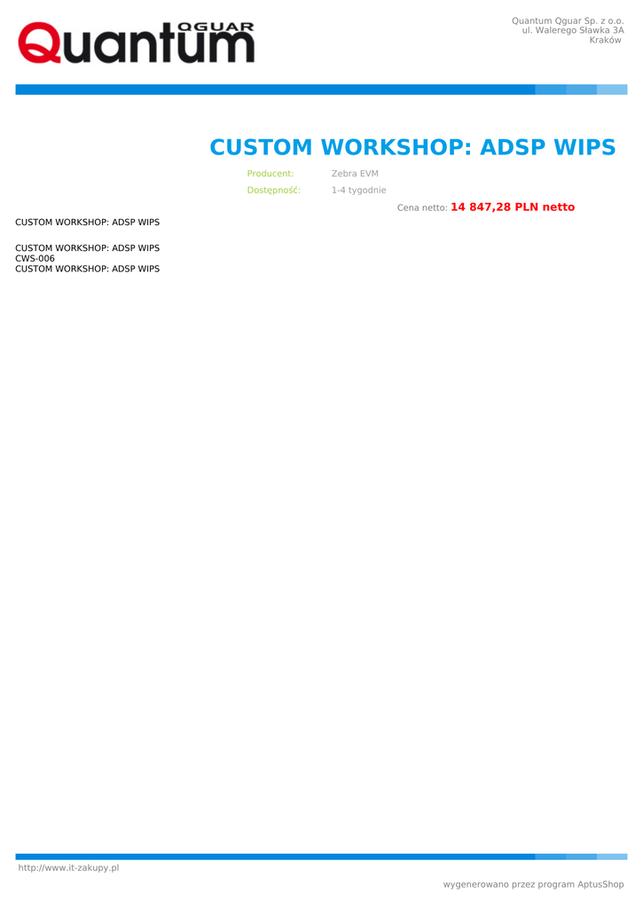 Quantum Qguar Sp. z o.o. ul. Walerego Sławka 3A Kraków CUSTOM WORKSHOP: ADSP WIPS Producent: Zebra EVM Dostępność: 1-4 tygodnie Cena netto: 14 847,28 PLN netto CUSTOM WORKSHOP: ADSP WIPS CUSTOM WORKSHOP: ADSP WIPS CWS-006 CUSTOM WORKSHOP: ADSP WIPS http://www.it-zakupy.pl wygenerowano przez program AptusShop