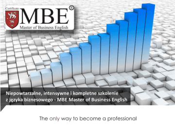 Niepowtarzalne, intensywne i kompletne szkolenie z języka biznesowego - MBE Master of Business English Certyfikat MBE Master of Business English* Oznacza skuteczne posługiwanie się obszernym językiem angielskim na poziomie biznesowozawodowym. Pozwala na ubieganie się o pracę w międzynarodowym środowisku, gdzie język angielski jest codziennym narzędziem komunikacji. Oznacza, że absolwent świadomie i profesjonalnie kieruje swoją karierą zawodową oraz w sposób przemyślany inwestuje w swoje kwalifikacje. * Firma Hutchinson Institute ma wyłączne prawo posługiwania się na terenie RP oznaczeniem „Certificate MBE Master of Business English” COMPANYLOGO Cele ogólne szkolenia MBE Szkolenie MBE adresowane jest do osób pracujących na co dzień w środowisku międzynarodowym, jak również do osób ubiegających się o taką pracę. Głównym celem szkolenia jest rozwinięcie i wykorzystanie wiedzy oraz umiejętności biznesowych w języku angielskim. Dzięki programowi MBE uczestnicy pokonują barierę językową, rozwijają swoje kompetencje językowe i nabywają sprawności płynnej komunikacji w środowisku zawodowym. Formuła szkolenia Szkolenie MBE ma charakter warsztatowy, dzięki czemu uczestnicy poprzez praktyczne zadania efektywnie wykorzystują umiejętności językowe i biznesowe. Program MBE został opracowany przy współpracy wyspecjalizowanych polskich i brytyjskich trenerów biznesu oraz specjalistów od języka angielskiego, tak by język obcy nie był już nigdy przeszkodą w realizowaniu celów zawodowych. COMPANYLOGO Formuła szkolenia Szkolenie MBE obejmuje 160 godzin szkoleniowych, podczas których realizowane są poszczególne bloki tematyczne. 10 weekendowych zjazdów realizowanych co dwa tygodnie w soboty i niedziele po 8 godzin szkoleniowych dziennie. Czas trwania szkolenia – 5 miesięcy. W przerwach pomiędzy zjazdami uczestnicy wykonują ćwiczenia na nowoczesnej platformie e-learningowej. Aby zapewnić maksymalną efektywność, szkolenie prowadzone jest w grupach 8-12 osobowych. Zarządzanie Zasobami Ludzkimi Zarządzanie organizacją Marketing Sprzedaż i obsługa klienta Prowadzenie spotkań Negocjacje Prezentacje Zarządzanie projektami Podróże biznesowe Różnice kulturowe Szkolenie MBE zakończone jest egzaminem sprawdzającym nabyte umiejętności i sprawności językowe, którego zdanie gwarantuje otrzymanie Certyfikatu Master of Business English. COMPANYLOGO Założenia Korzyści Szkolenie MBE odbywa się w trybie weekendowym co 2 tygodnie Dzięki temu w szkoleniu mogą wziąć udział również osoby pracujące Szkolenie MBE to 160 godzin intensywnej nauki, 16 h w weekend, 10 weekendów Dzięki temu obserwujemy widoczną, dużą zmianę jakości języka u Uczestników Szkolenie MBE realizowane jest metodą warsztatową Pozwala to na zaktywizowanie Uczestników i osiągnięcie doskonałych efektów Szkolenie kładzie nacisk na poszerzanie słownictwa biznesowego, komunikację oraz nabycie konkretnych sprawności biznesowych Dzięki temu wyposażamy Uczestników w szeroki zestaw kompetencji, niezbędnych do pracy w międzynarodowym środowisku Kompetencje językowe są nabierane poprzez szereg ćwiczeń interaktywnych, inscenizacji, grywalizacji, videocastów etc. Umożliwia to wytworzenie skutecznych i poprawnych nawyków językowych Szkolenie MBE przewiduje 14 godzin ćwiczeń na nowoczesnej platformie e-learningowej Pozwala to lepiej przyswoić słownictwo i w atrakcyjny sposób zachęcić do regularnego utrwalania materiału Szkolenie MBE skierowane jest głównie do osób dorosłych Metodyka nauczania została opracowana specjalnie dla tej grupy odbiorców MBE to gigantyczny skok w doskonaleniu kompetencji językowych COMPANYLOGO Program MBE obejmuje 160 godzin szkoleniowych I. Zarządzanie zasobami ludzkimi (kariera, profil pracownika, rekrutacja, selekcja, środki motywacyjne) II. Zarządzanie organizacją i zespołem (rodzaje organizacji, struktura firmy, zarządzania, zarządzanie zespołem) role działów, style III. Marketing (rodzaje reklamy i narzędzi promocyjnych, charakterystyka produktu i marki, prezentacja firmy i ofert, uczestnictwo w targach) Program szkolenia IV. Sprzedaż i obsługa klienta (typologia klientów, procedury obsługi klienta, radzenie sobie z zastrzeżeniami, sieć dostaw, obsługa klienta przez telefon, korespondencja handlowa) V. Prezentacje (język prezentacji, komunikacja niewerbalna, estetyka slajdów, otwieranie, prowadzenie, zamykanie prezentacji, udzielanie i unikanie odpowiedzi na pytania) COMPANYLOGO VI. Prowadzenie spotkań (rola prowadzącego, otwieranie, prowadzenie, i zamykanie spotkania, udział w spotkaniu: wyrażanie opinii, aprobaty, niezgody, zgłaszanie propozycji, redagowanie agendy i protokołu ze spotkania) VII. Negocjacje Program szkolenia (budowanie dobrych relacji, techniki negocjacyjne, przygotowanie i prowadzenie negocjacji, asertywność i inicjatywna) VIII. Zarządzanie projektami (terminologia tematyczna, zarządzanie czasem, omawianie wykresu Gannt` a, raportowanie postępów i zgłaszanie problemów w projekcie) IX. Podróże i delegacje (środki transportu, zakwaterowanie, udogodnienia hotelowo-konferencyjne, planowanie i realizacja eventów) X. Różnice kulturowe (zachowania typowe dla kultur świata, jęz. potoczny, rozmowy kuluarowe) COMPANYLOGO Harmonogram szkolenia - Warszawa Terminy zjazdów: Szczegółowy plan dnia szkoleniowego: I. 11-12.02.2017r. 9.00 - 10.30 szkolenie II. 25-26.02.2017r. 10.30 - 10:45 przerwa kawowa III. 11-12.03.2017r. IV. 25-26.03.2017r. 10.45 - 12.15 szkolenie 12.15 - 12.45 przerwa obiadowa* 12.45 - 14.15 szkolenie V. 08-09.04.2017r. 14.15 - 14.30 przerwa kawowa VI. 22-23.04.2017r. 14.30 - 16.00 szkolenie VII. 06-07.05.2017r. VIII. 20-21.05.2017r. IX. 10-11.06.2017r. X. 24-25.06.2017r. * Lunch we własnym zakresie lub istnieje możliwość zamówienia obiadu (za dodatkową opłatą 15,00 PLN za dzień szkoleniowy) Lokalizacja Cube C