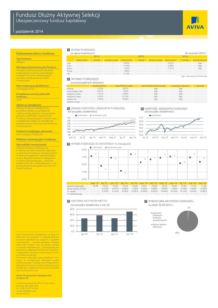 Fundusz Dłużny Aktywnej Selekcji Ubezpieczeniowy fundusz kapitałowy do Ogólnych Warunków Ubezpieczenia Inwestycyjnego BONUS VIP BVIP/J/6/2008 „Oferta Specjalna Ubezpieczenia Inwestycyjnego Bonus VIP” październik 2014 Podstawowe dane o funduszu Typ funduszu: obligacji Dla kogo przeznaczony jest fundusz: Fundusz przeznaczony jest dla osób oczekujących wzrostu oszczędności w długim terminie i akceptujących okresowo podwyższone ryzyko inwestycyjne. Data rozpoczęcia działalności: 5 listopada 2012 r. Początkowa wartość jednostki funduszu: 10 zł Opłata za zarządzanie: Aktywa funduszu obciążone są pośrednio opłatą za zarządzanie i administrację poprzez inwestowanie głównie w jednostki uczestnictwa funduszy inwestycyjnych, których ceny uwzględniają opłaty za zarządzanie pobierane przez towarzystwa funduszy inwestycyjnych. Podmiot zarządzający aktywami: Aviva Investors Poland SA Polityka inwestycyjna funduszu Opis polityki inwestycyjnej: Aktywa funduszu lokowane są w sposób pośredni (poprzez jednostki uczestnictwa funduszy inwestycyjnych) w dłużnych papierach wartościowych, w tym długoterminowych obligacjach o stałym oprocentowaniu, zarówno skarbowych, jak i nieskarbowych, czyli emitowanych przez podmioty inne niż Skarb Państwa. 1 WYNIKI FUNDUSZU (w ujęciu kwartalnym) 2012 stopa zwrotu I kw. II kw. III kw. IV kw. rok 30 wrzesień 2014 r. 2014 2013 ranking pozycja w grupie - stopa zwrotu - ranking pozycja w grupie 0,00% -0,75% 1,00% 1,85% 2,10% stopa zwrotu - ranking pozycja w grupie 0,81% 2,68% 1,51% - bgp bgp bgp bgp - brak grupy porównawczej 2 WYNIKI FUNDUSZU (w poszczególnych okresach) stopa zwrotu miesiąc od początku roku ostatnie 3 mies. ostatnie 6 mies. ostatni rok ostatnie 3 lata benchmark rynek 0,35% 5,07% 1,51% 4,22% 7,02% - subfundusz pozycja w grupie bgp bgp bgp bgp bgp - 3 ZMIANA WARTOŚCI JEDNOSTKI FUNDUSZU (od początku działalności) 110 108 106 104 102 100 98 wrz 13 benchmark konkurencja 0,87% 7,26% 2,59% 6,19% 8,99% - ranking bgp bgp bgp bgp bgp - 4 WARTOŚĆ JEDNOSTKI FUNDUSZU (od początku działalności) benchmark rynek subfundusz 11,0 10,8 10,6 10,4 10,2 lis 13 sty 14 mar 14 maj 14 lip 14 wrz 14 10,0 lis 12 lut 13 cze 13 paź 13 lut 14 cze 14 maj 14 cze 14 lip 14 sie 14 10,92 0,18% -0,12% - 11,02 0,96% -0,43% - wrz 14 5 WYNIKI FUNDUSZU W OSTATNICH 12 miesiącach subfundusz benchmark rynek 2,0% 1,0% 0,0% -1,0% -2,0% paź 13 wartość jednostki stopa zwrotu (PLN) +/- rynek +/- konkurencja 10,45 - lis 13 10,43 -0,19% 0,43% - gru 13 10,53 0,91% 0,14% - sty 14 lut 14 mar 14 kwi 14 10,44 -0,85% 0,30% - 10,58 1,39% -0,05% - 6 HISTORIA AKTYWÓW NETTO 10,61 0,29% -0,45% - 10,69 0,69% -0,22% - 10,78 0,89% -0,44% - 10,90 1,08% -0,16% - 7 STRUKTURA AKTYWÓW FUNDUSZU na dzień 30.06.2014 r. (od początku działalności w mln zł) 2% 80,0 40,0 jednostki krajowych funduszy inwestycyjnych 20,0 dłużne papiery skarbowe 60,0 0,0 Aviva Towarzystwo Ubezpieczeń na Życie SA informuje, że inwestycje w ubezpieczeniowe fundusze kapitałowe są związane z ryzykiem inwestycyjnym – wartość jednostek funduszy może ulec zmianie wraz ze zmianą sytuacji na rynkach kapitałowych, a Towarzystwo nie gwarantuje osiągnięcia określonych wyników, z wyłączeniem gwarancji dotyczących Funduszu Gwarantowanego. Informacje dotyczące poszczególnych funduszy, w szczególności dotyczące ryzyka inwestycyjnego, znajdują się w Regulaminie Ubezpieczeniowych Funduszy Kapitałowych dostępnym u agentów Avivy oraz na stronie www.avivainvestors.pl Aviva Towarzystwo Ubezpieczeń na Życie SA ul. Domaniewska 44, 02-672 Warszawa, infolinia: 801 888 444, tel. +48 22 557 44 44, e-mail: [email protected], www.aviva.pl gru 12 cze 13 gru 13 cze 14 98% wrz 14 11,06 0,35% -0,52% - Podstawowe pojęcia do Ogólnych Warunków Ubezpieczenia Inwestycyjnego BONUS VIP BVIP/J/6/2008 „Oferta Specjalna Ubezpieczenia Inwestycyjnego Bonus VIP” Benchmark Modified Duration (MD) Wzorzec służący porównawczej ocenie wyników inwestycyjnych. Jako benchmark mogą służyć Określa wrażliwość dłużnego papieru wartościowego na zmiany rynkowych stóp procentowych. między innymi: indeks giełdowy, inflacja, rentowność określonych bonów skarbowych lub ich Im wyższa jego wartość, tym cena obligacji jest bardziej wrażliwa na zmiany stóp procentowych. odpowiednie kombinacje. Z reguły każdy zarządzający określa swój własny benchmark, z którym Na przykład, jeśli MD wynosi 2, to wzrost rynkowych stóp procentowych o jeden punkt chce porównywać efekty swoich inwestycji. Na potrzeby obiektywnej oceny wyników funduszy procentowy spowoduje spadek wartości obligacji o około 2%. Podawane w raportach MD portfela prowadzących podobną politykę inwestycyjną w raporcie zostały zastosowane następujące dłużnego funduszu liczone jest jako średnia ważona udziałem w portfelu parametrów MD dla benchamarki: benchmark rynek i benchmark konkurencja. poszczególnych składników portfela. Benchmark konkurencja Ranking (ciemnoszare kwadraty) Grupa porównawcza została stworzona w oparciu o klasyfikację funduszy przygotowaną i Prezentowany ranking stóp zwrotu w ujęciu kwartylowym oznacza przyporządkowanie stopy prowadzoną przez Analizy Online Sp. z o.o. na podstawie strategii inwestycyjnej poszczególnych zwrotu danego funduszu do kolejnych grup obejmujących po 25% porównywalnych funduszy funduszy. Do grup porównawczych wg. Analiz Online zostały wprowadzone modyfikacje uszeregowanych pod względem stopy zwrotu. Przykładowo pozycja w pierwszym kwartylu wyłączenia lub włączenia funduszy, które spełniły poniższe warunki: (graficznie cztery kwadraty) oznacza umiejscowienie wśród 25% najlepszych funduszy pod 1) Wyłączono fundusze nie wyceniające aktywów na bazie dziennej względem stopy zwrotu. Z kolei pozycja w czwartym kwartylu (graficznie jeden kwadrat) oznacza 2) Wyłączono fundusze UFK inwestujące poprzez fundusze TFI. Włączono 