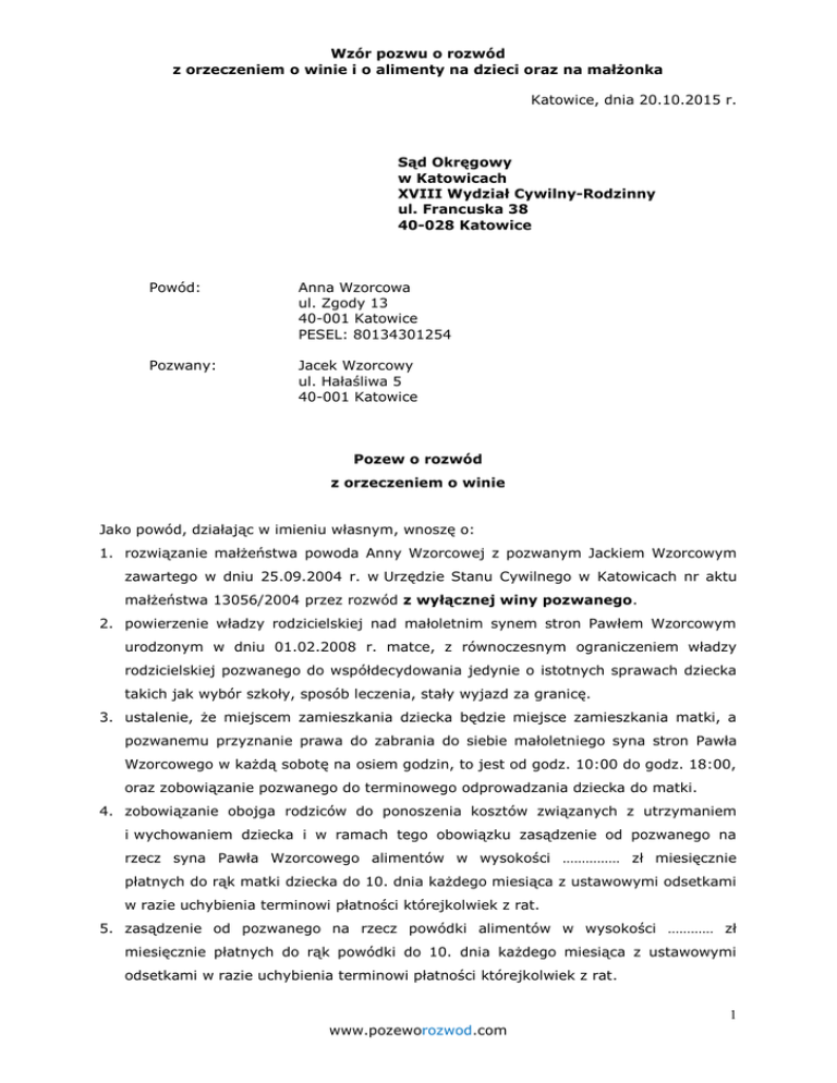 Wzór pozwu o rozwód z orzeczeniem o winie i o alimenty na dzieci oraz na małżonka Katowice, dnia 20.10.2015 r. Sąd Okręgowy w Katowicach XVIII Wydział Cywilny-Rodzinny ul. Francuska 38 40-028 Katowice Powód: Anna Wzorcowa ul. Zgody 13 40-001 Katowice PESEL: 80134301254 Pozwany: Jacek Wzorcowy ul. Hałaśliwa 5 40-001 Katowice Pozew o rozwód z orzeczeniem o winie Jako powód, działając w imieniu własnym, wnoszę o: 1. rozwiązanie małżeństwa powoda Anny Wzorcowej z pozwanym Jackiem Wzorcowym zawartego w dniu 25.09.2004 r. w Urzędzie Stanu Cywilnego w Katowicach nr aktu małżeństwa 13056/2004 przez rozwód z wyłącznej winy pozwanego. 2. powierzenie władzy rodzicielskiej nad małoletnim synem stron Pawłem Wzorcowym urodzonym w dniu 01.02.2008 r. matce, z równoczesnym ograniczeniem władzy rodzicielskiej pozwanego do współdecydowania jedynie o istotnych sprawach dziecka takich jak wybór szkoły, sposób leczenia, stały wyjazd za granicę. 3. ustalenie, że miejscem zamieszkania dziecka będzie miejsce zamieszkania matki, a pozwanemu przyznanie prawa do zabrania do siebie małoletniego syna stron Pawła Wzorcowego w każdą sobotę na osiem godzin, to jest od godz. 10:00 do godz. 18:00, oraz zobowiązanie pozwanego do terminowego odprowadzania dziecka do matki. 4. zobowiązanie obojga rodziców do ponoszenia kosztów związanych z utrzymaniem i wychowaniem dziecka i w ramach tego obowiązku zasądzenie od pozwanego na rzecz syna Pawła Wzorcowego alimentów w wysokości …………… zł miesięcznie płatnych do rąk matki dziecka do 10. dnia każdego miesiąca z ustawowymi odsetkami w razie uchybienia terminowi płatności którejkolwiek z rat. 5. zasądzenie od pozwanego na rzecz powódki alimentów w wysokości ………… zł miesięcznie płatnych do rąk powódki do 10. dnia każdego miesiąca z ustawowymi odsetkami w razie uchybienia terminowi płatności którejkolwiek z rat. 1 www.pozeworozwod.com 6. wezwanie na rozprawę następujących świadków: Andrzej Świadkowicz, wezwanie na adres: ul. Wizjonerów 2, 44-400 Chorzów, Marta Naoko, wezwanie na adres: ul. Kapeluszników 10, 27-600 Sandomierz. Rafał Abecadłowski, wezwanie na adres: ul. Młodych 1/3, 00-950 Warszawa, na okoliczności wskazane w uzasadnieniu pozwu. 7. nieorzekanie o sposobie korzystania ze wspólnego mieszkania stron. 8. zasądzenie od pozwanego na rzecz powoda kosztów procesu, według norm przepisanych. Uzasadnienie Strony zawarły związek małżeński w dniu 25.09.2004 r. przed kierownikiem Urzędu Stanu Cywilnego w Katowicach. Dowód: odpis skrócony aktu małżeństwa (oryginał). W dniu 01.02.2008 r. urodził się Paweł Wzorcowy, który jest jedynym wspólnym dzieckiem stron. Małżonkowie nie posiadają innych dzieci. Dowód: odpis skrócony aktu urodzenia dziecka (oryginał). Po zawarciu małżeństwa pożycie małżeńskie początkowo układało się zgodnie. Niestety, od grudnia 2014 roku powódka zauważyła, że pozwany coraz częściej późno wraca z pracy, a nadto zdarzyło się kilka razy że pozwany nie wrócił na noc. Powódka od współpracowników pozwanego z pracy dowiedziała się, że pozwany związał się z inna kobietą. Znajomi pozwanego z pracy opowiedzieli powódce ze szczegółami o spotkaniach pozywanego z inną kobietą. Charakter tych spotkań nie budził żadnych wątpliwości co do tego, że pozwany jest w stałym związku z inną kobietą. Dowód: Zeznania świadków: Andrzej Świadkowicz, wezwanie na adres: ul. Wizjonerów 2, 44-400 Chorzów, Marta Naoko, wezwanie na adres: ul. Kapeluszników 10, 27-600 Sandomierz. Rafał Abecadłowski, wezwanie na adres: ul. Młodych 1/3, 00-950 Warszawa, na okoliczność spotkań pozwanego z inną kobietą niż powódka, charakteru tych spotkań, okresu spotkań, relacji pozwanego do powódki. 2 www.pozeworozwod.com Gdy w styczniu 2015 roku powódka przedstawiła pozwanemu swoją wiedzę o zaangażowaniu pozwanego w inny związek to pozwany do wszystkiego się przyznał i oznajmił, że nie chce już mieszkać z powódką, gdyż faktycznie związał się z inną kobietą. Pozwany pod koniec stycznia 2015 roku wyprowadził się od powódki. Dowód: przesłuchanie stron, na okoliczność relacji pomiędzy małżonkami od daty ślubu do chwili obecnej, w tym na istnienie związku pozwanego z inną kobietą. Strony nie mieszkają wspólnie od prawie roku. Nie prowadzą razem gospodarstwa domowego. Nie dochodzi także do zbliżeń pomiędzy małżonkami. Nie ulega zatem wątpliwości, że doszło do trwałego i zupełnego rozkładu pożycia stron. Ponadto powódka wnosi o powierzenie władzy rodzicielskiej nad małoletnim synem stron Pawłem Wzorcowym urodzonym w dniu 01.02.2008 r. matce, z równoczesnym ograniczeniem władzy rodzicielskiej pozwanego do współdecydowania jedynie o istotnych sprawach dziecka takich jak wybór szkoły, sposób leczenia, stały wyjazd za granicę. Pozwany praktycznie nie zajmuje się dzieckiem. Syn stron ma aktualnie 7 lat i to powódka odrabia lekcje z synem, dba o jego potrzeby, leczy w razie choroby, i codziennie otacza opieką. Dlatego w pełni zasadnym jest ustalenie, że miejscem zamieszkania dziecka będzie miejsce zamieszkania matki, a pozwanemu przyznanie prawa do zabrania do siebie małoletniego syna stron Pawła Wzorcowego w każdą sobotę na osiem godzin, to jest od godz. 10:00 do godz. 18:00, oraz zobowiązanie pozwanego do terminowego odprowadzania dziecka do matki. Jednocześnie wnoszę o zobowiązanie obojga rodziców do ponoszenia kosztów związanych z utrzymaniem i wychowaniem dziecka i w ramach tego obowiązku zasądzenie od pozwanego na rzecz syna Pawła Wzorcowego alimentów w wysokości …………… zł miesięcznie płatnych do rąk matki dziecka do 10. dnia każdego miesiąca z ustawowymi odsetkami w razie uchybienia terminowi płatności którejkolwiek z rat. Wskazane powyżej raty nie są wygórowane i odpowiadają możliwościom zarobkowym pozwanego.