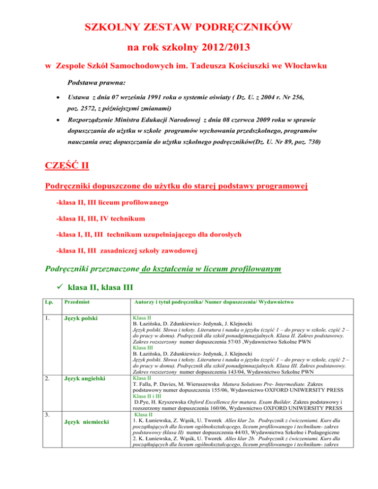 SZKOLNY ZESTAW PODRĘCZNIKÓW na rok szkolny 2012/2013 w Zespole Szkół Samochodowych im. Tadeusza Kościuszki we Włocławku Podstawa prawna: Ustawa z dnia 07 września 1991 roku o systemie oświaty ( Dz. U. z 2004 r. Nr 256, poz. 2572, z późniejszymi zmianami) Rozporządzenie Ministra Edukacji Narodowej z dnia 08 czerwca 2009 roku w sprawie dopuszczania do użytku w szkole programów wychowania przedszkolnego, programów nauczania oraz dopuszczania do użytku szkolnego podręczników(Dz. U. Nr 89, poz. 730) CZĘŚĆ II Podręczniki dopuszczone do użytku do starej podstawy programowej -klasa II, III liceum profilowanego -klasa II, III, IV technikum -klasa I, II, III technikum uzupełniającego dla dorosłych -klasa II, III zasadniczej szkoły zawodowej Podręczniki przeznaczone do kształcenia w liceum profilowanym klasa II, klasa III Lp. Przedmiot Autorzy i tytuł podręcznika/ Numer dopuszczenia/ Wydawnictwo 1. Język polski 2. Język angielski Klasa II B. Łazińska, D. Zdunkiewicz- Jedynak, J. Klejnocki Język polski. Słowa i teksty. Literatura i nauka o języku (część 1 – do pracy w szkole, część 2 – do pracy w domu). Podręcznik dla szkół ponadgimnazjalnych. Klasa II. Zakres podstawowy. Zakres rozszerzony numer dopuszczenia 57/03 ,Wydawnictwo Szkolne PWN Klasa III B. Łazińska, D. Zdunkiewicz- Jedynak, J. Klejnocki Język polski. Słowa i teksty. Literatura i nauka o języku (część 1 – do pracy w szkole, część 2 – do pracy w domu). Podręcznik dla szkół ponadgimnazjalnych. Klasa III. Zakres podstawowy. Zakres rozszerzony numer dopuszczenia 143/04, Wydawnictwo Szkolne PWN Klasa II T. Falla, P. Davies, M. Wieruszewska Matura Solutions Pre- Intermediate. Zakres podstawowy numer dopuszczenia 155/06, Wydawnictwo OXFORD UNIWERSITY PRESS Klasa II i III D.Pye, H. Kryszewska Oxford Excellence for matura. Exam Builder. Zakres podstawowy i rozszerzony numer dopuszczenia 160/06, Wydawnictwo OXFORD UNIWERSITY PRESS Klasa II 1. K. Łuniewska, Z. Wąsik, U. Tworek Alles klar 2a. Podręcznik z ćwiczeniami. Kurs dla początkujących dla liceum ogólnokształcącego, liceum profilowanego i technikum- zakres podstawowy (klasa II) numer dopuszczenia 44/03, Wydawnictwa Szkolne i Pedagogiczne 2. K. Łuniewska, Z. Wąsik, U. Tworek Alles klar 2b. Podręcznik z ćwiczeniami. Kurs dla początkujących dla liceum ogólnokształcącego, liceum profilowanego i technikum- zakres 3. Język niemiecki 4. Język rosyjski 5. Historia 6. Geografia 7. Wiedza o społeczeństwie 8. Wiedza o kulturze 9. Matematyka 10. Fizyka i astronomia 11. Chemia 12. Biologia 13. Technologia informacyjna 14. Przysposobienie obronne 15. Podstawy przedsiębiorczości 16. Religia podstawowy (klasa II) numer dopuszczenia 132/03,Wydawnictwa Szkolne i Pedagogiczne Klasa III K. Łuniewska, Z. Wąsik Alles klar 3a,3b. Podręcznik z ćwiczeniami. Kurs dla początkujących dla liceum ogólnokształcącego, liceum profilowanego i technikum- zakres podstawowy (klasa III) numer dopuszczenia 73/04, Wydawnictwa Szkolne i Pedagogiczne Klasa II M. Zybert Nowyje wstrieczi 2. Kurs dla początkujących. Podręcznik dla klasy II liceum ogólnokształcącego, liceum profilowanego i technikum (kształcenie w zakresie podstawowym) numer dopuszczenia 48/03, Wydawnictwa Szkolne i Pedagogiczne Klasa III M. Zybert Nowyje wstrieczi 3. Kurs dla początkujących. Podręcznik z ćwiczeniami dla klasy III liceum ogólnokształcącego, liceum profilowanego i technikum (kształcenie w zakresie podstawowym) numer dopuszczenia 77/04, Wydawnictwa Szkolne i Pedagogiczne Klasa II B. Burda, B. Halczak, R. M. Józefiak, A. Roszak, M. Szymczak Historia 2. Czasy nowożytne. Zakres podstawowy. Podręcznik dla liceum ogólnokształcącego, liceum profilowanego i technikum numer dopuszczenia 172/03, Wydawnictwo OPERON Klasa III B. Burda, B. Halczak, R. M. Józefiak, M. Szymczak Historia 3. Historia najnowsza. Zakres podstawowy. Podręcznik dla liceum ogólnokształcącego, liceum profilowanego i technikum numer dopuszczenia 427/03, Wydawnictwo OPERON Klasa II J. Kop, M. Kucharska, E. Szkurłat Geografia. Część II. Podręcznik dla liceum ogólnokształcącego, liceum profilowanego i technikum. Zakres podstawowy numer dopuszczenia 76/07, Wydawnictwo Szkolne PWN Klasa III Z. Smutek, J. Maleska, B. Surmacz Wiedza o społeczeństwie. Zakres podstawowy. Podręcznik dla liceum ogólnokształcącego, liceum profilowanego i technikum (wydanie trzecie zmienione) numer dopuszczenia 139/04, Wydawnictwo OPERON Klasa II R. Chymkowski, W. Dudzik, M. Wójtowski Wiedza o kulturze. Kształcenie w zakresie podstawowym i rozszerzonym. Liceum ogólnokształcące, liceum profilowane i technikum numer dopuszczenia 227/03, Wydawnictwa Szkolne i Pedagogiczne Klasa II M. Antek, P. Grabowski, K. Belka Matematyka 2. Prosto do matury. Podręcznik dla liceum ogólnokształcącego, liceum profilowanego i technikum. Kształcenie ogólne w zakresie podstawowym numer dopuszczenia 200/08, Wydawnictwo NOWA ERA Klasa III M. Antek, P. Grabowski, K. Belka Matematyka 3. Prosto do matury. Podręcznik dla liceum ogólnokształcącego, liceum profilowanego i technikum. Kształcenie ogólne w zakresie podstawowym numer dopuszczenia 68/09/S, Wydawnictwo NOWA ERA Klasa II i III M. Kozielski Fizyka i astronomia. Podręcznik. Szkoły ponadgimnazjalne. Zakres podstawowy numer dopuszczenia 145/08, WYDAWNICTWA SZKOLNE PWN Klasa II i III M. Litwin, S. Styka-Wlazło, J. Szymońska Chemia organiczna 2. Podręcznik dla liceum ogólnokształcącego, liceum profilowanego i technikum. Kształcenie ogólne w zakresie podstawowym numer dopuszczenia 166/03,Wydawnictwo NOWA ERA Klasa II J. Balerstet i in. Biologia 2. Zakres podstawowy. Podręcznik dla liceum ogólnokształcącego, liceum profilowanego i technikum numer dopuszczenia 242/03, Wydawnictwo OPERON Klasa II G.Koba Technologia informacyjna dla szkół ponadgimnazjalnych numer dopuszczenia 214/02, Wydawnictwo MIGRA Klasa II 1. M. Goniewicz, A. Nowak