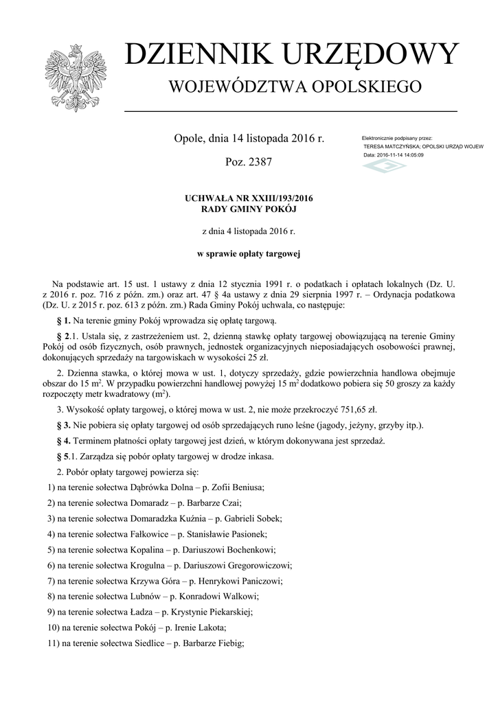 DZIENNIK URZĘDOWY WOJEWÓDZTWA OPOLSKIEGO Opole, dnia 14 listopada 2016 r. Elektronicznie podpisany przez: TERESA MATCZYŃSKA; OPOLSKI URZĄD WOJEWÓDZKI Poz. 2387 Data: 2016-11-14 14:05:09 UCHWAŁA NR XXIII/193/2016 RADY GMINY POKÓJ z dnia 4 listopada 2016 r. w sprawie opłaty targowej Na podstawie art. 15 ust. 1 ustawy z dnia 12 stycznia 1991 r. o podatkach i opłatach lokalnych (Dz. U. z 2016 r. poz. 716 z późn. zm.) oraz art. 47 § 4a ustawy z dnia 29 sierpnia 1997 r. – Ordynacja podatkowa (Dz. U. z 2015 r. poz. 613 z późn. zm.) Rada Gminy Pokój uchwala, co następuje: § 1. Na terenie gminy Pokój wprowadza się opłatę targową. § 2.1. Ustala się, z zastrzeżeniem ust. 2, dzienną stawkę opłaty targowej obowiązującą na terenie Gminy Pokój od osób fizycznych, osób prawnych, jednostek organizacyjnych nieposiadających osobowości prawnej, dokonujących sprzedaży na targowiskach w wysokości 25 zł. 2. Dzienna stawka, o której mowa w ust. 1, dotyczy sprzedaży, gdzie powierzchnia handlowa obejmuje obszar do 15 m2. W przypadku powierzchni handlowej powyżej 15 m2 dodatkowo pobiera się 50 groszy za każdy rozpoczęty metr kwadratowy (m2). 3. Wysokość opłaty targowej, o której mowa w ust. 2, nie może przekroczyć 751,65 zł. § 3. Nie pobiera się opłaty targowej od osób sprzedających runo leśne (jagody, jeżyny, grzyby itp.). § 4. Terminem płatności opłaty targowej jest dzień, w którym dokonywana jest sprzedaż. § 5.1. Zarządza się pobór opłaty targowej w drodze inkasa. 2. Pobór opłaty targowej powierza się: 1) na terenie sołectwa Dąbrówka Dolna – p. Zofii Beniusa; 2) na terenie sołectwa Domaradz – p. Barbarze Czai; 3) na terenie sołectwa Domaradzka Kuźnia – p. Gabrieli Sobek; 4) na terenie sołectwa Fałkowice – p. Stanisławie Pasionek; 5) na terenie sołectwa Kopalina – p. Dariuszowi Bochenkowi; 6) na terenie sołectwa Krogulna – p. Dariuszowi Gregorowiczowi; 7) na terenie sołectwa Krzywa Góra – p. Henrykowi Paniczowi; 8) na terenie sołectwa Lubnów – p. Konradowi Walkowi; 9) na terenie sołectwa Ładza – p. Krystynie Piekarskiej; 10) na terenie sołectwa Pokój – p. Irenie Lakota; 11) na terenie sołectwa Siedlice – p. Barbarze Fiebig; Dziennik Urzędowy Województwa Opolskiego –2– Poz. 2387 12) na terenie sołectwa Zawiść – p. Wacławowi Kocienckiemu; 13) na terenie sołectwa Zieleniec – p. Jadwidze Sowie. 3. Ustala się wynagrodzenie inkasenta, o którym mowa w ust. 2, za pobór opłaty targowej w wysokości 10% pobranych i terminowo odprowadzanych kwot. 4. Inkasent pobierający opłatę targową odprowadza ją, za okresy miesięczne, w terminie do 5 każdego miesiąca za miesiąc poprzedni, na rachunek Gminy Pokój. § 6. Uchyla się uchwałę Rady Gminy Pokój nr XXI/174/2016 z dnia 28 września 2016 r. w sprawie opłaty targowej. § 7. Uchwała podlega publikacji w Dzienniku Urzędowym Województwa Opolskiego i wchodzi w życie z dniem 1 stycznia 2017 r. Przewodniczący Rady Gminy Jacek Gosławski