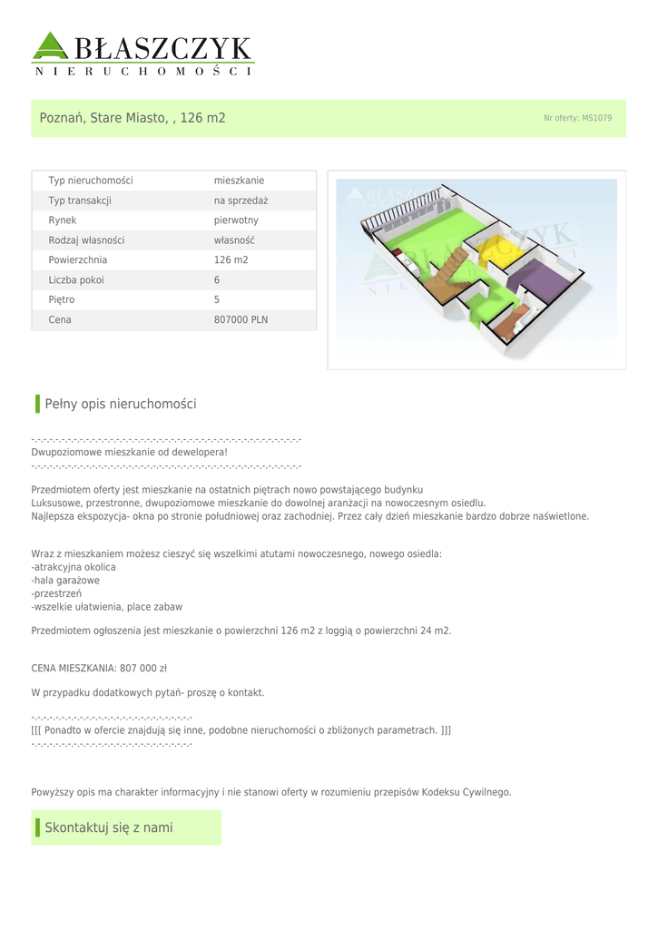 Poznań, Stare Miasto, , 126 m2 Typ nieruchomości mieszkanie Typ transakcji na sprzedaż Rynek pierwotny Rodzaj własności własność Powierzchnia 126 m2 Liczba pokoi 6 Piętro 5 Cena 807000 PLN Nr oferty: MS1079 Pełny opis nieruchomości -.-.-.-.-.-.-.-.-.-.-.-.-.-.-.-.-.-.-.-.-.-.-.-.-.-.-.-.-.-.-.-.-.-.-.-.-.-.-.-.-.-.-.-.Dwupoziomowe mieszkanie od dewelopera! -.-.-.-.-.-.-.-.-.-.-.-.-.-.-.-.-.-.-.-.-.-.-.-.-.-.-.-.-.-.-.-.-.-.-.-.-.-.-.-.-.-.-.-.Przedmiotem oferty jest mieszkanie na ostatnich piętrach nowo powstającego budynku Luksusowe, przestronne, dwupoziomowe mieszkanie do dowolnej aranżacji na nowoczesnym osiedlu. Najlepsza ekspozycja- okna po stronie południowej oraz zachodniej. Przez cały dzień mieszkanie bardzo dobrze naświetlone. Wraz z mieszkaniem możesz cieszyć się wszelkimi atutami nowoczesnego, nowego osiedla: -atrakcyjna okolica -hala garażowe -przestrzeń -wszelkie ułatwienia, place zabaw Przedmiotem ogłoszenia jest mieszkanie o powierzchni 126 m2 z loggią o powierzchni 24 m2. CENA MIESZKANIA: 807 000 zł W przypadku dodatkowych pytań- proszę o kontakt. -.-.-.-.-.-.-.-.-.-.-.-.-.-.-.-.-.-.-.-.-.-.-.-.-.-.[[[ Ponadto w ofercie znajdują się inne, podobne nieruchomości o zbliżonych parametrach. ]]] -.-.-.-.-.-.-.-.-.-.-.-.-.-.-.-.-.-.-.-.-.-.-.-.-.-.- Powyższy opis ma charakter informacyjny i nie stanowi oferty w rozumieniu przepisów Kodeksu Cywilnego. Skontaktuj się z nami Mateusz Tarnowy Numer licencji: e-mail: [email protected] tel: + 48 61 852 68 66 tel: + 48 516 020 271 fax: + 48 61 851 52 51 ul. Młyńska 3, 61-729 Poznań tel. 61 852 68 66 | fax. 61 851 52 51 e-mail: [email protected] www.blaszczyk.com.pl