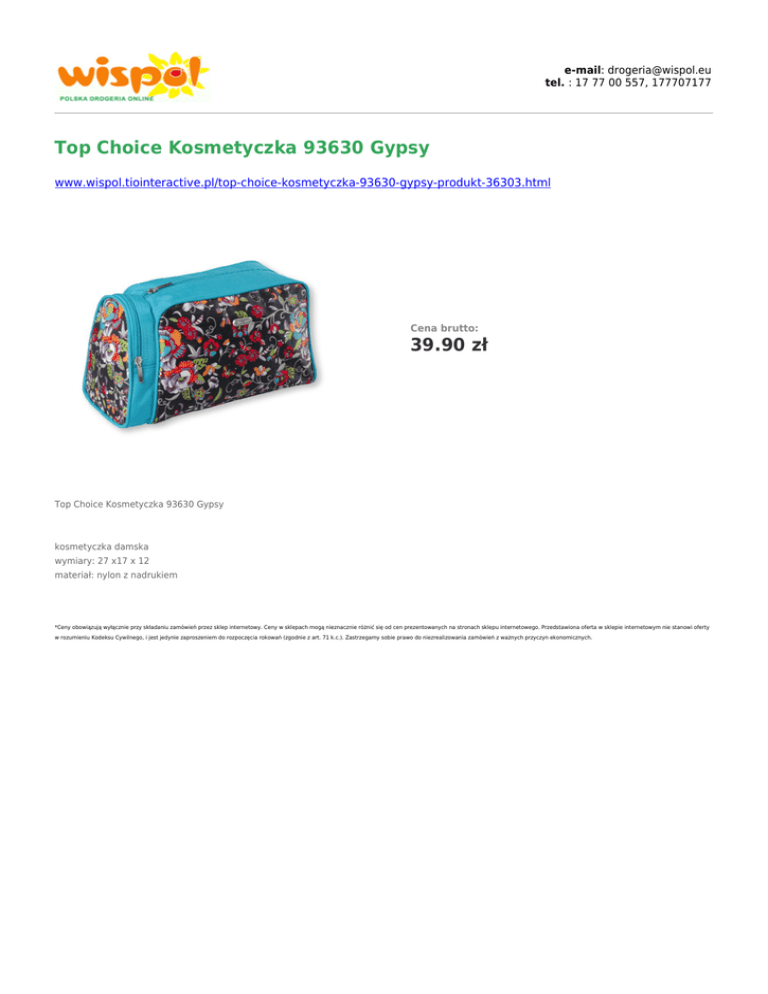 e-mail: [email protected] tel. : 17 77 00 557, 177707177 Top Choice Kosmetyczka 93630 Gypsy www.wispol.tiointeractive.pl/top-choice-kosmetyczka-93630-gypsy-produkt-36303.html Cena brutto: 39.90 zł Top Choice Kosmetyczka 93630 Gypsy kosmetyczka damska wymiary: 27 x17 x 12 materiał: nylon z nadrukiem *Ceny obowiązują wyłącznie przy składaniu zamówień przez sklep internetowy. Ceny w sklepach mogą nieznacznie różnić się od cen prezentowanych na stronach sklepu internetowego. Przedstawiona oferta w sklepie internetowym nie stanowi oferty w rozumieniu Kodeksu Cywilnego, i jest jedynie zaproszeniem do rozpoczęcia rokowań (zgodnie z art. 71 k.c.). Zastrzegamy sobie prawo do niezrealizowania zamówień z ważnych przyczyn ekonomicznych.
