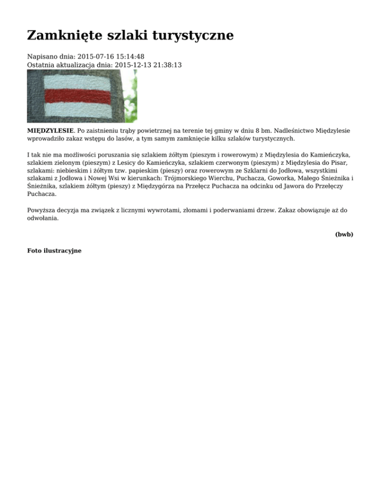 Zamknięte szlaki turystyczne Napisano dnia: 2015-07-16 15:14:48 Ostatnia aktualizacja dnia: 2015-12-13 21:38:13 MIĘDZYLESIE. Po zaistnieniu trąby powietrznej na terenie tej gminy w dniu 8 bm. Nadleśnictwo Międzylesie wprowadziło zakaz wstępu do lasów, a tym samym zamknięcie kilku szlaków turystycznych. I tak nie ma możliwości poruszania się szlakiem żółtym (pieszym i rowerowym) z Międzylesia do Kamieńczyka, szlakiem zielonym (pieszym) z Lesicy do Kamieńczyka, szlakiem czerwonym (pieszym) z Międzylesia do Pisar, szlakami: niebieskim i żółtym tzw. papieskim (pieszy) oraz rowerowym ze Szklarni do Jodłowa, wszystkimi szlakami z Jodłowa i Nowej Wsi w kierunkach: Trójmorskiego Wierchu, Puchacza, Goworka, Małego Śnieżnika i Śnieżnika, szlakiem żółtym (pieszy) z Międzygórza na Przełęcz Puchacza na odcinku od Jawora do Przełęczy Puchacza. Powyższa decyzja ma związek z licznymi wywrotami, złomami i poderwaniami drzew. Zakaz obowiązuje aż do odwołania. (bwb) Foto ilustracyjne