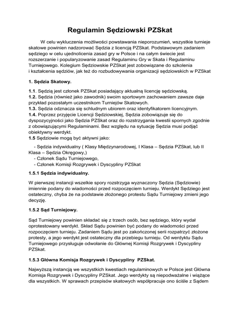 Regulamin Sędziowski PZSkat W celu wykluczenia możliwości powstawania nieporozumień, wszystkie turnieje skatowe powinien nadzorować Sędzia z licencją PZSkat. Podstawowym zadaniem sędziego w celu ujednolicenia zasad gry w Polsce i na całym świecie jest rozszerzanie i popularyzowanie zasad Regulaminu Gry w Skata i Regulaminu Turniejowego. Kolegium Sędziowskie PZSkat jest zobowiązane do szkolenia i kształcenia sędziów, jak też do rozbudowywania organizacji sędziowskich w PZSkat 1. Sędzia Skatowy. 1.1. Sędzią jest członek PZSkat posiadający aktualną licencję sędziowską. 1.2. Sędzia (również jako zawodnik) swoim sportowym zachowaniem zawsze daje przykład pozostałym uczestnikom Turniejów Skatowych. 1.3. Sędzia odznacza się schludnym ubiorem oraz identyfikatorem licencyjnym. 1.4. Poprzez przyjęcie Licencji Sędziowskiej, Sędzia zobowiązuje się do dyspozycyjności jako Sędzia PZSkat oraz do rozstrzygania kwestii spornych zgodnie z obowiązującymi Regulaminami. Bez względu na sytuację Sędzia musi podjąć obiektywny werdykt. 1.5 Sędziowie mogą być aktywni jako: - Sędzia indywidualny ( Klasy Międzynarodowej, I Klasa – Sędzia PZSkat, lub II Klasa – Sędzia Okręgowy,) - Członek Sądu Turniejowego, - Członek Komisji Rozgrywek i Dyscypliny PZSkat 1.5.1 Sędzia indywidualny. W pierwszej instancji wszelkie spory rozstrzyga wyznaczony Sędzia (Sędziowie) imiennie podany do wiadomości przed rozpoczęciem turnieju. Werdykt Sędziego jest ostateczny, chyba że na podstawie złożonego protestu Sądu Turniejowy zmieni jego decyzję. 1.5.2 Sąd Turniejowy. Sąd Turniejowy powinien składać się z trzech osób, bez sędziego, który wydał oprotestowany werdykt. Skład Sądu powinien być podany do wiadomości przed rozpoczęciem turnieju. Zadaniem Sądu jest po zakończonej serii rozpatrzyć złożone protesty, a jego werdykt jest ostateczny dla przebiegu turnieju. Od werdyktu Sądu Turniejowego przysługuje odwołanie do Głównej Komisji Rozgrywek i Dyscypliny PZSkat. 1.5.3 Główna Komisja Rozgrywek i Dyscypliny PZSkat. Najwyższą instancją we wszystkich kwestiach regulaminowych w Polsce jest Główna Komisja Rozgrywek i Dyscypliny PZSkat. Jego werdykty są niepodważalne i wiążące dla wszystkich. W sprawach przepisów skatowych współpracuje ono ściśle z Sądem Skatowym. Werdykt Głównej Komisji Rozgrywek i Dyscypliny nie powoduje korekty wydanych nagród. 2. Organizacje sędziowskie. 2.1 Kolegium Sędziowskie PZSkat (KS PZSkat). 2.1.1 KS PZSkat powoływane jest przez Zarząd Związku. 2.1.2 KS PZSkat prowadzi ewidencję wszystkich sędziów. 2.1.3 KS PZSkat organizuje szkolenia i egzaminy dla kandydatów na Sędziów. …. 2.1.4 KS PZSkat wyznacza prowadzącego kursy, szkolenia i egzaminy sędziowskie. 2.1.5 KS PZSkat przeprowadza egzaminy w celu przedłużenia ważności licencji sędziowskiej. 2.1.6 KS PZSkat ustala obsady sędziowskie na turnieje pod patronatem PZSkat. 2.1.7 KS PZSkat ściśle współpracuje Pionem Sportowym PZSkat z Sądem Skatowym oraz Międzynarodowym Sądem Skata. 3. Szkolenia i egzaminy sędziowskie. 3.1 Organizatorem szkoleń i egzaminów sędziowskich jest kolegium Sędziowskie PZSkat . 3.2 Egzamin sędziowski ma formę pisemną. W czasie egzaminu dopuszcza się korzystanie z Regulaminu Gry w Skata. 3.3 Wyniki egzaminu ustala kierownik kursu. Kandydat, który zdał egzamin otrzymuje odpowiednie poświadczenie tego faktu. Kandydat, który nie zdał egzaminu, może go powtórzyć w następnym roku. W przeciągu miesiąca od daty ogłoszenia wyników egzaminowany ma prawo odwołania. 3.4 Uczestnicy ponoszą koszty szkolenia i egzaminu. 4. Licencje sędziów II Klasy - Okręgowych. 4.1 Licencję sędziego można otrzymać poprzez udział w szkoleniu i zdanie egzaminu. 4.2 Licencja sędziowska jest ważna przez okres pięciu lat, do końca roku kalendarzowego po zakończeniu tego okresu. . 4.3 Po upływie roku można się starać o podniesienie swojej licencji na Sędziego I Klasy - PZSkat. 5. Licencje sędziów I Klasy – PZSkat. 5.1 Licencja sędziego klasy I (PZSkat) nadawana jest kandydatowi z minimum rocznym stażem na licencji sędziego klasy II (Okręgowy) po pozytywnie zdanym egzaminie poprzedzonym udziałem w szkoleniu 5.2 Sędzia z licencją klasy I (PZSkat) po uzyskaniu pozytywnej opinii od Zarządu PZSkat, może ubiegać się o licencję sędziego klasy Międzynarodowej składając egzamin w języku niemieckim przed Komisją Międzynarodową. 5.3 Licencja sędziowska klasy I jest ważna bezterminowo pod warunkiem corocznego uczestnictwa w szkoleniu przeprowadzanym przez Kolegium Sędziowskie PZSkat. 6.1 Wygaśnięcie ważności licencji następuje: 1. Z chwilą ustania członkostwa w PZSkat, 2. Z chwilą upływu terminu jej ważności, 3. Z chwilą dobrowolnej rezygnacji z jej posiadania, 4. Decyzją Zarządu PZSkat. 6.2 Nadużywanie nieważnej licencji sędziowskiej może być prawnie ścigane. 7. Postanowienia końcowe. 7.1 Wprowadzenie zmian, uzupełnień i załączników do niniejszego Regulaminu może nastąpić Uchwałą Zarządu PZSkat. Katowice, 29.12.2016