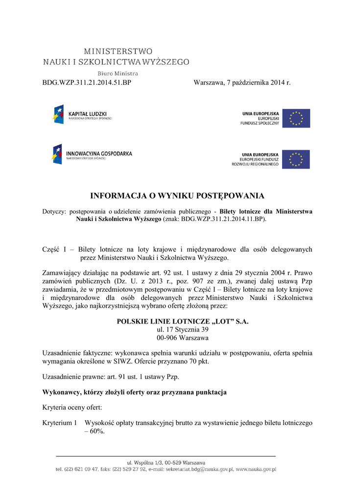 BDG.WZP.311.21.2014.51.BP Warszawa, 7 października 2014 r. INFORMACJA O WYNIKU POSTĘPOWANIA Dotyczy: postępowania o udzielenie zamówienia publicznego - Bilety lotnicze dla Ministerstwa Nauki i Szkolnictwa Wyższego (znak: BDG.WZP.311.21.2014.11.BP). Część I – Bilety lotnicze na loty krajowe i międzynarodowe dla osób delegowanych przez Ministerstwo Nauki i Szkolnictwa Wyższego. Zamawiający działając na podstawie art. 92 ust. 1 ustawy z dnia 29 stycznia 2004 r. Prawo zamówień publicznych (Dz. U. z 2013 r., poz. 907 ze zm.), zwanej dalej ustawą Pzp zawiadamia, że w przedmiotowym postępowaniu w Część I – Bilety lotnicze na loty krajowe i międzynarodowe dla osób delegowanych przez Ministerstwo Nauki i Szkolnictwa Wyższego, jako najkorzystniejszą wybrano ofertę złożoną przez: POLSKIE LINIE LOTNICZE „LOT” S.A. ul. 17 Stycznia 39 00-906 Warszawa Uzasadnienie faktyczne: wykonawca spełnia warunki udziału w postępowaniu, oferta spełnia wymagania określone w SIWZ. Ofercie przyznano 70 pkt. Uzasadnienie prawne: art. 91 ust. 1 ustawy Pzp. Wykonawcy, którzy złożyli oferty oraz przyznana punktacja Kryteria oceny ofert: Kryterium 1 Wysokość opłaty transakcyjnej brutto za wystawienie jednego biletu lotniczego – 60%. Kryterium 2 Nr oferty 1 3 4 2 Wysokość upustu określonego w % od taryf i opłat pobieranych przez wszystkich przewoźników, jakiego Wykonawca udzieli Zamawiającemu przy sprzedaży biletu – 40%. Kryterium 1 Kryterium 2 PLN % 39,00 1,90% 0,01 1,50% 40,00 30,00 70,00 96,00 3,00% 0,00 60,00 60,00 0,01 0,01% 40,00 0,20 40,20 Wykonawca BIURO PODRÓŻY i TURYSTYKI ALMATURPOLSKA S.A. ul. Bagatela 10 lok. 10 00-585 Warszawa POLSKIE LINIE LOTNICZE „LOT” S.A. ul. 17 Stycznia 39 00-906 Warszawa FURNEL TRAVEL INTERNATIONAL Sp. z o.o. ul. Kopernika 3 00-367 Warszawa BANKOWE BIURO PODRÓŻY „TRAVELBANK” sp. z o.o. ul. Waliców 11 00-851 Warszawa Liczba punktów za kryterium 1 Liczba punktów za kryterium 2 Łączna punktacja nie dotyczy (wykluczenie wykonawcy z postępowania) Część II – Bilety lotnicze na loty międzynarodowe na potrzeby projektu systemowego POKL pn. „Stworzenie i wdrożenie systemu szkoleń i staży w zakresie energetyki jądrowej i technologii eksploatacji oraz rozpoznawania zasobów gazu łupkowego” oraz projektu POIG pn. „Wsparcie systemu zarządzania badaniami naukowymi oraz ich wynikami”, realizowanych przez Ministerstwo Nauki i Szkolnictwa Wyższego (Część II zamówienia jest współfinansowana przez Unię Europejską ze środków Europejskiego Funduszu Społecznego w ramach Programu Operacyjnego Kapitał Ludzki oraz Europejskiego Funduszu Rozwoju Regionalnego w ramach Programu Operacyjnego Innowacyjna Gospodarka). Postępowanie w Części II zostało unieważnione na podstawie na podstawie art. 93 ust. 1 pkt 7 ustawy Pzp. Postępowanie obarczone jest niemożliwą do usunięcia wadą uniemożliwiającą zawarcie niepodlegającej unieważnieniu umowy w sprawie zamówienia publicznego (złożono dwie najkorzystniejsze oferty, których wysokość opłaty transakcyjnej brutto za wystawienie jednego biletu lotniczego jak i wysokość upustu określonego w % od taryf i opłat pobieranych przez wszystkich przewoźników, jakiego wykonawca udzieli zamawiającemu przy sprzedaży biletu mają takie same wartości). Agnieszka Stefaniak-Hrycko (pracownik Zamawiającego, któremu Kierownik Zamawiającego powierzył pisemnie wykonanie zastrzeżonych dla siebie czynności w postępowaniu o udzielenie zamówienia)