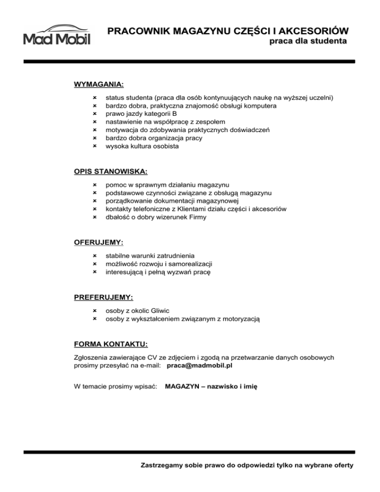 PRACOWNIK MAGAZYNU CZĘŚCI I AKCESORIÓW praca dla studenta WYMAGANIA: status studenta (praca dla osób kontynuujących naukę na wyższej uczelni) bardzo dobra, praktyczna znajomość obsługi komputera prawo jazdy kategorii B nastawienie na współpracę z zespołem motywacja do zdobywania praktycznych doświadczeń bardzo dobra organizacja pracy wysoka kultura osobista OPIS STANOWISKA: pomoc w sprawnym działaniu magazynu podstawowe czynności związane z obsługą magazynu porządkowanie dokumentacji magazynowej kontakty telefoniczne z Klientami działu części i akcesoriów dbałość o dobry wizerunek Firmy OFERUJEMY: stabilne warunki zatrudnienia możliwość rozwoju i samorealizacji interesującą i pełną wyzwań pracę PREFERUJEMY: osoby z okolic Gliwic osoby z wykształceniem związanym z motoryzacją FORMA KONTAKTU: Zgłoszenia zawierające CV ze zdjęciem i zgodą na przetwarzanie danych osobowych prosimy przesyłać na e-mail: [email protected] W temacie prosimy wpisać: MAGAZYN – nazwisko i imię Zastrzegamy sobie prawo do odpowiedzi tylko na wybrane oferty