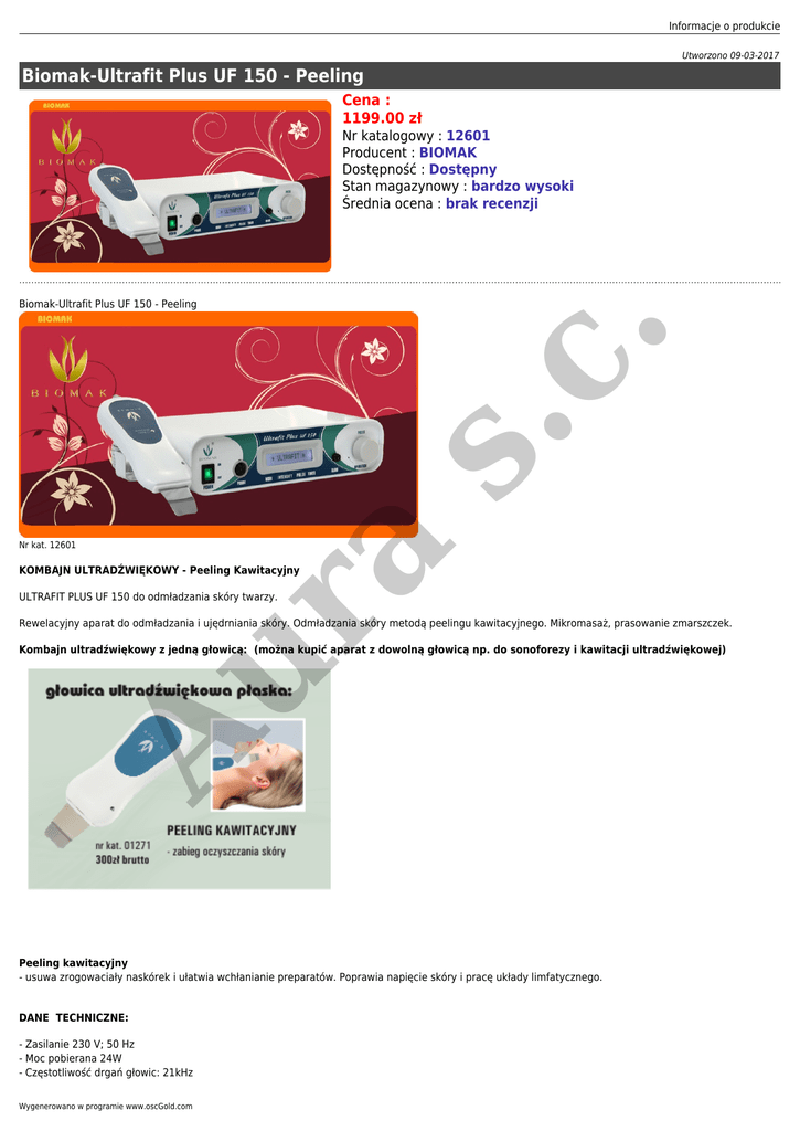 Informacje o produkcie Utworzono 09-03-2017 Biomak-Ultrafit Plus UF 150 - Peeling Cena : 1199.00 zł Nr katalogowy : 12601 Producent : BIOMAK Dostępność : Dostępny Stan magazynowy : bardzo wysoki Średnia ocena : brak recenzji Nr kat. 12601 a s. c. Biomak-Ultrafit Plus UF 150 - Peeling KOMBAJN ULTRADŹWIĘKOWY - Peeling Kawitacyjny Au r ULTRAFIT PLUS UF 150 do odmładzania skóry twarzy. Rewelacyjny aparat do odmładzania i ujędrniania skóry. Odmładzania skóry metodą peelingu kawitacyjnego. Mikromasaż, prasowanie zmarszczek. Kombajn ultradźwiękowy z jedną głowicą: (można kupić aparat z dowolną głowicą np. do sonoforezy i kawitacji ultradźwiękowej) Peeling kawitacyjny - usuwa zrogowaciały naskórek i ułatwia wchłanianie preparatów. Poprawia napięcie skóry i pracę układy limfatycznego. DANE TECHNICZNE: - Zasilanie 230 V; 50 Hz - Moc pobierana 24W - Częstotliwość drgań głowic: 21kHz Wygenerowano w programie www.oscGold.com - Częstotliwość modulacji drgań głowicy 1-10 Hz (impulsowanie) - Max. natężenie ultradźwięków 0,5W/cm2 - Max. całkowita moc ultradźwięków 5W - Wymiary 220 x 150 x 65 mm - Ciężar ~1,6 kg netto / sam aparat bez głowic Wyposażenie aparatu: - głowica płaska PEELING KAWITACYJNY - opaska z elektrodą - przewód zasilający - próbki żeli i tonika - 3x7ml, 4x3ml ZESTAWIENIE GŁOWIC DO APARATU ULTRAFIT PLUS UF150: s. c. - instrukcja obsługi - Głowicę płaską stosować w obrębie twarzy, szyi, dekoltu do zabiegów peelingu kawitacyjnego: PEELING KAWITACYJNY nr kat. 01271 - złuszczanie i wygładzanie - Głowice okrągłe KAWITACJA ULTRADŹWIĘKOWA stosować na ciało do zabiegu rozbijania tkanki tłuszczowej na ciało KAWITACJA ULTRADŹWIĘKOWA głowica 4cm nr kat. 01251 KAWITACJA ULTRADŹWIĘKOWA głowica 6cm nr kat. 01261 - Głowice okrągłe SONOFOREZA stosować na twarz i ciało do zabiegu sonoforezy (wprowadzanie substancji aktywnych) SONOFOREZA głowica 4cm nr kat. 01252 SONOFOREZA głowica 6cm nr kat. 01262 a - Głowice okrągłe KAWITACJA ULTRADŹWIĘKOWA i SONOFOREZA stosować do zabiegu: sonoforezy na twarz i ciało, rozbijania tkanki tłuszczowej na ciało oraz, zabieg liposukcji na ciało KAWITACJA ULTRADŹWIĘKOWA i SONOFOREZA głowica 4cm nr kat. 01253 KAWITACJA ULTRADŹWIĘKOWA i SONOFOREZA głowica 6cm nr kat. 01263 Au r Przeczytaj instrukcję obsługi aparatu ULTRAFIT PLUS UF150 - format PDF kliknij Au r a s. c. Informacje o produkcie Wygenerowano w programie www.oscGold.com