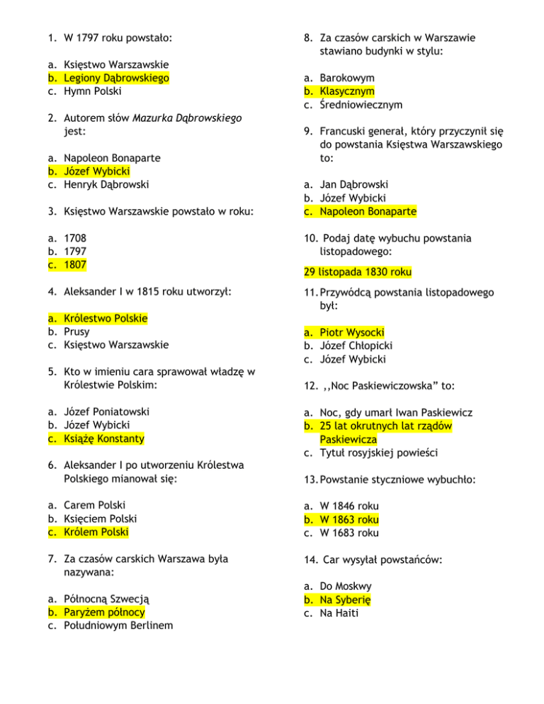 1. W 1797 roku powstało: a. Księstwo Warszawskie b. Legiony Dąbrowskiego c. Hymn Polski 2. Autorem słów Mazurka Dąbrowskiego jest: a. Napoleon Bonaparte b. Józef Wybicki c. Henryk Dąbrowski 3. Księstwo Warszawskie powstało w roku: 8. Za czasów carskich w Warszawie stawiano budynki w stylu: a. Barokowym b. Klasycznym c. Średniowiecznym 9. Francuski generał, który przyczynił się do powstania Księstwa Warszawskiego to: a. Jan Dąbrowski b. Józef Wybicki c. Napoleon Bonaparte a. 1708 b. 1797 c. 1807 10. Podaj datę wybuchu powstania listopadowego: 4. Aleksander I w 1815 roku utworzył: 11. Przywódcą powstania listopadowego był: a. Królestwo Polskie b. Prusy c. Księstwo Warszawskie 5. Kto w imieniu cara sprawował władzę w Królestwie Polskim: a. Józef Poniatowski b. Józef Wybicki c. Książę Konstanty 29 listopada 1830 roku a. Piotr Wysocki b. Józef Chłopicki c. Józef Wybicki 12. ,,Noc Paskiewiczowska” to: a. Noc, gdy umarł Iwan Paskiewicz b. 25 lat okrutnych lat rządów Paskiewicza c. Tytuł rosyjskiej powieści 6. Aleksander I po utworzeniu Królestwa Polskiego mianował się: 13. Powstanie styczniowe wybuchło: a. Carem Polski b. Księciem Polski c. Królem Polski a. W 1846 roku b. W 1863 roku c. W 1683 roku 7. Za czasów carskich Warszawa była nazywana: 14. Car wysyłał powstańców: a. Północną Szwecją b. Paryżem północy c. Południowym Berlinem a. Do Moskwy b. Na Syberię c. Na Haiti