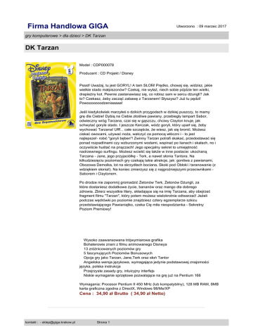 Firma Handlowa GIGA Utworzono : 09 marzec 2017 gry komputerowe > dla dzieci > DK Tarzan DK Tarzan Model : CDP000078 Producent : CD Projekt / Disney Pssst! Uważaj, tu jest GORYL! A tam SŁOŃ! Prędko, chowaj się, widzisz, jakie wielkie stado małpiszonów? Czekaj, nie wyłaź, niech sobie pójdzie ten wielki, drapieżny kot. Pewnie zastanawiasz się, co robisz sam w sercu dżungli? Jak to? Czekasz, żeby zacząć zabawę z Tarzanem! Słyszysz? Już tu pędzi! Powooooooodzeniaaaaa! Jeśli kiedykolwiek marzyłeś o dzikich przygodach w dzikiej puszczy, to mamy grę dla Ciebie! Dybią na Ciebie złośliwe pawiany, przebiegły lampart Sabor, odwieczny wróg Tarzana, czai się w gąszczu, chciwy Clayton knuje, jak schwytać goryle stado. I jeszcze Kerczak, wódz goryli, który uparł się, żeby wychować Tarzana! Ufff... całe szczęście, że wiesz, jak się bronić. Możesz ciskać owocami, używać noża, walczyć za pomocą włóczni i - to jest najlepsze!- robić "goryli bęben"! Zwinny Tarzan potrafi skakać, przedostawać się ponad rozpadlinami czy wzburzonymi wodami, wspinać po lianach i skałach, no i oczywiście huśtać na pnączach! Jego specjalny sekret to umiejętność nadrzewnego surfingu. Możesz wcielić się także w inne postacie: ukochaną Tarzana - Jane, jego przyjaciółkę - Terk, a nawet słonia Tantora. Na kilkudziesięciu poziomach gry czekają takie atrakcje, jak: gonitwa z pawianami, Obozowa Demolka, lot na skrzydłach bociana, Skoki pod Obłoki i taranowanie (z wdziękiem słonia!). Na koniec zmierzysz się z najgroźniejszymi przeciwnikami Saborem i Claytonem. Po drodze nie zapomnij gromadzić Żetonów Terk, Żetonów Dżungli, za które dostaniesz dodatkowe życie, bananów oraz mango dla dobrego zdrowia. Zbierz wszystkie litery, składające się na imię Tarzana, aby obejrzeć fragment filmu "Tarzan", który potem możesz wielokrotnie odtwarzać! Jeżeli podczas wędrówki po poziomie znajdziesz cztery egzemplarze szkicu przedstawiającego Pawianiątko, czeka Cię miła niespodzianka - Sekretny Poziom Premiowy! Wysoko zaawansowana trójwymiarowa grafika Bohaterowie znani z filmu animowanego Disneya 13 zróżnicowanych poziomów gry 5 fascynujących Poziomów Bonusowych Opcja gry jako Tarzan, Jane,Terk oraz słoń Tantor Angielska wersja językowa, wymagająca jedynie podstawowej znajomości języka, polska instrukcja Przejrzyste zasady gry, intuicyjny interfejs Niskie wymaganie sprzętowe pozwalające na grę już na Pentium 166 Wymagania: Procesor Pentium II 450 MHz (lub kompatybilny), 128 MB RAM, 8MB karta graficzna zgodna z DirectX, Windows 98/Me/XP Cena : 34,90 zł Brutto ( 34,90 zł Netto) kontakt : - [email protected] Strona 1