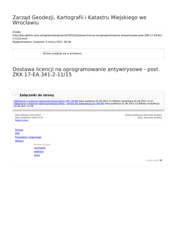 Zarząd Geodezji, Kartografii i Katastru Miejskiego we Wrocławiu Źródło: http://bip.zgkikm.wroc.pl/zgk/przetargi/wyniki/2919,Dostawa-licencji-na-oprogramowanie-antywirysowe-post-ZKK-17-EA3412-1115.html Wygenerowano: Czwartek, 9 marca 2017, 00:36 Strona znajduje się w archiwum. Dostawa licencji na oprogramowanie antywirysowe - post. ZKK 17-EA.341-2-11/15 Załączniki do strony Ogłoszenie o wyborze najkorzystniejszej oferty (407.28 KB) Data publikacji 01.06.2015 12:00Data modyfikacji 01.06.2015 12:57 Ogłoszenie o wyborze najkorzystniejszej oferty - wersja dla słabowidzących (69 KB) Data publikacji 01.06.2015 12:00Data modyfikacji 01.06.2015 12:58 Data publikacji 2015.06.01 Data modyfikacji 2015.07.07 Rejestr zmian Osoba publikująca: Dominika Grodzka Autor: Dominika Grodzka Drukuj PDF Powiadom znajomego Wstecz Rozmiar czcionki: normalna większa duża Liczba wejść: 88