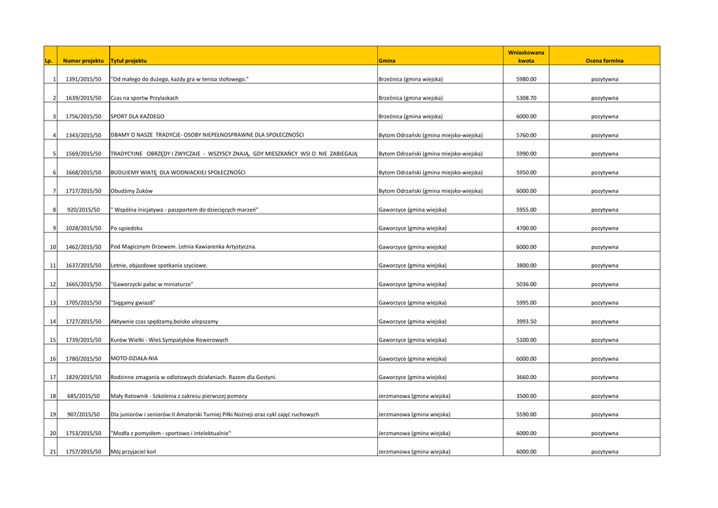 Numer projektu Lp. Tytuł projektu Gmina Wnioskowana kwota Ocena formlna 1 1391/2015/50 "Od małego do dużego, każdy gra w tenisa stołowego." Brzeźnica (gmina wiejska) 5980.00 pozytywna 2 1639/2015/50 Czas na sportw Przylaskach Brzeźnica (gmina wiejska) 5308.70 pozytywna 3 1756/2015/50 SPORT DLA KAŻDEGO Brzeźnica (gmina wiejska) 6000.00 pozytywna 4 1343/2015/50 DBAMY O NASZE TRADYCJE- OSOBY NIEPEŁNOSPRAWNE DLA SPOŁECZNOŚCI Bytom Odrzański (gmina miejsko-wiejska) 5760.00 pozytywna 5 1569/2015/50 TRADYCYJNE OBRZĘDY I ZWYCZAJE - WSZYSCY ZNAJĄ, GDY MIESZKAŃCY WSI O NIE ZABIEGAJĄ Bytom Odrzański (gmina miejsko-wiejska) 5990.00 pozytywna 6 1668/2015/50 BUDUJEMY WIATĘ DLA WODNIACKIEJ SPOŁECZNOŚCI Bytom Odrzański (gmina miejsko-wiejska) 5950.00 pozytywna 7 1717/2015/50 Obudźmy Żuków Bytom Odrzański (gmina miejsko-wiejska) 6000.00 pozytywna 8 920/2015/50 " Wspólna inicjatywa - paszportem do dziecięcych marzeń" Gaworzyce (gmina wiejska) 5955.00 pozytywna 9 1028/2015/50 Po sąsiedzku Gaworzyce (gmina wiejska) 4700.00 pozytywna 10 1462/2015/50 Pod Magicznym Drzewem. Letnia Kawiarenka Artystyczna. Gaworzyce (gmina wiejska) 6000.00 pozytywna 11 1637/2015/50 Letnie, objazdowe spotkania szyciowe. Gaworzyce (gmina wiejska) 3800.00 pozytywna 12 1665/2015/50 "Gaworzycki pałac w miniaturze" Gaworzyce (gmina wiejska) 5036.00 pozytywna 13 1705/2015/50 "Sięgamy gwiazd" Gaworzyce (gmina wiejska) 5995.00 pozytywna 14 1727/2015/50 Aktywnie czas spędzamy,boisko ulepszamy Gaworzyce (gmina wiejska) 3993.50 pozytywna 15 1739/2015/50 Kurów Wielki - Wieś Sympatyków Rowerowych Gaworzyce (gmina wiejska) 5100.00 pozytywna 16 1780/2015/50 MOTO-DZIAŁA-NIA Gaworzyce (gmina wiejska) 6000.00 pozytywna 17 1829/2015/50 Rodzinne zmagania w odlotowych działaniach. Razem dla Gostyni. Gaworzyce (gmina wiejska) 3660.00 pozytywna 18 685/2015/50 Mały Ratownik - Szkolenia z zakresu pierwszej pomocy Jerzmanowa (gmina wiejska) 3500.00 pozytywna 19 907/2015/50 Dla juniorów i seniorów:II Amatorski Turniej Piłki Nożneji oraz cykl zajęć ruchowych Jerzmanowa (gmina wiejska) 5590.00 pozytywna 20 1753/2015/50 "Modła z pomysłem - sportowo i intelektualnie" Jerzmanowa (gmina wiejska) 6000.00 pozytywna 21 1757/2015/50 Mój przyjaciel koń Jerzmanowa (gmina wiejska) 6000.00 pozytywna 22 1036/2015/50 Jestem aktywny u siebie Kożuchów (gmina miejsko-wiejska) 5960.00 pozytywna 23 1436/2015/50 Piłka nożna łączy pokolenia Kożuchów (gmina miejsko-wiejska) 6000.00 pozytywna 24 1467/2015/50 Razem możemy więcej Kożuchów (gmina miejsko-wiejska) 5750.00 pozytywna 25 1590/2015/50 Razem trzy pokolenia Kożuchów (gmina miejsko-wiejska) 5999.50 pozytywna 26 1721/2015/50 AKTYWNI I ZDROWI Kożuchów (gmina miejsko-wiejska) 5850.00 pozytywna 27 1725/2015/50 Rękodzieło łączy pokolenia Kożuchów (gmina miejsko-wiejska) 4525.00 pozytywna 28 1561/2015/50 "Ogród wielopokoleniowy - Od edukacji do rekreacji" Niegosławice (gmina wiejska) 6000.00 pozytywna 29 1670/2015/50 Na naszym palcu zabaw zawsze bezpiecznie i wesoło - Bukowiecki Zakątek Niegosławice (gmina wiejska) 6000.00 pozytywna 30 660/2015/50 Plenerowe miejsce spotkań - "Milusińscy i my" Nowe Miasteczko (gmina miejsko-wiejska) 5900.00 pozytywna 31 1151/2015/50 AKTYWNOŚĆ - to moje drugie JA Nowe Miasteczko (gmina miejsko-wiejska) 6000.00 pozytywna 32 1369/2015/50 Integracja i aktywacja pokoleń poprzez gry i zabawy naszych dziadków. Nowe Miasteczko (gmina miejsko-wiejska) 5980.00 pozytywna 33 1570/2015/50 "Borowiaki z Naszej Paki" Nowe Miasteczko (gmina miejsko-wiejska) 6000.00 pozytywna 34 1609/2015/50 Przez historię do integracji Nowe Miasteczko (gmina miejsko-wiejska) 6000.00 pozytywna 35 1774/2015/50 DALKÓW Z INICJATYWĄ, czyli Integracja, Aktywność i Dobra Zabawa Nowe Miasteczko (gmina miejsko-wiejska) 6000.00 pozytywna 36 1790/2015/50 Mali i Duzi Odkrywcy FENIKSA Nowe Miasteczko (gmina miejsko-wiejska) 6000.00 pozytywna 37 1794/2015/50 "Zakątek Malucha" Nowe Miasteczko (gmina miejsko-wiejska) 6000.00 pozytywna 38 650/2015/50 Nakręcona Sucha Górna - warsztaty filmowe Polkowice (gmina miejsko-wiejska) 5980.00 pozytywna 39 693/2015/50 "Powtórka z podwórka" Polkowice (gmina miejsko-wiejska) 6000.00 pozytywna 40 1510/2015/50 Czar bębnienia- warsztaty bębniarskie Polkowice (gmina miejsko-wiejska) 5970.00 pozytywna 41 1763/2015/50 KAŻDY WIELKI BYŁ KIEDYŚ MAŁY Polkowice (gmina miejsko-wiejska) 6000.00 pozytywna 42 1788/2015/50 Wykonanie materiałów informacyjno - promocyjnych dotyczących działań lokalnych w miejscowości Trzebc Polkowice (gmina miejsko-wiejska) 6000.00 pozytywna 43 1699/2015/50 Rewitalizacja boiska sportowego w Przesiecznej i organizacja turnieju pilki nożnej. Radwanice (gmina wiejska) 6000.00 pozytywna 44 1448/2015/50 Jakubowskie Pierzajki Radwanice (gmina wiejska) 5875.00 pozytywna 45 1638/2015/50 Sztuka Tolerancji Radwanice (gmina wiejska) 5040.00 pozytywna 46 1651/2015/50 "Dla wspólnego dobra-integrujmy się " Radwanice (gmina wiejska) 6000.00 pozytywna 47 1688/2015/50 Poznaj swoją okolicę - nordic walking dla wszystkich Radwanice (gmina wiejska) 5764.28 pozytywna 48 1726/2015/50 Lipa produktem lokalnym Radwanice (gmina wiejska) 6000.00 pozytywna 49 1782/2015/50 Akademia Sportowej Przygody Radwanice (gmina wiejska) 6000.00 pozytywna 50 1813/2015/50 NAJWIĘKSZYM NASZYM BOGACTWEM SĄ LUDZIE Z PASJĄ Radwanice (gmina wiejska) 6000.00 pozytywna 51 1832/2015/50 ”Klub Wiejski – Reaktywacja „ Radwanice (gmina wiejska) 6000.00 pozytywna 52 1377/2015/50 WIEŚ Z KULTURĄ, czyli KINO-KAWIARNIA "BAJKA" Szprotawa (gmina miejsko-wiejska) 5983.88 pozytywna 53 1475/2015/50 Na przaśną Nutę Szprotawa (gmina miejsko-wiejska) 6000.00 pozytywna 54 1477/2015/50 "Ćwiczę, bo lubię" Szprotawa (gmina miejsko-wiejska) 6000.00 pozytywna 55 1495/2015/50 Aktywny Senior to dobra lokata Szprotawa (gmina miejsko-wiejska) 5928.00 pozytywna 56 1684/2015/50 BOROWINA GOTUJE I INTEGRUJE Szprotawa (gmina miejsko-wiejska) 6000.00 poz