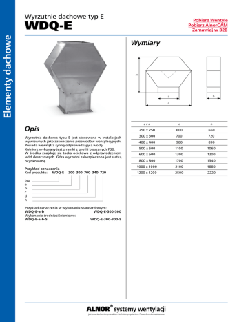 Wyrzutnie dachowe typ E Pobierz Wentyle Pobierz AlnorCAM Zamawiaj w B2B Elementy dachowe WDQ-E h Wymiary b a c Opis Wyrzutnia dachowa typu E jest stosowana w instalacjach wywiewnych jako zakończenie przewodów wentylacyjnych. Posiada wewnątrz rynnę odprowadzającą wodę. Kołnierz wykonany jest z ramki z profili blaszanych P30. W środku znajduje się tacka ociekowa z odprowadzeniem wód deszczowych. Góra wyrzutni zabezpieczona jest siatką ocynkowaną. Przykład oznaczenia Kod produktu: WDQ-E 300 300 700 340 720 axb c h 250 x 250 600 660 300 x 300 700 720 400 x 400 900 890 500 x 500 1100 1060 600 x 600 1300 1200 800 x 800 1700 1540 1000 x 1000 2100 1880 1200 x 1200 2500 2220 typ a b c d h Przykład oznaczenia w wykonaniu standardowym: WDQ-E-a-b WDQ-E-300-300 Wykonanie średniociśnieniowe: WDQ-E-a-b-S WDQ-E-300-300-S ALNOR® systemy wentylacji jest prawnie chronionym znakiem i technicznym patentem. Prawo do zmian zastrzeżone.