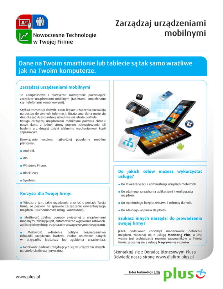 Zarządzaj urządzeniami mobilnymi Dane na Twoim smartfonie lub tablecie są tak samo wrażliwe jak na Twoim komputerze. Zarządzaj urządzeniami mobilnymi To kompleksowe i elastyczne rozwiązanie pozwalające zarządzać urządzeniami mobilnym (tabletami, smartfonami czy telefonami komórkowymi). Szybka transmisja danych i coraz lepsze urządzenia pozwalają na dostęp do cennych informacji. Utrata smartfona może się dziś okazać dużo bardziej szkodliwa niż utrata portfela. Usługa Zarządzaj urządzeniani mobilnymi pozwala chronić nasze dane, z jednej strony poprzez zabezpieczenia ich hasłem, a z drugiej dzięki zdalnemu mechanizmowi kopii zapasowych. Rozwiązanie platformy: wspiera najbardziej popularne mobilne ■ Android. ■ iOS. ■ WIndows Phone. ■ BlackBerry. ■ Symbian. Do jakich celów możesz wykorzystać usługę? ■ Do Inwentaryzacji i administracji urządzeń mobilnych. Korzyści dla Twojej firmy: ■ Do zdalnego zarządzania aplikacjami i konfiguracją urządzeń. ■ Wiedza o tym, jakie urządzenia przenośne posiada Twoja firma, co pozwoli na sprawne zarządzanie (inwentaryzacja urządzeń, uruchomionych usług, kontraktów). ■ Do monitoringu bezpieczeństwa i ochrony danych. ■ Możliwość zdalnej pomocy związanej z urządzeniami mobilnymi: zdalny pulpit, automatyczne wgrywanie ustawień, aplikacji i danych (np. książka adresowa przywymianie aparatu). Szukasz innych narzędzi do prowadzenia swojej firmy? ■ Możliwość wdrożenia polityki bezpieczeństwa (blokada urządzenia hasłem, zdalne usuwanie danych w przypadku kradzieży lub zgubienia urządzenia.). Jeżeli dodatkowo chciałbyś monitorowac położenie urządzeń, zapoznaj się z usługą Monitorig Plus, a jeśli ważna jest archiwizacja rozmów pracowników w Twojej firmie zapoznaj się z usługą Nagrywanie rozmów. ■ Możliwość podziału znajdujących się w urządzeniu danych na strefę służbową i prywatną. www.plus.pl ■ Do zdalnego wsparcia HelpDesk. Skontaktuj się z Doradcą Biznesowym Plusa Odwiedź naszą stronę www.dlafirm.plus.pl