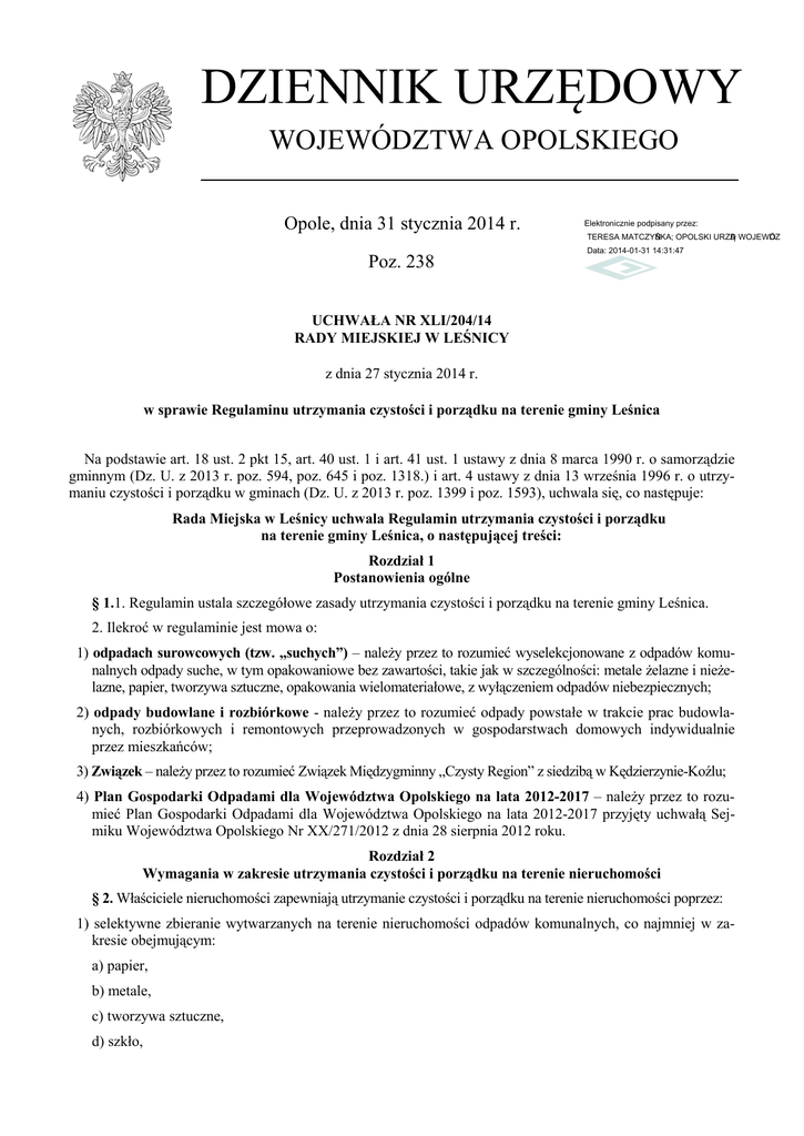 DZIENNIK URZĘDOWY WOJEWÓDZTWA OPOLSKIEGO Opole, dnia 31 stycznia 2014 r. Elektronicznie podpisany przez: TERESA MATCZYŃSKA; OPOLSKI URZĄD WOJEWÓDZKI Poz. 238 Data: 2014-01-31 14:31:47 UCHWAŁA NR XLI/204/14 RADY MIEJSKIEJ W LEŚNICY z dnia 27 stycznia 2014 r. w sprawie Regulaminu utrzymania czystości i porządku na terenie gminy Leśnica Na podstawie art. 18 ust. 2 pkt 15, art. 40 ust. 1 i art. 41 ust. 1 ustawy z dnia 8 marca 1990 r. o samorządzie gminnym (Dz. U. z 2013 r. poz. 594, poz. 645 i poz. 1318.) i art. 4 ustawy z dnia 13 września 1996 r. o utrzymaniu czystości i porządku w gminach (Dz. U. z 2013 r. poz. 1399 i poz. 1593), uchwala się, co następuje: Rada Miejska w Leśnicy uchwala Regulamin utrzymania czystości i porządku na terenie gminy Leśnica, o następującej treści: Rozdział 1 Postanowienia ogólne § 1.1. Regulamin ustala szczegółowe zasady utrzymania czystości i porządku na terenie gminy Leśnica. 2. Ilekroć w regulaminie jest mowa o: 1) odpadach surowcowych (tzw. „suchych”) – należy przez to rozumieć wyselekcjonowane z odpadów komunalnych odpady suche, w tym opakowaniowe bez zawartości, takie jak w szczególności: metale żelazne i nieżelazne, papier, tworzywa sztuczne, opakowania wielomateriałowe, z wyłączeniem odpadów niebezpiecznych; 2) odpady budowlane i rozbiórkowe - należy przez to rozumieć odpady powstałe w trakcie prac budowlanych, rozbiórkowych i remontowych przeprowadzonych w gospodarstwach domowych indywidualnie przez mieszkańców; 3) Związek – należy przez to rozumieć Związek Międzygminny „Czysty Region” z siedzibą w Kędzierzynie-Koźlu; 4) Plan Gospodarki Odpadami dla Województwa Opolskiego na lata 2012-2017 – należy przez to rozumieć Plan Gospodarki Odpadami dla Województwa Opolskiego na lata 2012-2017 przyjęty uchwałą Sejmiku Województwa Opolskiego Nr XX/271/2012 z dnia 28 sierpnia 2012 roku. Rozdział 2 Wymagania w zakresie utrzymania czystości i porządku na terenie nieruchomości § 2. Właściciele nieruchomości zapewniają utrzymanie czystości i porządku na terenie nieruchomości poprzez: 1) selektywne zbieranie wytwarzanych na terenie nieruchomości odpadów komunalnych, co najmniej w zakresie obejmującym: a) papier, b) metale, c) tworzywa sztuczne, d) szkło, Dziennik Urzędowy Województwa Opolskiego –2– Poz. 238 e) opakowania wielomateriałowe, f) odpady zielone, g) przeterminowane leki i chemikalia, h) zużyte baterie i akumulatory, i) zużyty sprzęt elektryczny i elektroniczny, j) meble i inne odpady wielkogabarytowe, k) odpady budowlane i rozbiórkowe, l) zużyte opony o średnicy do 56 cm, m) popiół, w ilości odpowiedniej do pojemności minimalnego pojemnika, określonego w regulaminie, - w sposób określony w § 3; 2) przekazywanie selektywnie zebranych odpadów uprawnionym podmiotom prowadzącym działalność w zakresie odbierania odpadów komunalnych od właścicieli nieruchomości oraz podmiotom prowadzącym punkty selektywnego zbierania odpadów komunalnych lub przekazywanie odpowiednim podmiotom w trybie określonym przez właściwe przepisy; 3) zbieranie niesegregowanych (zmieszanych) odpadów komunalnych i przekazywanie ich uprawnionym podmiotom prowadzącym działalność w zakresie odbierania odpadów komunalnych od właścicieli nieruchomości. § 3.1. Właściciele nieruchomości zobowiązani są do zbierania i przekazywania do odbioru wskazanych poniżej odpadów w następujący sposób: 1) w zabudowie jednorodzinnej: a) odpady surowcowe (tzw. „suche”) – w osobnym worku, b) szkło – w osobnym worku, c) odpady zielone – w osobnym pojemniku, a nadmiar w worku - w okresie od 1 maja do 31 października, chyba, że prowadzone jest ich kompostowanie we własnym zakresie przy pomocy kompostowników przydomowych, d) niesegregowane (zmieszane) odpady komunalne – w osobnym pojemniku, e) popiół - w pojemniku przeznaczonym na odpady zielone, w okresie od 1 listopada do 30 kwietnia; 2) w zabudowie wielorodzinnej: a) odpady surowcowe (tzw. „suche”) – w osobnym pojemniku, b) szkło – w osobnym pojemniku, c) niesegregowane (zmieszane) odpady komunalne – w osobnym pojemniku, d) dopuszcza się selektywne zbieranie odpadów zielonych w okresie od 1 maja do 31 października - w workach o pojemności nie większej niż 120 l; 3) na terenie nieruchomości, na których nie zamieszkują mieszkańcy, a powstają odpady komunalne oraz nieruchomości, na których w części zamieszkują mieszkańcy, a w części nie zamieszkują mieszkańcy, a powstają odpady komunalne: a) odpady surowcowe (tzw. „suche”) – w osobnym pojemniku, b) szkło – w osobnym pojemniku, c) niesegregowane (zmieszane) odpady komunalne – w osobnym pojemniku. 2. Meble i inne odpady wielkogabarytowe, zużyte opony o średnicy do 56 cm, odpady zielone oraz odpady budowlane i rozbiórkowe, zużyty sprzęt elektryczny i elektroniczny, odpady surowcowe (tzw. "suche") oraz szkło i szkło opakowaniowe - mieszkańcy, właściciele nieruchomości lub upoważniona przez właściciela nieruchomości jednostka, mogą dostarczyć do punktu selektywnego zbierania odpadów komunalnych. Dziennik Urzędowy Województwa Opolskiego –3– Poz. 238 3. Meble i inne odpady wielkogabarytowe, zużyte opony o średnicy do 56 cm, zużyty sprzęt elektryczny i elektroniczny oraz odpady niebezpieczne mogą być odbierane w systemie akcyjnym. § 4. Właściciele nieruchomości mają obowiązek uprzątnięcia błota, śniegu, lodu, opadłych liści i innych zanieczyszczeń z części nieruchomości służących do użytku publicznego, poprzez gromadzenie ich w taki sposób, aby nie utrudniało to ruchu i nie zagrażało przechodniom i pojazdom oraz istniejącej zieleni, z zachowaniem możliwości odpływu wody do kanalizacji. § 5. Właściciele nieruchomości przeznaczonych do użytku publicznego zapewniają utrzymanie czystości i porządku na częściach tych nieruchomości poprzez wyposażenie mi