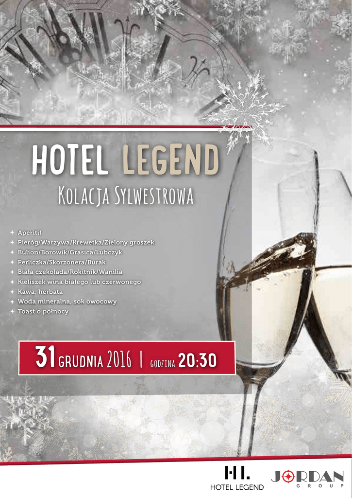 HOTEL LEGEND Kolacja Sylwestrowa Aperitif Pieróg/Warzywa/Krewetka/Zielony groszek Bulion/Borowik/Grasica/Lubczyk Perliczka/Skorzonera/Burak Biała czekolada/Rokitnik/Wanilia Kieliszek wina białego lub czerwonego Kawa, herbata Woda mineralna, sok owocowy Toast o północy 31 GRUDNIA 2016 | godzina 20:30
