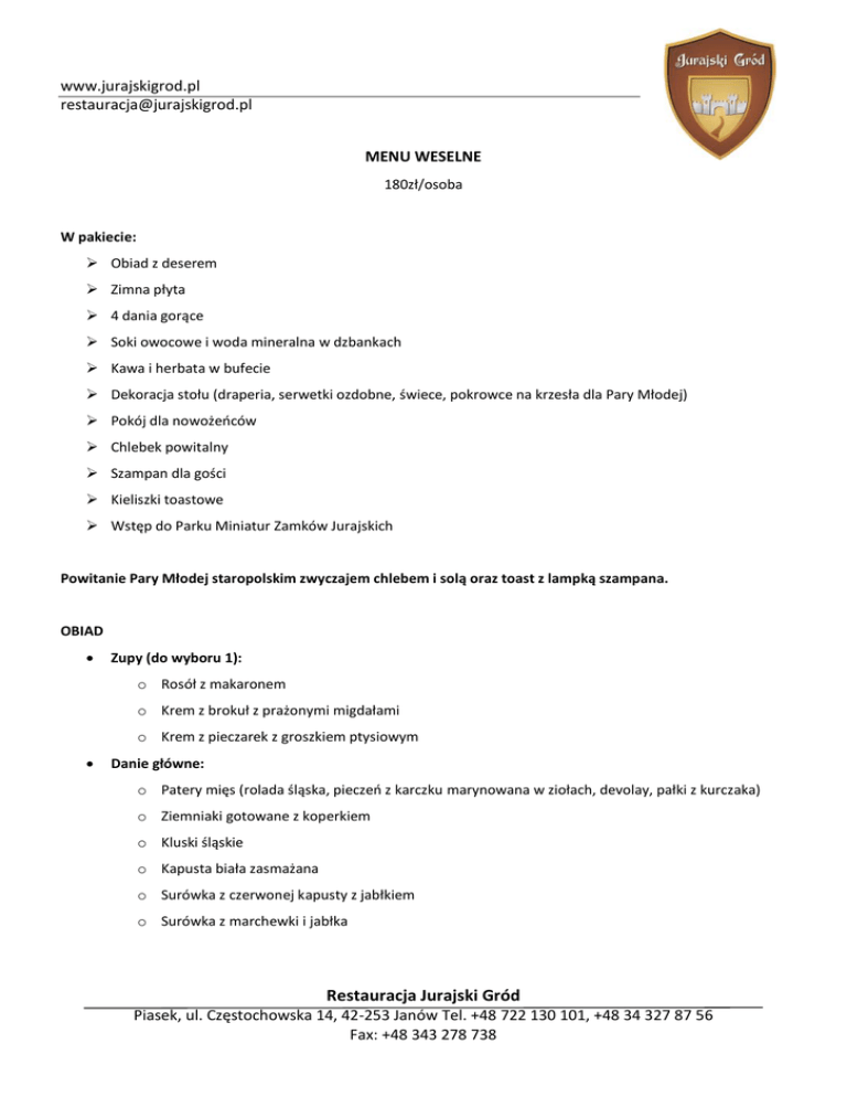 www.jurajskigrod.pl [email protected] MENU WESELNE 180zł/osoba W pakiecie: Obiad z deserem Zimna płyta 4 dania gorące Soki owocowe i woda mineralna w dzbankach Kawa i herbata w bufecie Dekoracja stołu (draperia, serwetki ozdobne, świece, pokrowce na krzesła dla Pary Młodej) Pokój dla nowożeńców Chlebek powitalny Szampan dla gości Kieliszki toastowe Wstęp do Parku Miniatur Zamków Jurajskich Powitanie Pary Młodej staropolskim zwyczajem chlebem i solą oraz toast z lampką szampana. OBIAD Zupy (do wyboru 1): o Rosół z makaronem o Krem z brokuł z prażonymi migdałami o Krem z pieczarek z groszkiem ptysiowym Danie główne: o Patery mięs (rolada śląska, pieczeń z karczku marynowana w ziołach, devolay, pałki z kurczaka) o Ziemniaki gotowane z koperkiem o Kluski śląskie o Kapusta biała zasmażana o Surówka z czerwonej kapusty z jabłkiem o Surówka z marchewki i jabłka Restauracja Jurajski Gród Piasek, ul. Częstochowska 14, 42-253 Janów Tel. +48 722 130 101, +48 34 327 87 56 Fax: +48 343 278 738 www.jurajskigrod.pl [email protected] DESER (do wyboru 1): Lody waniliowe z musem z owoców leśnych i bitą śmietaną Lody z owocami i bitą śmietaną ZIMNA PŁYTA: Deski mięs pieczonych i wędlin: karczek pieczony, schab pieczony, rolada z boczku, pasztet domowy, wędliny tradycyjne Tymbalik drobiowy Schab po warszawsku w galarecie Rożki szynkowe z musem chrzanowym w galarecie Śledź w oleju Śledź w pomidorach Sałatka Floryda z szynką, serem i ananasem Sałatka jarzynowa Jaja faszerowane Pikle, marynaty Pieczywo, masło I DANIE GORĄCE (do wyboru 1): Kotlet cordon bleu, ziemniaki opiekane, surówka z kapusty pekińskiej Szaszłyk wieprzowy, ryż czerwony, bukiet warzyw gotowanych Sznycel szwajcarski, ziemniaki piurre, sałatka wiosenna II DANIE GORĄCE (do wyboru 1): Bogracz Jurajska zupa gulaszowa Strogonow III DANIE GORĄCE (do wyboru 1): Potrawka z kurczaka, z pieczarkami i warzywami podana na ryżu Gulasz zbójecki z grzybami leśnymi podany w chlebie Restauracja Jurajski Gród Piasek, ul. Częstochowska 14, 42-253 Janów Tel. +48 722 130 101, +48 34 327 87 56 Fax: +48 343 278 738 www.jurajskigrod.pl [email protected] IV DANIE GORĄCE (do wyboru 1): Barszczyk czerwony z krokietem Żurek śląski w chlebie Flaczki wołowe NAPOJE (bez ograniczeń): Bufet z kawą i herbatą Soki owocowe i woda mineralna w dzbankach DODATKOWA OFERTA: Stół wiejski- 25zł/osoba Ciasto (3 rodzaje) i owoce- 20zł/osoba Ciasto na wynos dla gości- 17zł/sztuka Napoje gazowane firmy coca-cola (but. 0,5l)- bez ograniczeń- 15zł Udziec staropolski z sosem chrzanowym, z ziemniakami podsmażanymi i ćwikłą serwowane przez Szefa Kuchni Jurajskiego Grodu- 30zł/osoba Barek alkoholowy- 500zł usługa barmańska + alkohol Fontanna czekoladowa- ok. 1000zł Alkohol- do uzgodnienia (może być we własnym zakresie, bez dodatkowych opłat) Dodatkowe atrakcje (np. pokaz rycerski, pokaz kuglarski, sztuczne ognie) do uzgodnienia Dzieci do lat 3- gratis Dzieci do lat 10- 30% zniżki Restauracja Jurajski Gród Piasek, ul. Częstochowska 14, 42-253 Janów Tel. +48 722 130 101, +48 34 327 87 56 Fax: +48 343 278 738