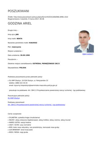POSZUKIWANI Źródło: http://www.poszukiwani.policja.pl/pos/form/r41019,GODZINA-ARIEL.html Wygenerowano: Czwartek, 9 marca 2017, 00:36 GODZINA ARIEL Drugie imię: Imię ojca: JAN Imię matki: BEATA Nazwisko panieńskie matki: KUŁDOSZ Płeć: mężczyzna Miejsce urodzenia: Data urodzenia: 28.09.1990 Zgłoś osobę!!! Pseudonim: Ostatnie miejsce zameldowania: OSTRÓDA, PIENIĘŻZNEGO 28C/5 Obywatelstwo: POLSKA Podstawa poszukiwania przez jednostki policji ● OL KMP Olsztyn, 10-526 Olsztyn, ul. Partyzantów 23 telefon: (089) 522 34 24 email: [email protected] poszukuje na podstawie: Art. 284 § 2 Przywłaszczenie powierzonej rzeczy ruchomej - typ podstawowy Poszukujące jednostki policji: OL KWP Olsztyn Podstawy poszukiwań: Art. 284 § 2 Przywłaszczenie powierzonej rzeczy ruchomej - typ podstawowy Cechy rysopisowe ● SYLWETKA: sylwetka krępa (muskularna) ● WŁOSY: włosy skręcone (kędzierzawe), włosy krótkie, włosy ciemne, włosy brunet ● WARGI (USTA): wargi średnie ● USZY / UCHO: uszy normalne ● NOS: kolor nosa naturalny, nos prostolinijny, koniuszek nosa gruby ● ŁUK BRWIOWY: brwi krzaczaste ● NOGI / NOGA: nogi grube ● OCZY / OKO: oczy normalnie osadzone ● CZOŁO: czoło średnie ● PALCE / PALEC: palce rąk grube ● TWARZ: cera śniada, twarz okrągła, wąsy piastowskie Wzrost: 181-185 CM Kolor oczu: CIEMNE Tweetnij