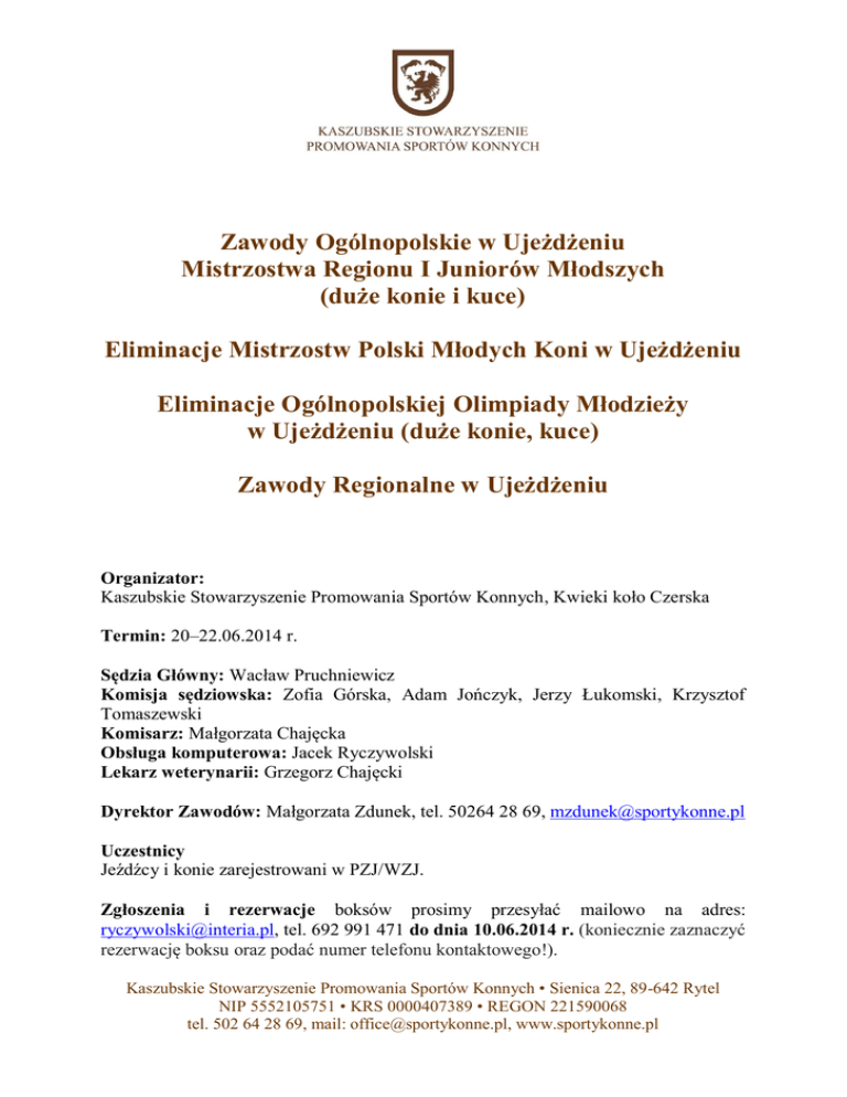 Zawody Ogólnopolskie w Ujeżdżeniu Mistrzostwa Regionu I Juniorów Młodszych (duże konie i kuce) Eliminacje Mistrzostw Polski Młodych Koni w Ujeżdżeniu Eliminacje Ogólnopolskiej Olimpiady Młodzieży w Ujeżdżeniu (duże konie, kuce) Zawody Regionalne w Ujeżdżeniu Organizator: Kaszubskie Stowarzyszenie Promowania Sportów Konnych, Kwieki koło Czerska Termin: 20–22.06.2014 r. Sędzia Główny: Wacław Pruchniewicz Komisja sędziowska: Zofia Górska, Adam Jończyk, Jerzy Łukomski, Krzysztof Tomaszewski Komisarz: Małgorzata Chajęcka Obsługa komputerowa: Jacek Ryczywolski Lekarz weterynarii: Grzegorz Chajęcki Dyrektor Zawodów: Małgorzata Zdunek, tel. 50264 28 69, [email protected] Uczestnicy Jeźdźcy i konie zarejestrowani w PZJ/WZJ. Zgłoszenia i rezerwacje boksów prosimy przesyłać mailowo na adres: [email protected], tel. 692 991 471 do dnia 10.06.2014 r. (koniecznie zaznaczyć rezerwację boksu oraz podać numer telefonu kontaktowego!). Kaszubskie Stowarzyszenie Promowania Sportów Konnych • Sienica 22, 89-642 Rytel NIP 5552105751 • KRS 0000407389 • REGON 221590068 tel. 502 64 28 69, mail: [email protected], www.sportykonne.pl Wpłata tytułem: imię i nazwisko zawodnika, imię i płeć konia, data przyjazdu. Ostateczny termin zgłoszeń: 10.06.2014 r. Wpłaty prosimy dokonywać na konto: PKO BP S.A 10 1020 1491 0000 4602 0070 4932 Warunkiem przyjęcie rezerwacji jest przedpłata na ww. konto w wysokości 250 zł do dnia 10.06.2014 r. Warunki techniczne Plac konkursowy o wymiarach 20x60m, dla kucy 20x40m, podłoże kwarcowe. Dwie rozprężalnie: pierwsza – podłoże kwarcowe 20x40m, druga – podłoże piaszczyste 20x60m. PROGRAM ZAWODÓW RUNDA PIĄTEK 20.06.14 I-ZR II-ZR III –ZR IV-ZO V-ZO VI-ZO VII-ZO VIII IX L-1 P-1 N-6 C-3 CC-1 CC-4 CS-1 Kwalif. 4–letnie Kwalif. 5–letnie Kwalif. 6–letnie — X XI SOBOTA, 21.06.14 L-2 P-2 N-7 C-4 CC-2 CC-7 CS-2 Kwalif. 4–letnie Kwalif. 5–letnie Kwalif. 6–letnie Eliminacje OOM NIEDZIELA 22.06.14 L-3 P-3 N-9 C-6 CC-6 CC-8 CS-5 — — — Eliminacje OOM Runda IV – Runda Juniorska Otwarta Runda V – Runda Młodzieżowa Otwarta Program eliminacji OOM Sobota: Niedziela: I półfinał konie: P-1, kuce P -10R II półfinał konie: P-4, kuce P-7 konie: P-9, kuce: P-8 Kaszubskie Stowarzyszenie Promowania Sportów Konnych • Sienica 22, 89-642 Rytel NIP 5552105751 • KRS 0000407389 • REGON 221590068 tel. 502 64 28 69, mail: [email protected], www.sportykonne.pl NAGRODY PULA NAGRÓD FINANSOWYCH 12 350 zł W rundach puchary dla zwycięzców, flots dla 25% najlepszych par oraz nagrody finansowe i rzeczowe. W Mistrzostwach Regionu 1 Juniorów Młodszych – nagrody rzeczowe, puchary, flots. Eliminacje MPMK – puchary dla najlepszego konia z każdego dnia eliminacji oraz flots dla wszystkich zakwalifikowanych par. Nagrody finansowe Runda L: nagrody rzeczowe Runda P: nagrody rzeczowe Runda N: I – 400 zł, II – 250 zł , III – 200 zł, IV – 150 zł, V – 100 zł, VI – 50 zł Runda C (Runda Juniorska Otwarta): I – 500 zł, II – 300 zł, III – 250 zł, IV – 200 zł, V – 150 zł, VI – 100 zł Runda CC (Runda Młodzieżowa Otwarta): I – 600 zł, II – 400 zł, III – 300 zł, IV – 250 zł, V – 200 zł, VI – 150 zł Runda CC(Mała Runda): I – 700 zł, II – 600 zł, III – 500 zł, IV – 400 zł, V – 300 zł, VI – 200 zł Runda CS: I – 1100 zł, II – 1000 zł, III – 900 zł, IV – 800 zł, V – 700 zł, VI – 600 zł Zgodnie z przepisami Polskiego Związku Jeździeckiego minimalna liczba nagród w każdej klasie musi opierać się na zasadzie – jedna nagroda na czterech zawodników. W przypadku, gdy liczba startujących jest niewielka organizator posłuży się kluczem: Liczba startujących 1–4 5–8 9–12 13–16 17–20 21-24 Liczba nagród 1 2 3 4 5 6 Kaszubskie Stowarzyszenie Promowania Sportów Konnych • Sienica 22, 89-642 Rytel NIP 5552105751 • KRS 0000407389 • REGON 221590068 tel. 502 64 28 69, mail: [email protected], www.sportykonne.pl WARUNKI OGÓLNE Przepisy Ogólne PZJ (edycja 2014) Regulamin Weterynaryjny PZJ (edycja 2010) Przepisy antydopingowe i kontroli leczenia koni PZJ (edycja 2010) Przepisy Dyscypliny Ujeżdżenia (edycja 2014) Regulamin Rozgrywania Krajowych Zawodów Jeździeckich w Ujeżdżeniu (edycja 2014) Eliminacje Mistrzostw Polski Młodych Koni rozgrywane będą zgodnie z Regulaminem Mistrzostw Polski Młodych Koni na rok 2014 i sędziowane wg zasad obowiązujących na MPMK.) Regulamin OOM (2014) Dokumentacja Klubów, zawodników, koni – zgodna z przepisami PZJ OPŁATY Starty i boksy Boks (stajnia namiotowa): 250 zł Eliminacje MPMK – 180 zł (4 starty) .Pojedynczy start: 60 zł Eliminacje OOM – 200 zł. Koszty opłaty eliminacyjnej za zawodników województwa pomorskiego ponosi Pomorski ZJ. Zawodnicy startujący w el. OOM mogą nieodpłatnie wystartować w jednym dowolnie wybranym konkursie w piątek (dla kucy konkurs P-10R). Runda L, P, N – 180 zł za jedną rundę, druga runda dla konia – 70 zł. Pojedynczy start w konkursie – 70 zł. Runda C, CC, CS – 190 zł. Pojedynczy start w konkursie – 100 zł. Opłata antydopingowa – 15 zł (tylko zawody ogólnopolskie). Podłączenie do prądu – koniowozy 150 zł za czas trwania zawodów, – busy 75 zł za czas trwania zawodów. Każda zmiana na liście startowej po jej wydrukowaniu opłata 50 zł. Zamawiający boks zobowiązany jest do zapłaty również w przypadku niewykorzystania boksu, chyba że rezygnacja nastąpiła przed upływem terminu zgłoszeń. Boksy dostępne będą od 19.06.20 r., godz.10:00. Możliwy przyjazd dzień wcześniej (dodatkowy koszt – 50 zł). Kaszubskie Stowarzyszenie Promowania Sportów Konnych • Sienica 22, 89-642 Rytel NIP 5552105751 • KRS 0000407389 • REGON 221590068 tel. 502 64 28 69, mail: [email protected], www.sportykonne.pl Organizator zapewnia pierwszą ściółkę w boksach (słoma). Istnieje możliwość kupienia na miej