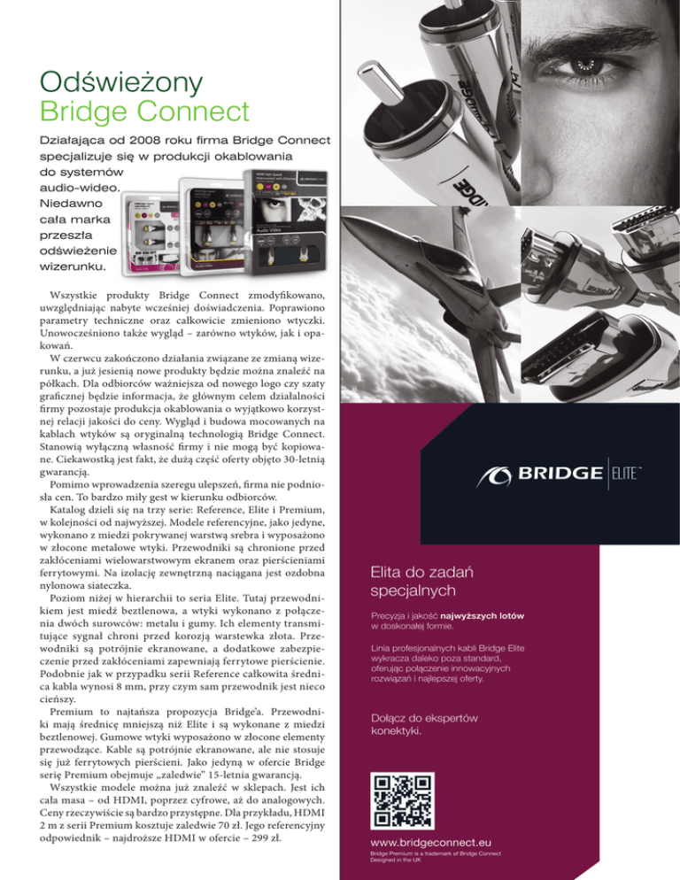 Nowości Odświeżony Bridge Connect Działająca od 2008 roku firma Bridge Connect specjalizuje się w produkcji okablowania do systemów audio-wideo. Niedawno cała marka przeszła odświeżenie wizerunku. Wszystkie produkty Bridge Connect zmodyfikowano, uwzględniając nabyte wcześniej doświadczenia. Poprawiono parametry techniczne oraz całkowicie zmieniono wtyczki. Unowocześniono także wygląd – zarówno wtyków, jak i opakowań. W czerwcu zakończono działania związane ze zmianą wizerunku, a już jesienią nowe produkty będzie można znaleźć na półkach. Dla odbiorców ważniejsza od nowego logo czy szaty graficznej będzie informacja, że głównym celem działalności firmy pozostaje produkcja okablowania o wyjątkowo korzystnej relacji jakości do ceny. Wygląd i budowa mocowanych na kablach wtyków są oryginalną technologią Bridge Connect. Stanowią wyłączną własność firmy i nie mogą być kopiowane. Ciekawostką jest fakt, że dużą część oferty objęto 30-letnią gwarancją. Pomimo wprowadzenia szeregu ulepszeń, firma nie podniosła cen. To bardzo miły gest w kierunku odbiorców. Katalog dzieli się na trzy serie: Reference, Elite i Premium, w kolejności od najwyższej. Modele referencyjne, jako jedyne, wykonano z miedzi pokrywanej warstwą srebra i wyposażono w złocone metalowe wtyki. Przewodniki są chronione przed zakłóceniami wielowarstwowym ekranem oraz pierścieniami ferrytowymi. Na izolację zewnętrzną naciągana jest ozdobna nylonowa siateczka. Poziom niżej w hierarchii to seria Elite. Tutaj przewodnikiem jest miedź beztlenowa, a wtyki wykonano z połączenia dwóch surowców: metalu i gumy. Ich elementy transmitujące sygnał chroni przed korozją warstewka złota. Przewodniki są potrójnie ekranowane, a dodatkowe zabezpieczenie przed zakłóceniami zapewniają ferrytowe pierścienie. Podobnie jak w przypadku serii Reference całkowita średnica kabla wynosi 8 mm, przy czym sam przewodnik jest nieco cieńszy. Premium to najtańsza propozycja Bridge’a. Przewodniki mają średnicę mniejszą niż Elite i są wykonane z miedzi beztlenowej. Gumowe wtyki wyposażono w złocone elementy przewodzące. Kable są potrójnie ekranowane, ale nie stosuje się już ferrytowych pierścieni. Jako jedyną w ofercie Bridge serię Premium obejmuje „zaledwie” 15-letnia gwarancją. Wszystkie modele można już znaleźć w sklepach. Jest ich cała masa – od HDMI, poprzez cyfrowe, aż do analogowych. Ceny rzeczywiście są bardzo przystępne. Dla przykładu, HDMI 2 m z serii Premium kosztuje zaledwie 70 zł. Jego referencyjny odpowiednik – najdroższe HDMI w ofercie – 299 zł. Hi•Fi i Muzyka 10/13 11